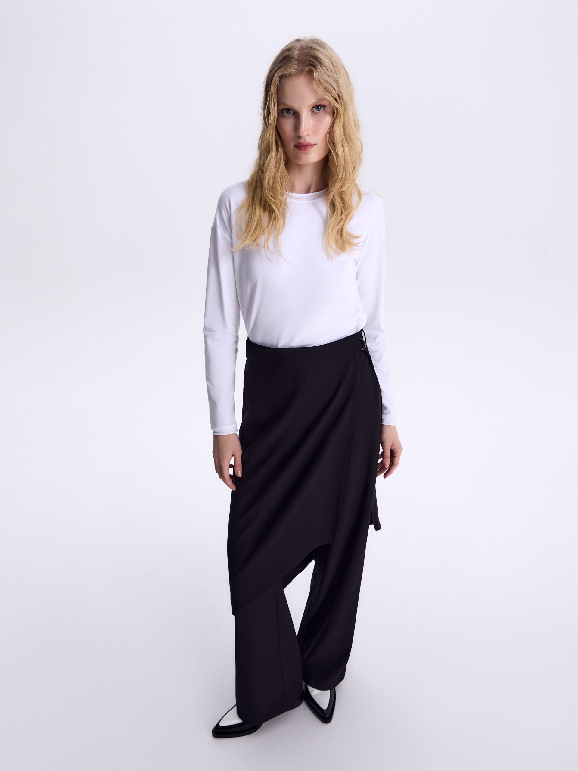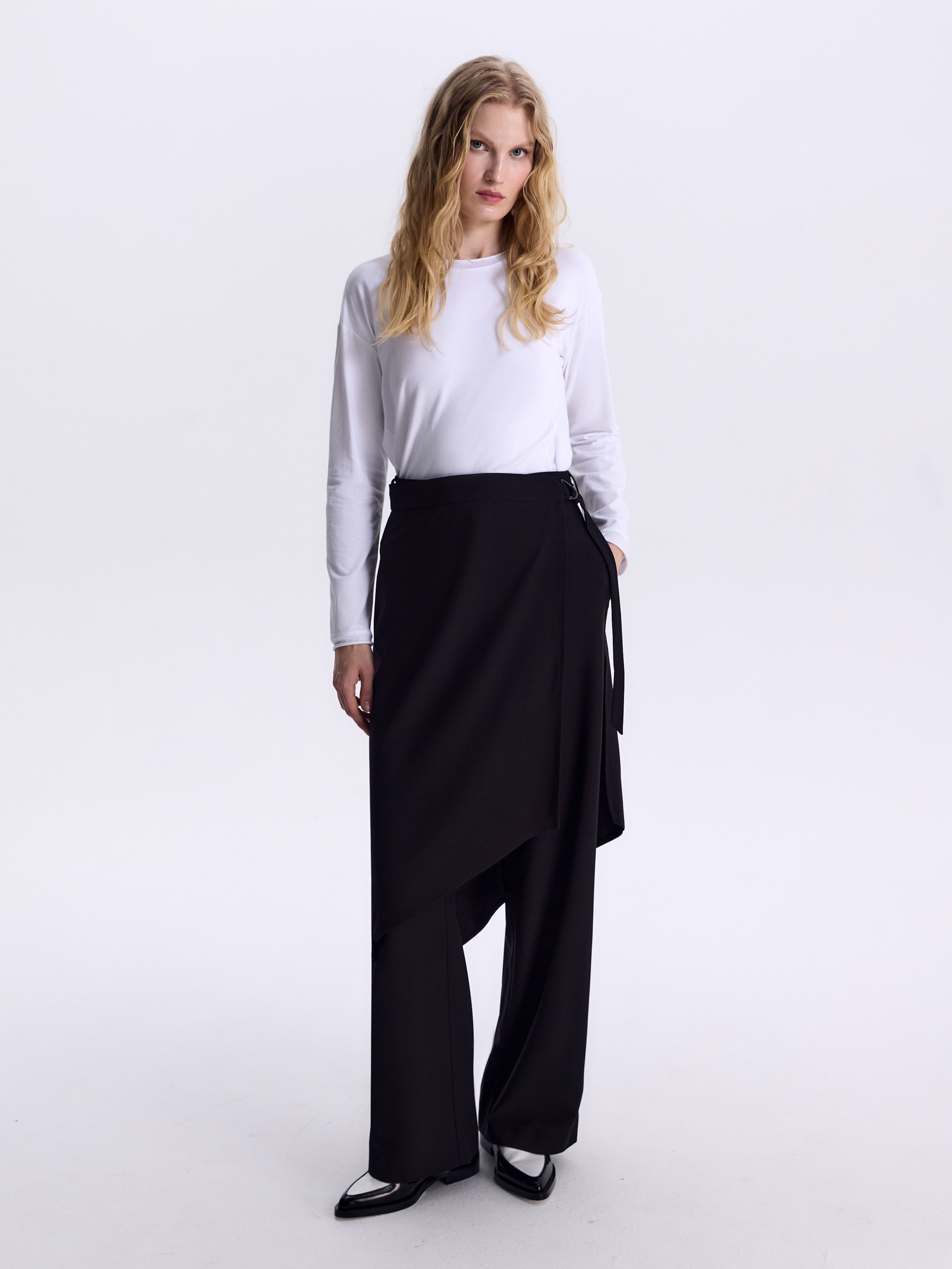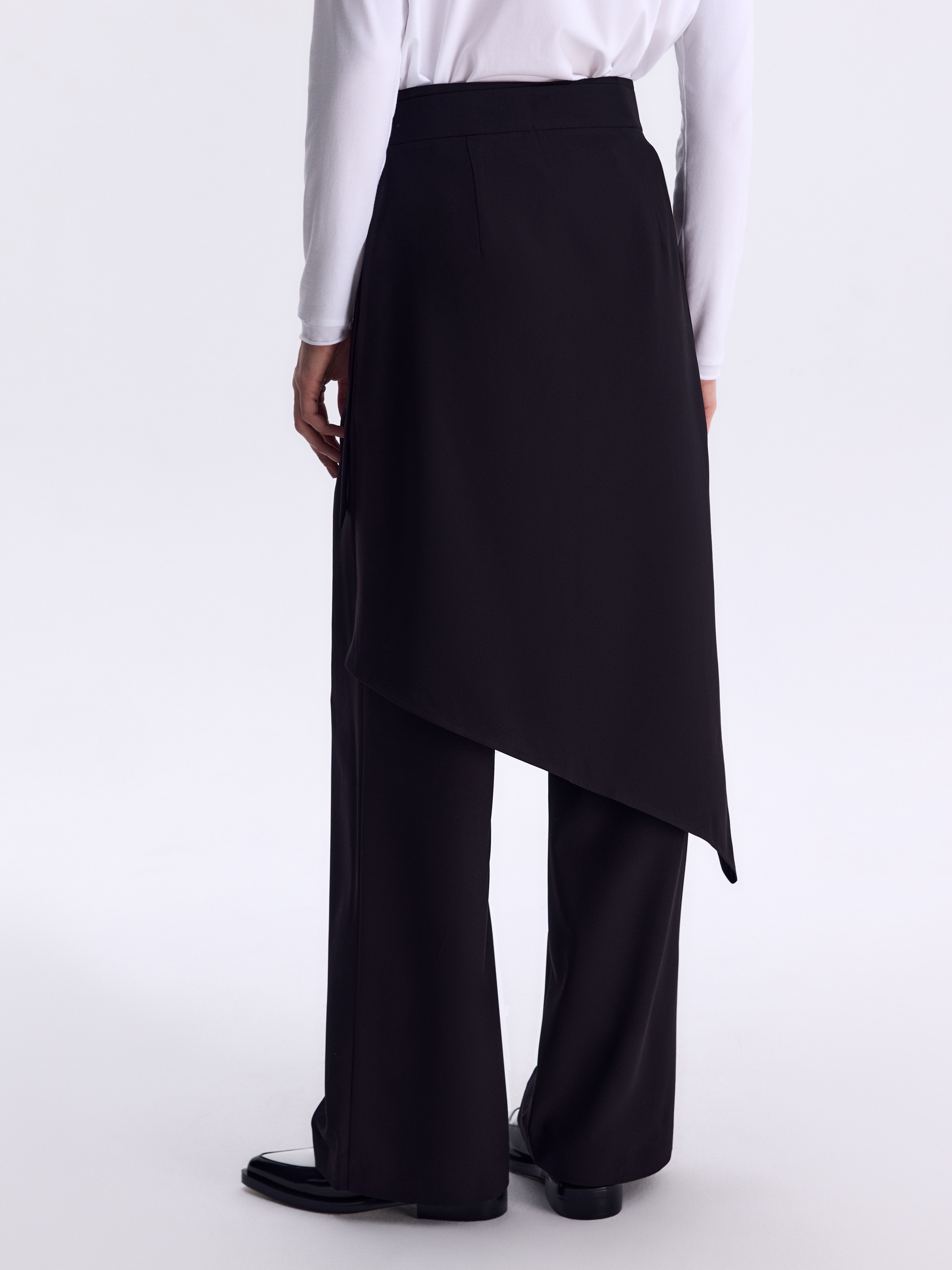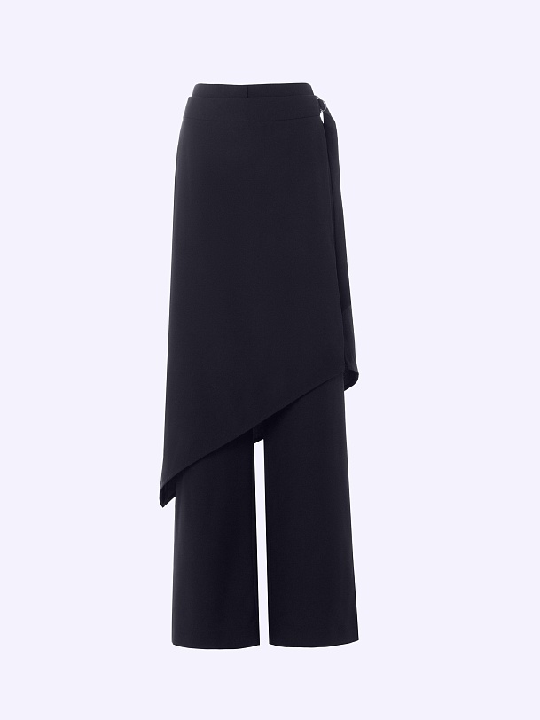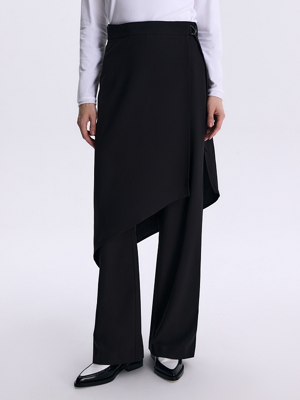 Взяли базу и задали ей новый ритм через форму и конструкцию: дополнили классические брюки асимметричной юбкой-баской. Модель выполнена из итальянского крепа, посадка баски регулируется с помощью пояса с полукольцом. Четкие формы, смелая асимметрия и свобода комбинаций задают острый, модный ритм. Баска структурирует образ, выводя «urban chic» на новый уровень.