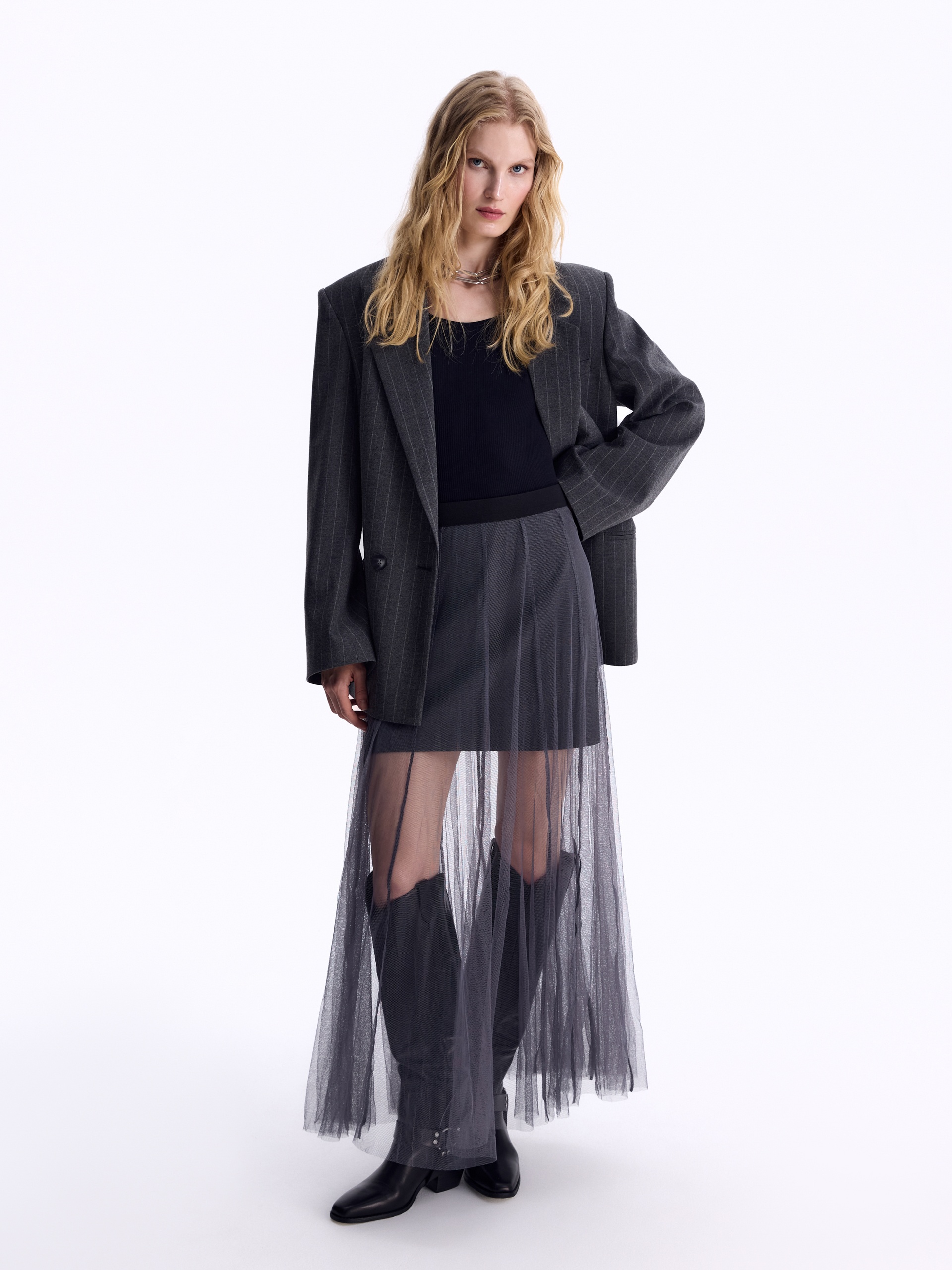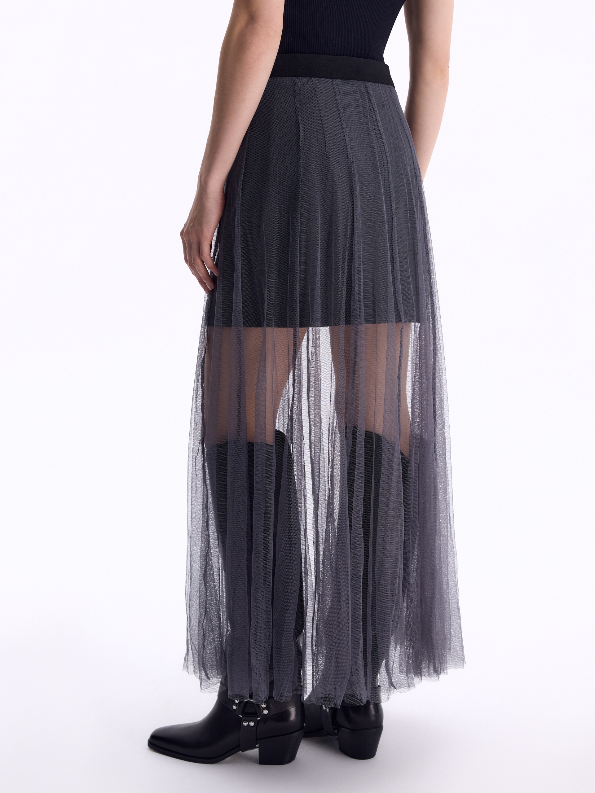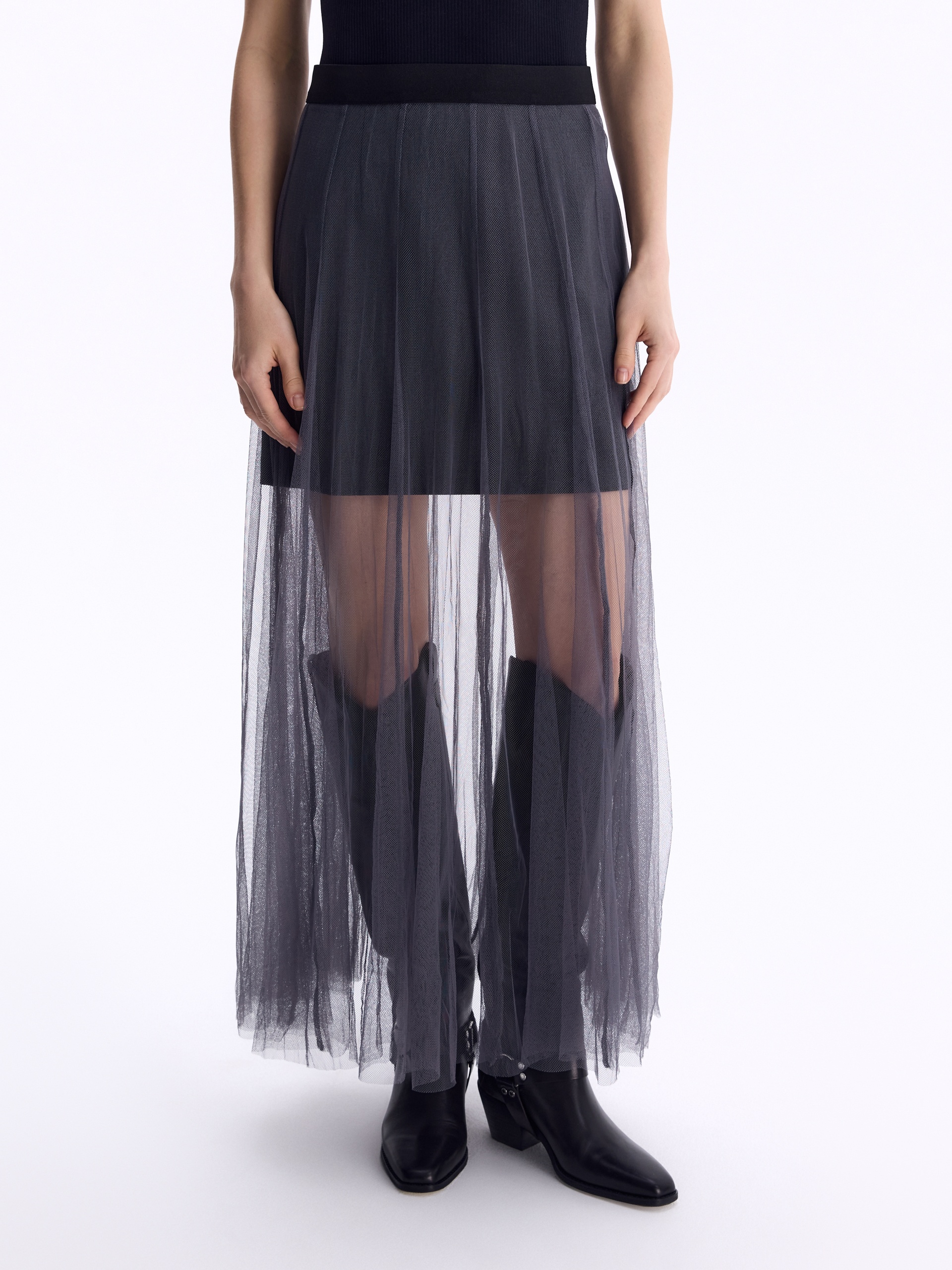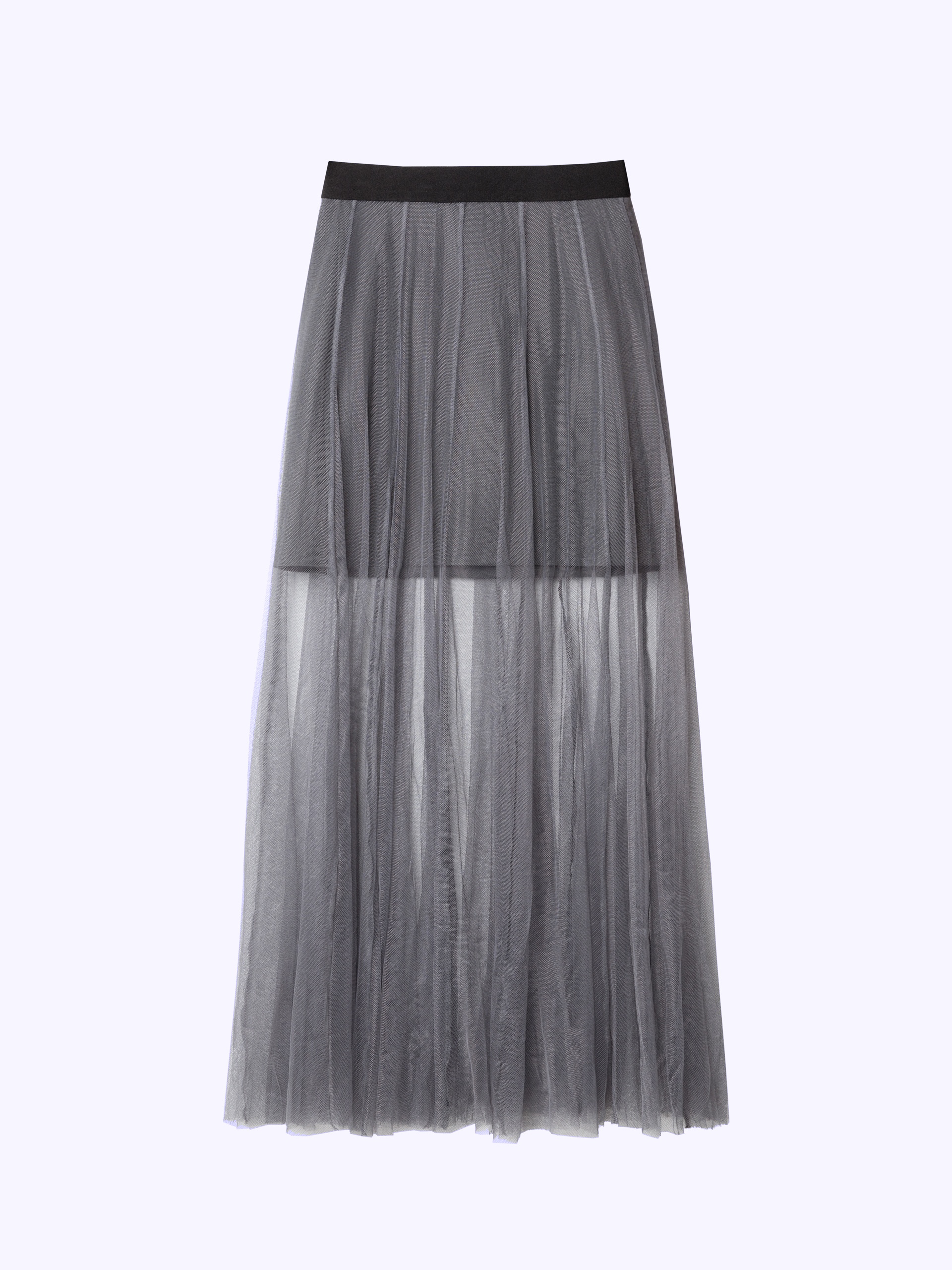 Расклешенная юбка из серой сетки на резинке с нижней мини юбкой из серой меланжевой костюмной ткани. Юбки можно носить друг с другом или по отдельности, а также сочетать с другими моделями одежды.