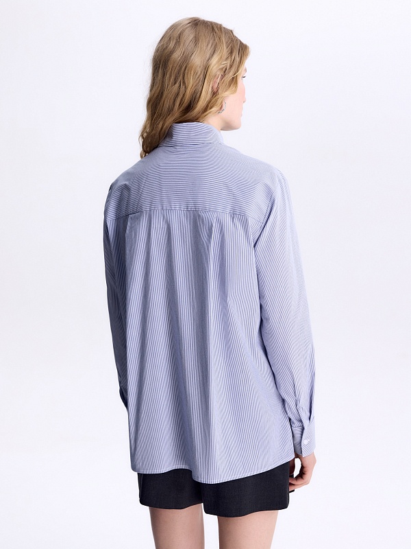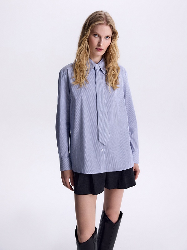 Прямая блуза в голубую полоску. Блуза имеет отложной воротник, расширенную линию плеча, втачной рукав, кокетку и складку на спинке. У блузки есть декоративный съемный галстук из той же ткани.
