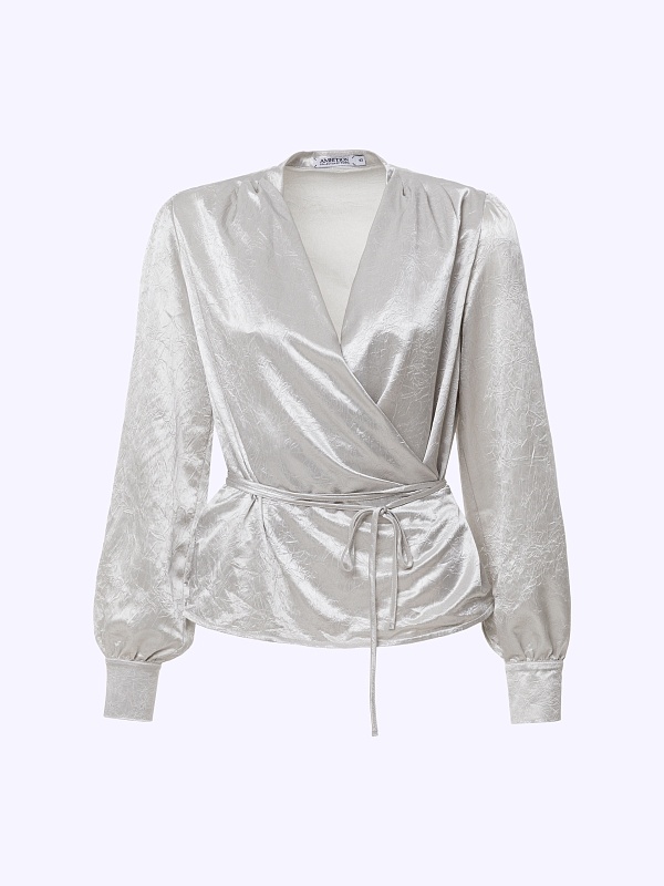 Блуза прямого силуэта из светло-серой жатой ткани. У блузы спереди иммитация запа́ха, создающий V-образный вырез, по плечевым швам заложены складки, красиво струящиеся по переду. Рукав втачной, свободный, со сборкой у манжеты. В боковых швах на талии тонкие шнурки-завязки.