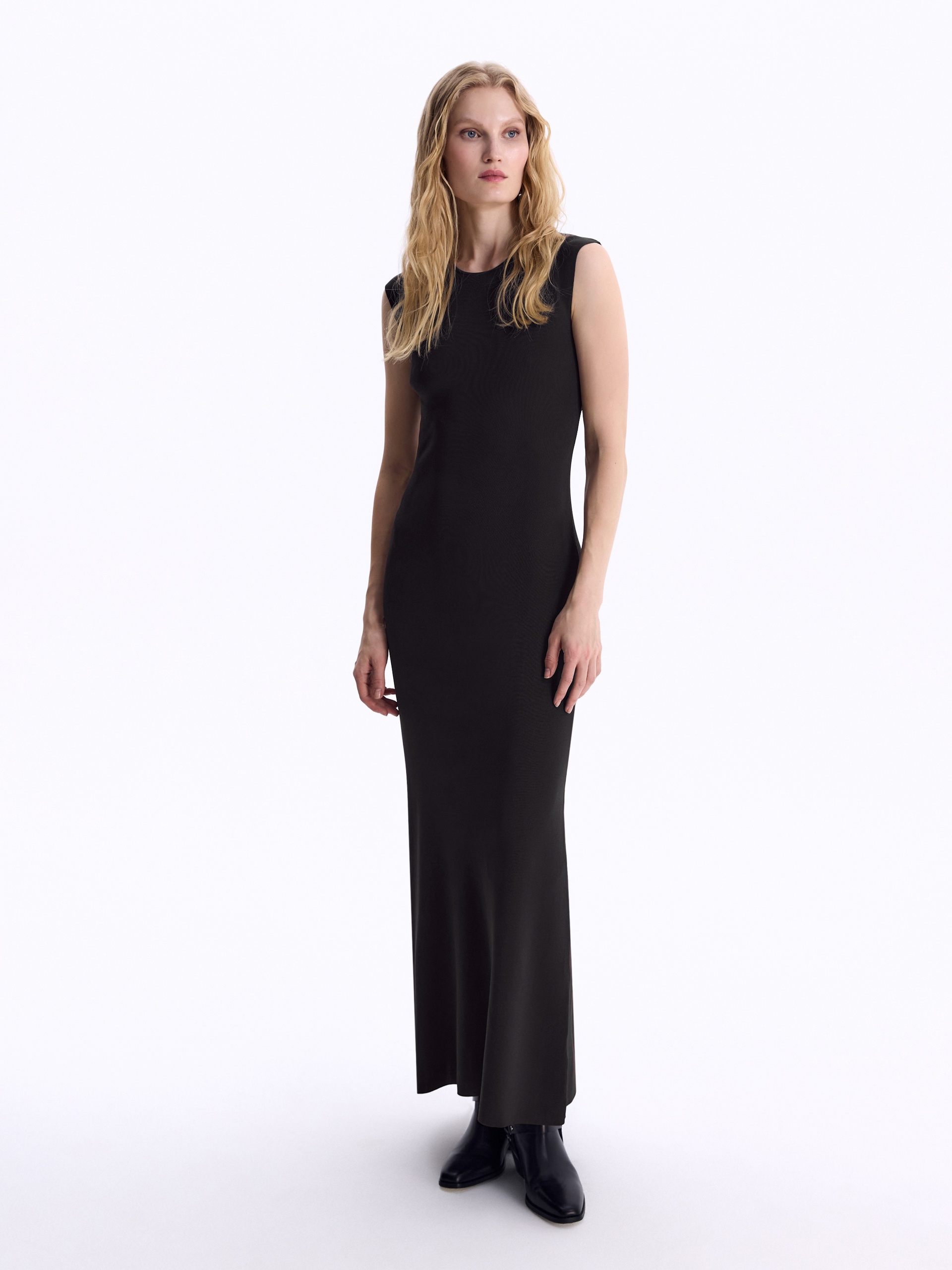 Минимум деталей – максимум впечатления. Вязаное платье из вискозы в черном цвете подчеркивает изгибы фигуры. Спереди – чистый минимализм, на спинке – соблазнительный вырез, приковывающий взгляды. Заключительный штрих – полоска на вырезе, скрывающая линию белья, чтобы сохранить максимально чистый силуэт и придать тебе уверенности.