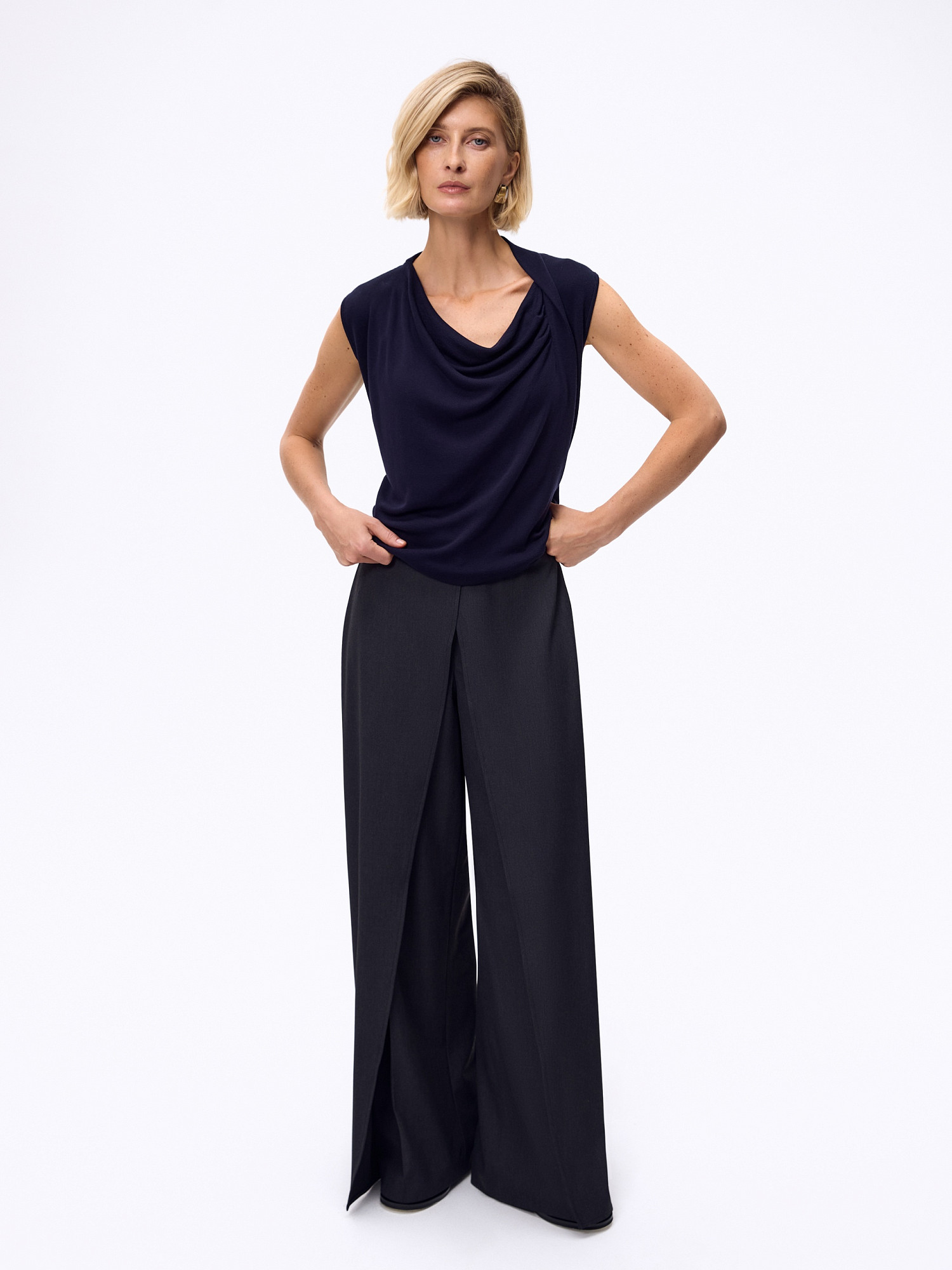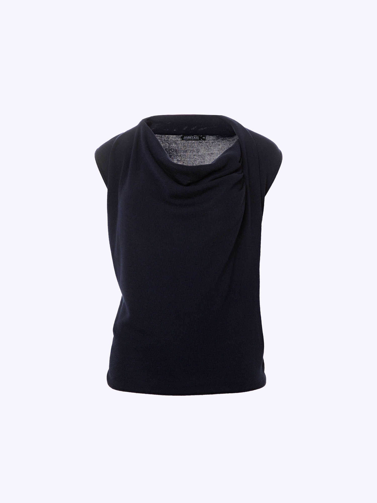 Вязаный топ с акцентной драпировкой на полочке актуального темно -синего цвета из лимитированной линейки AMBITION, выполнен из шелковистой пряжи с содержанием тенселя. Полуприлегающий силуэт, эффектный вырез горловины и оригинальные детали создают уникальный образ.