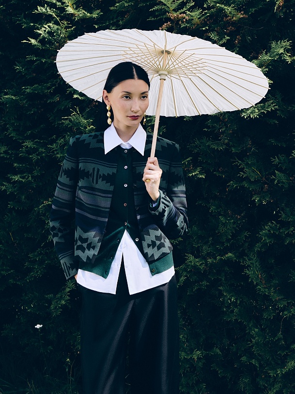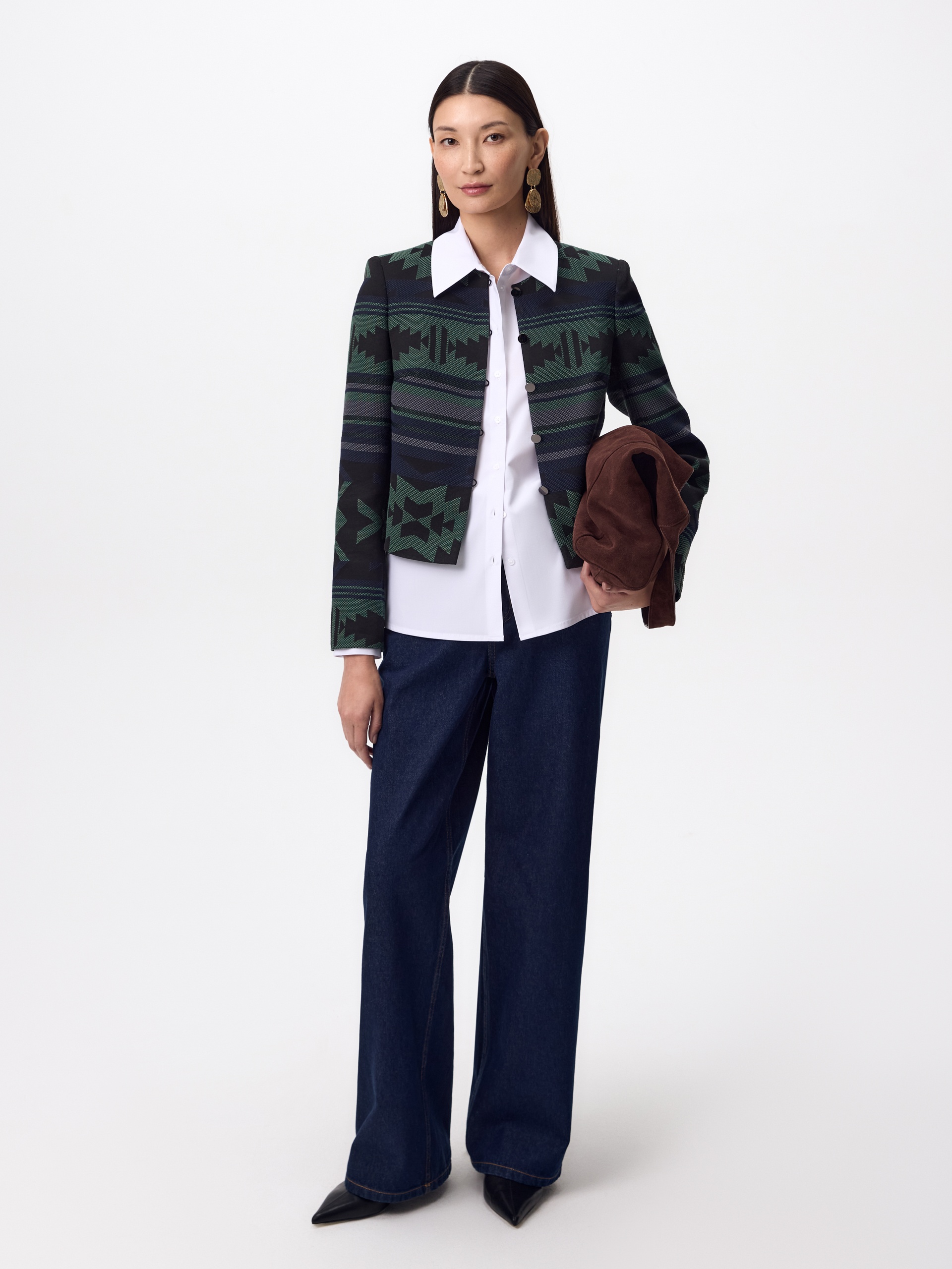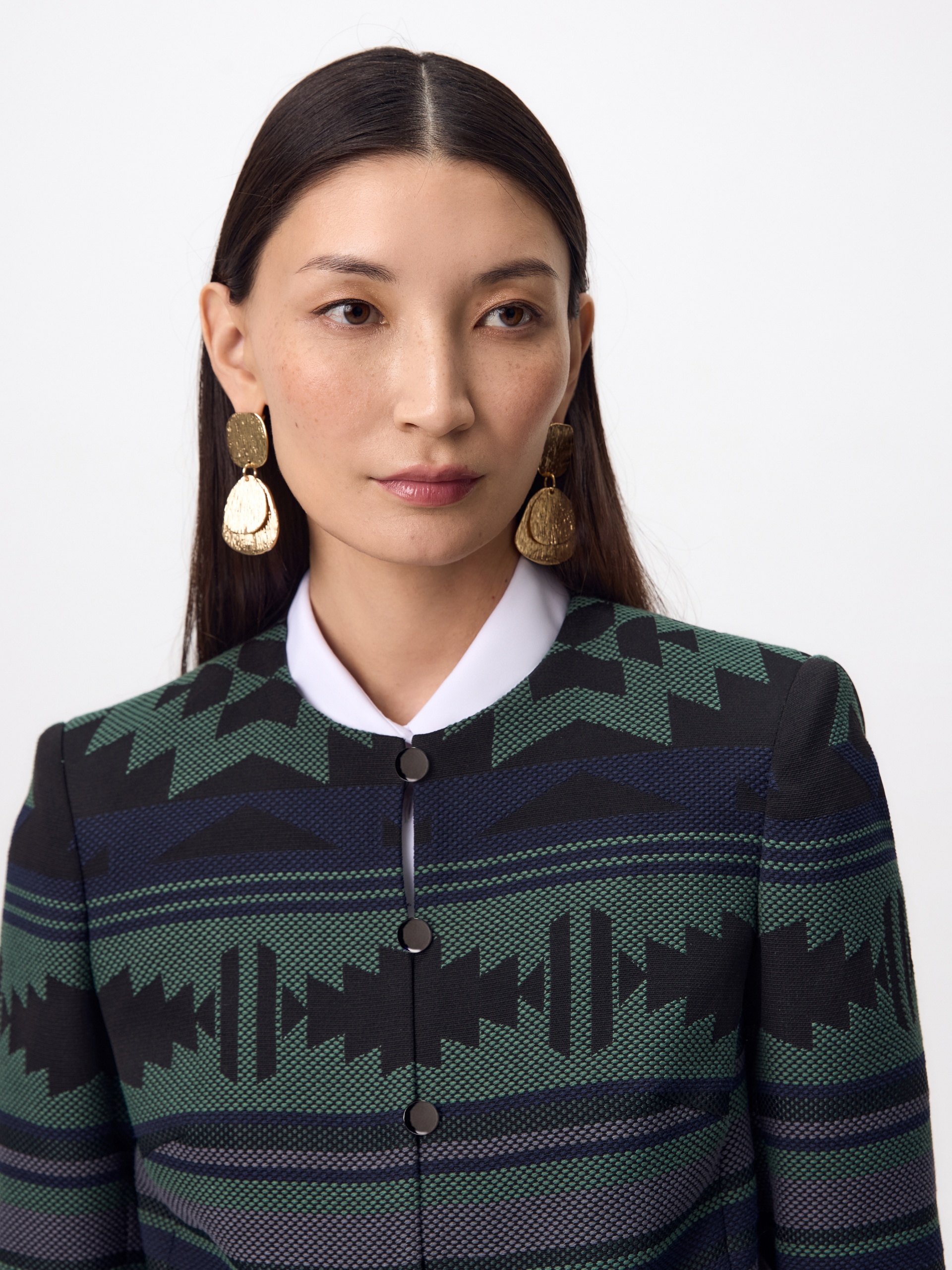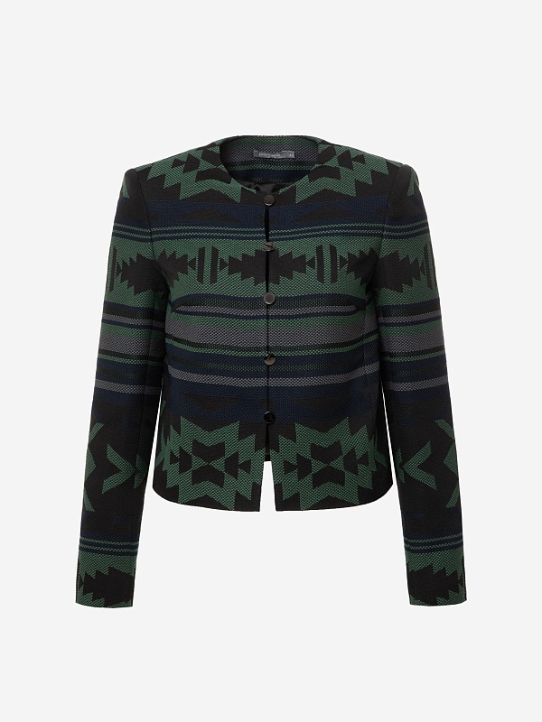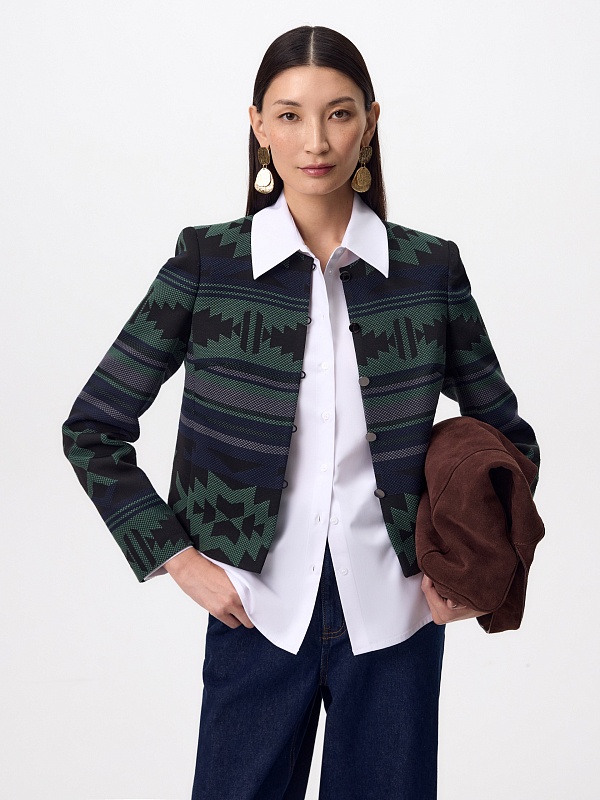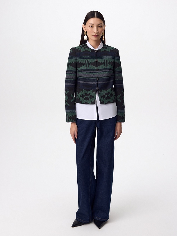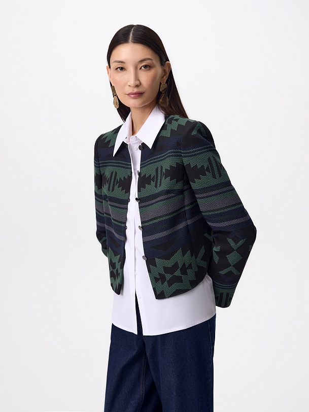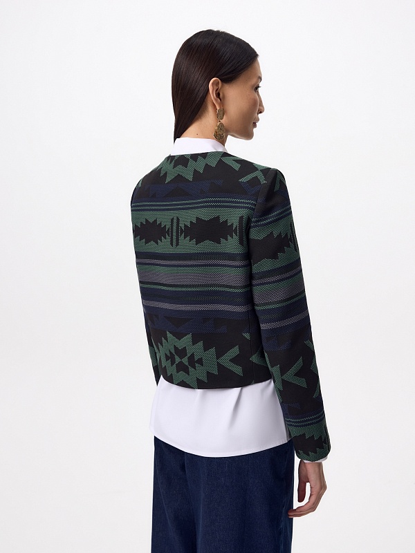Прямой укороченный жакет из жаккардовой ткани с геометричным узором, круглой горловиной и классическим втачным рукавом, потайные пуговицы по борту. Жакет на подкладке.