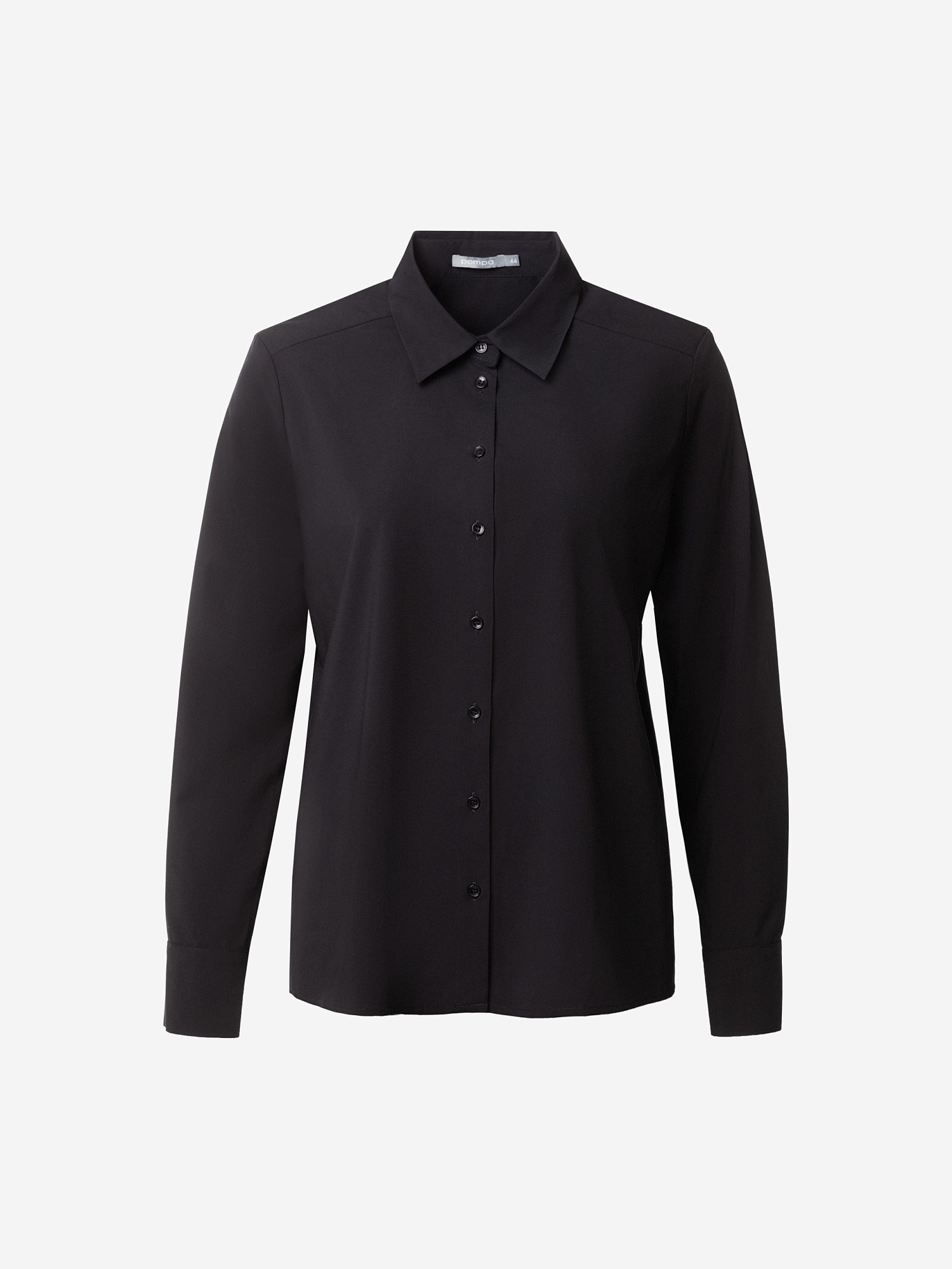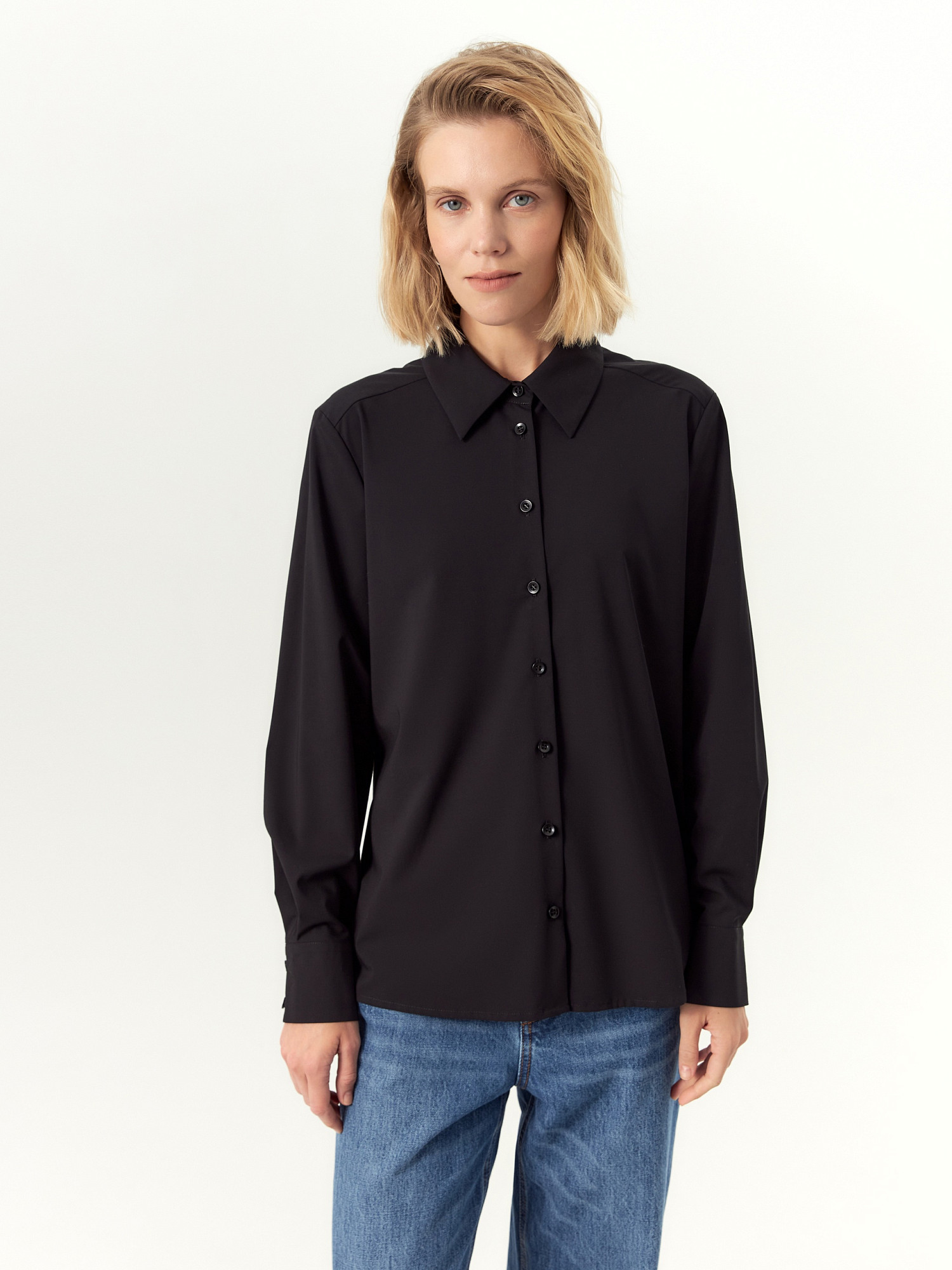 Приталенная блуза из смесовой хлопковой ткани в черном цвете с трендовым острым воротником. Блуза с классическим рукавом и широким манжетом.