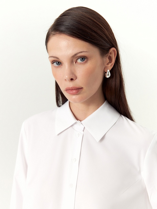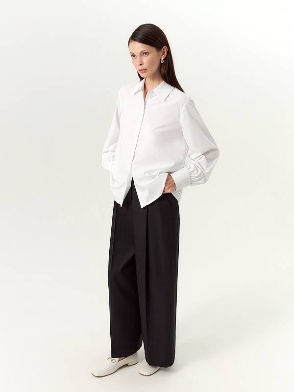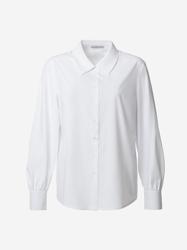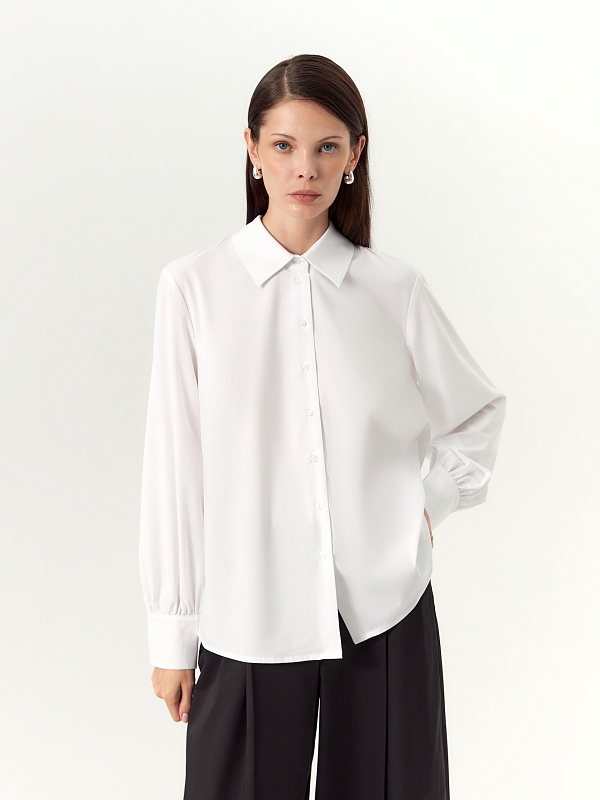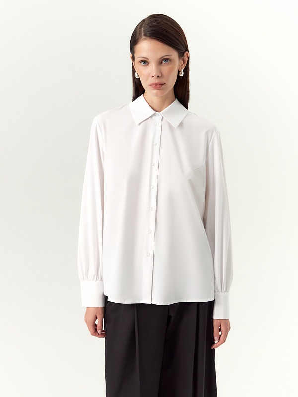 Свободная блуза из блузочной хлопковой ткани с отложным воротником и цельнокроеной планкой. Спущенное плечо, рукав с манжетом на 2-е пуговицы и сборкой по низу. На спинке кокетка со сборкой.