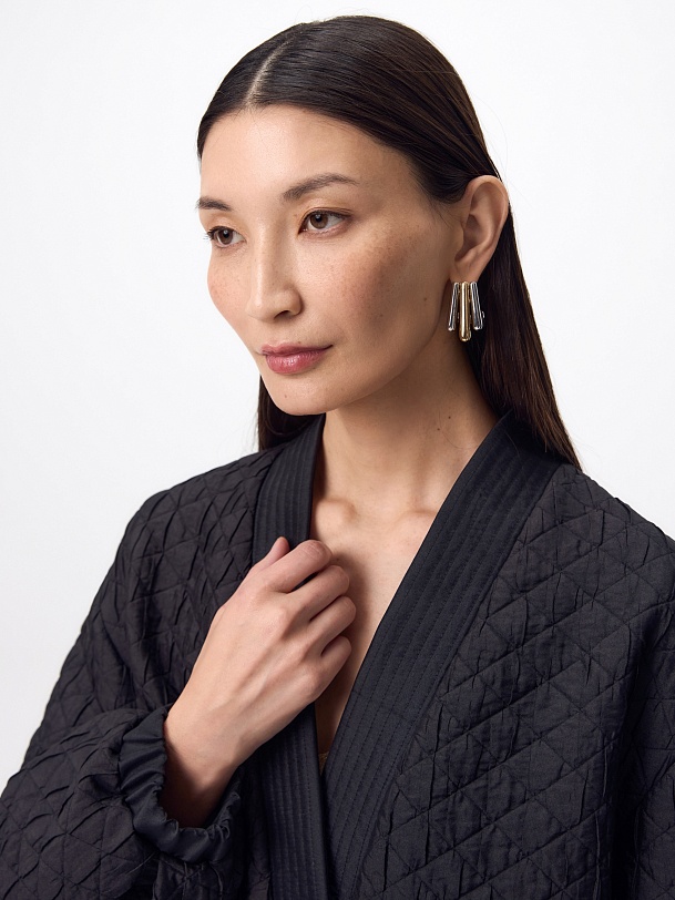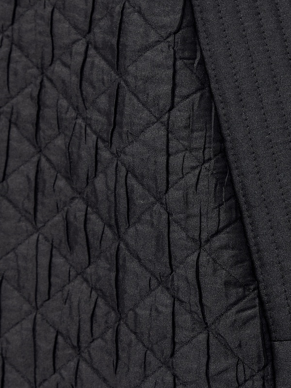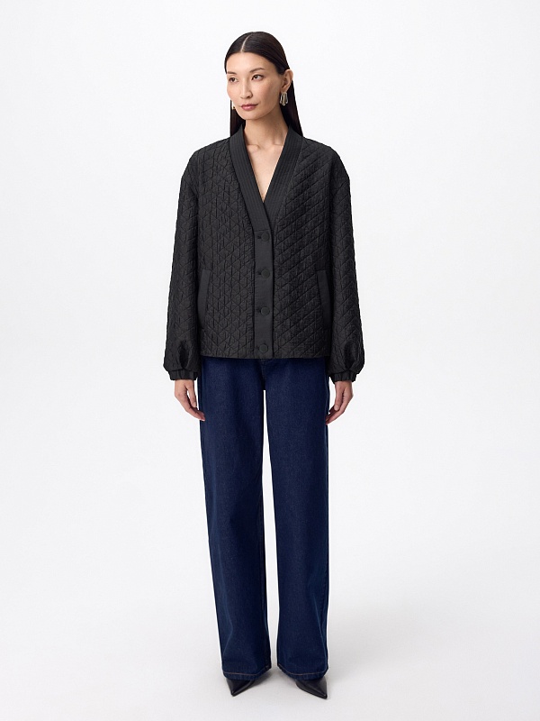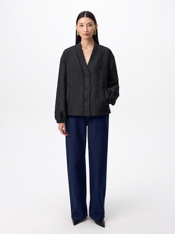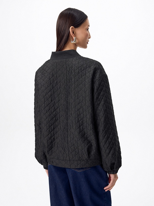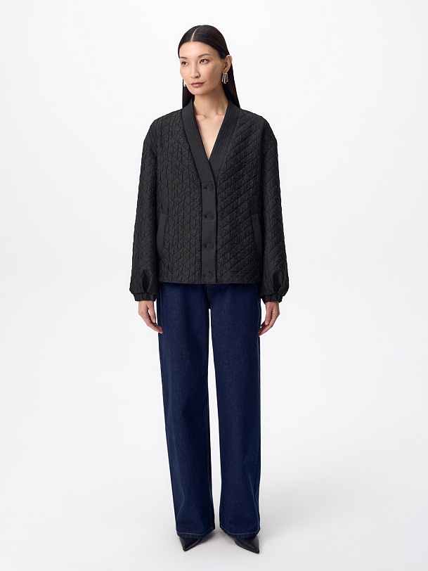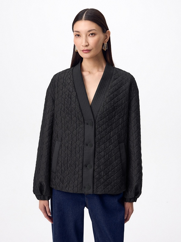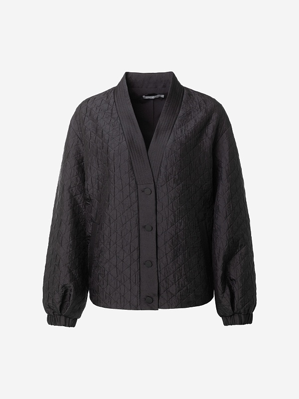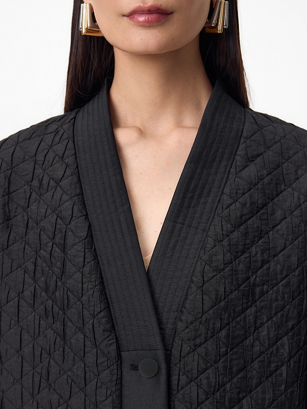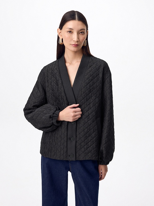 Объемный жакет из стеганной ткани черного цвета с широкой планкой на пуговицах и строчками. Плечо спущенное с объумным рукавом на манжете, на полочке прорезные карманы листочки из отделочной ткани. Жакет на подкладке.