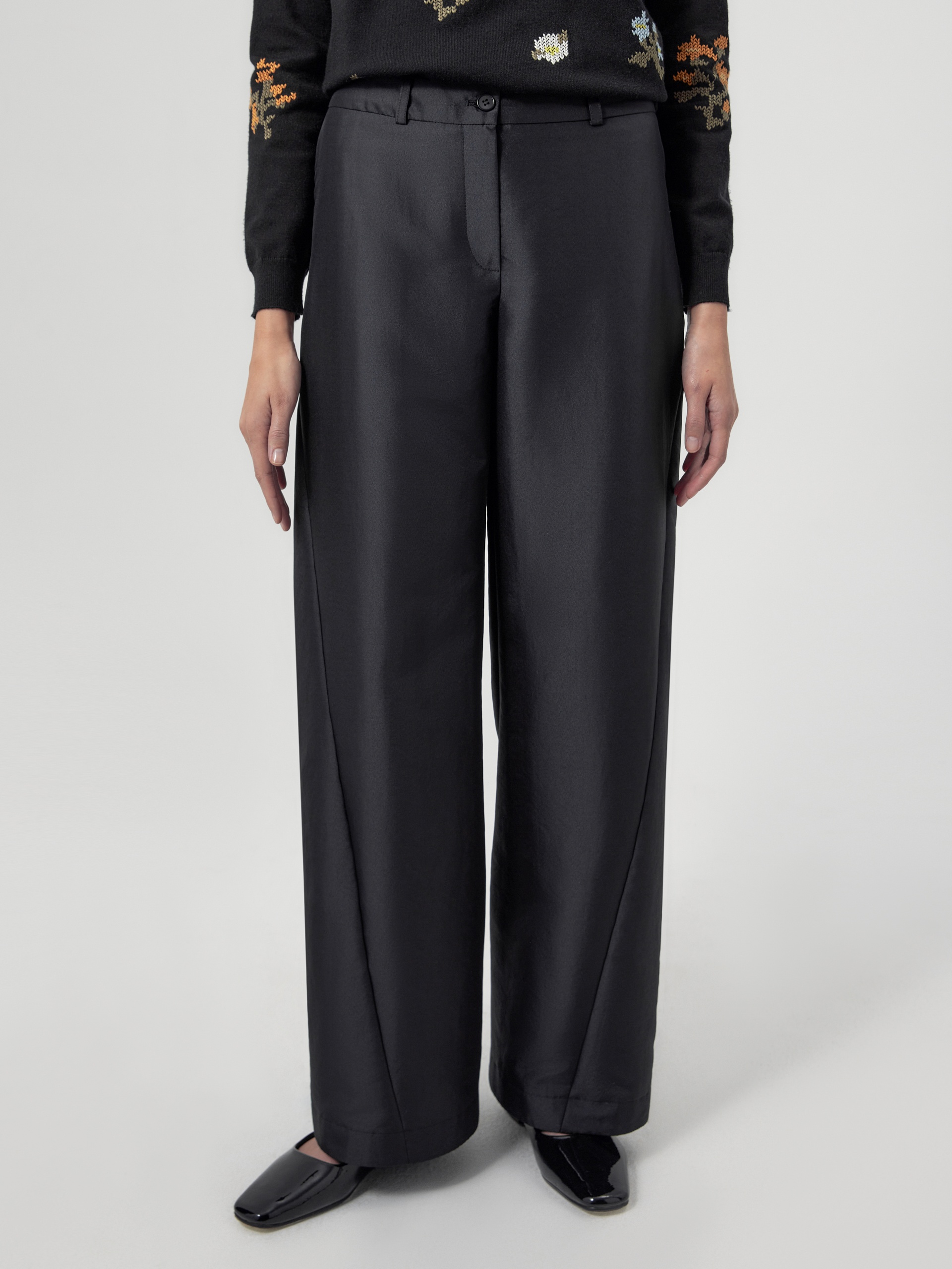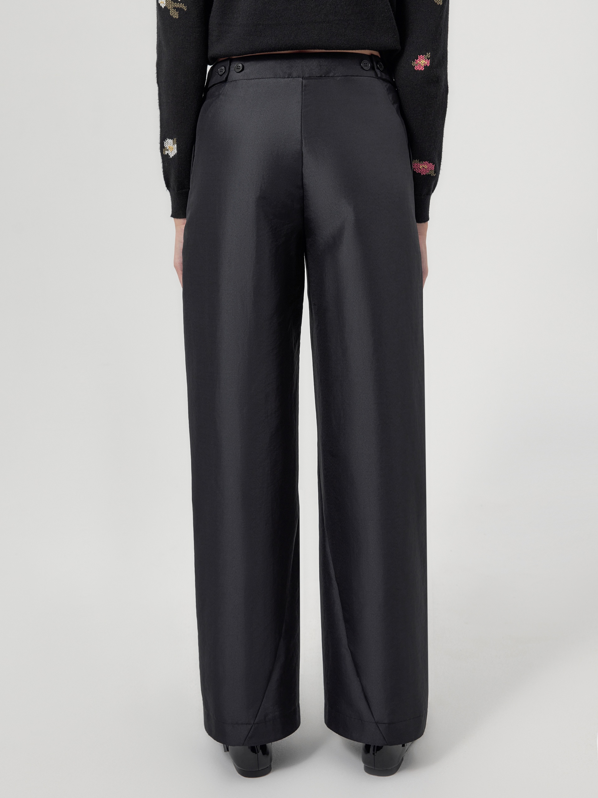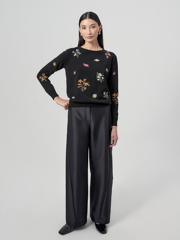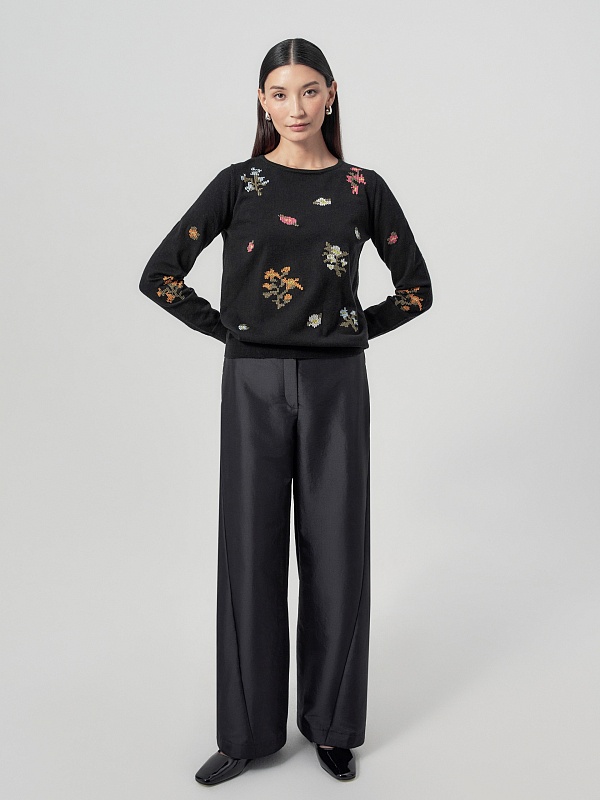 Широкие брюки из тонкой ткани черного цвета с прямым поясом и фигурными рельефами. В боковых швах расположены карманы.