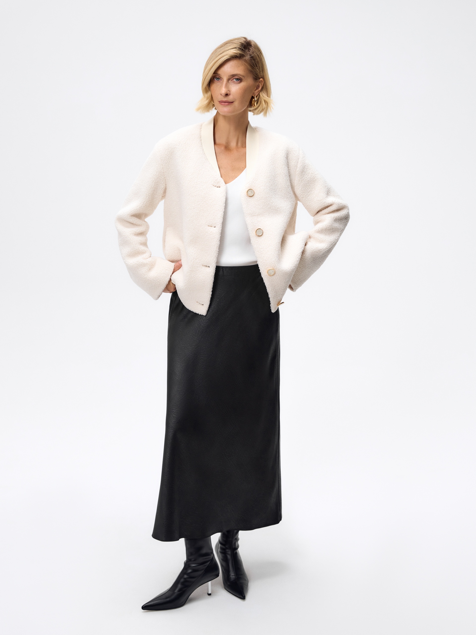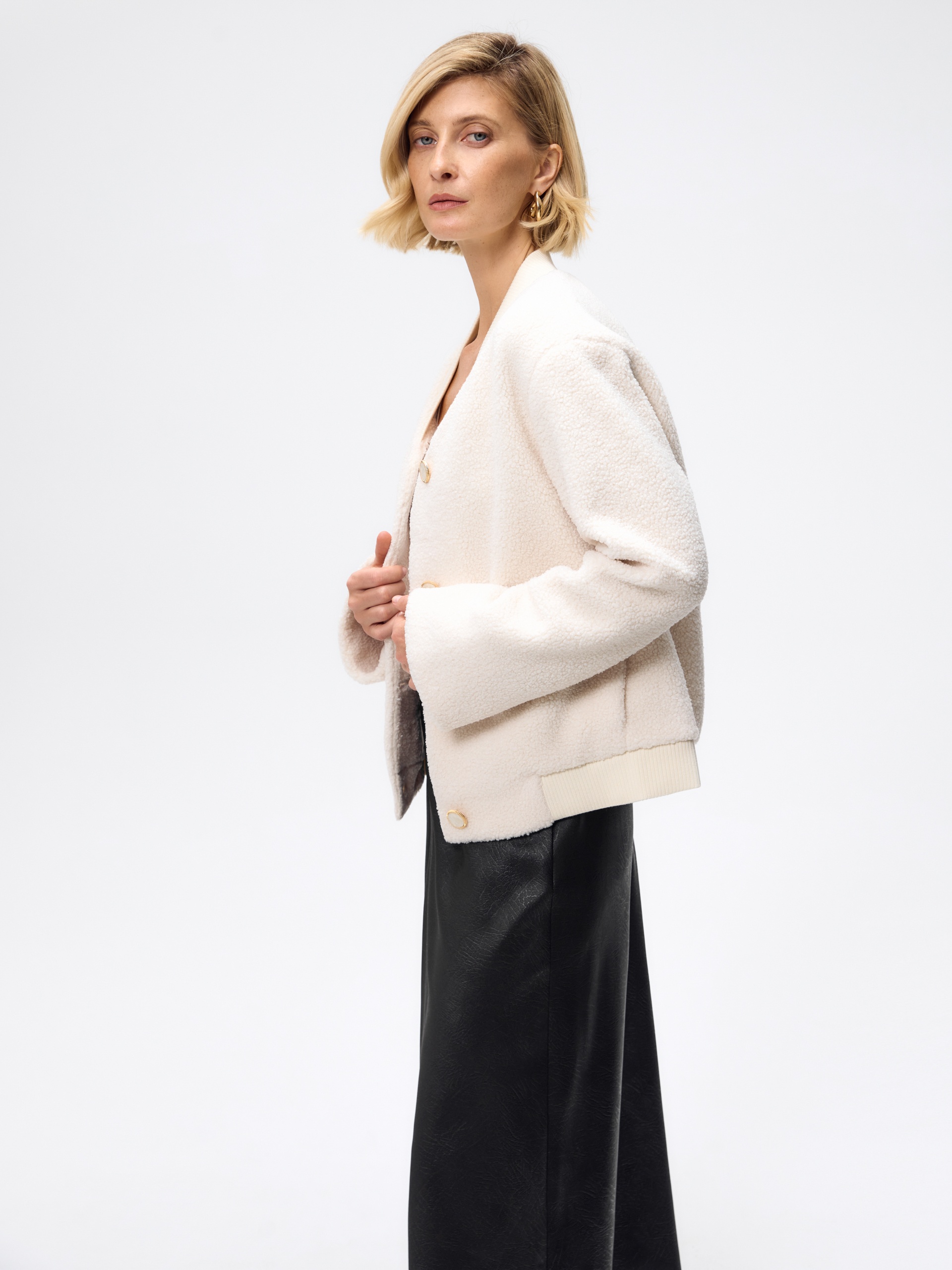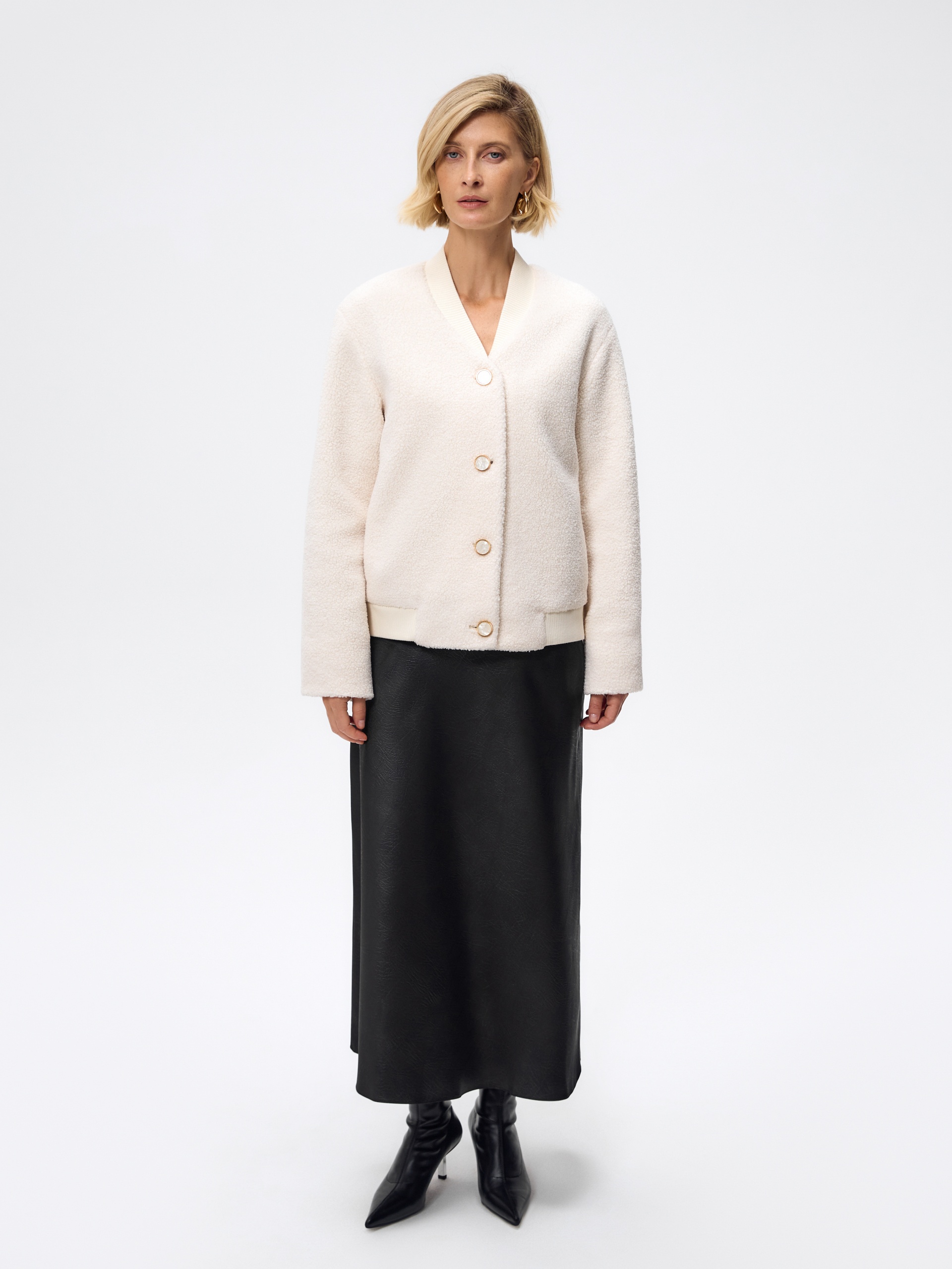 Трикотажный фактурный мягкий жакет с подвязами по горловине и по спинке. Рукав втачной со спущенной линией плеча и расширением к низу. Жакет на металлических пуговицах и на подкладке.