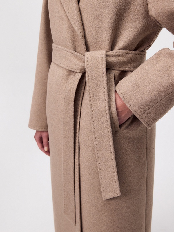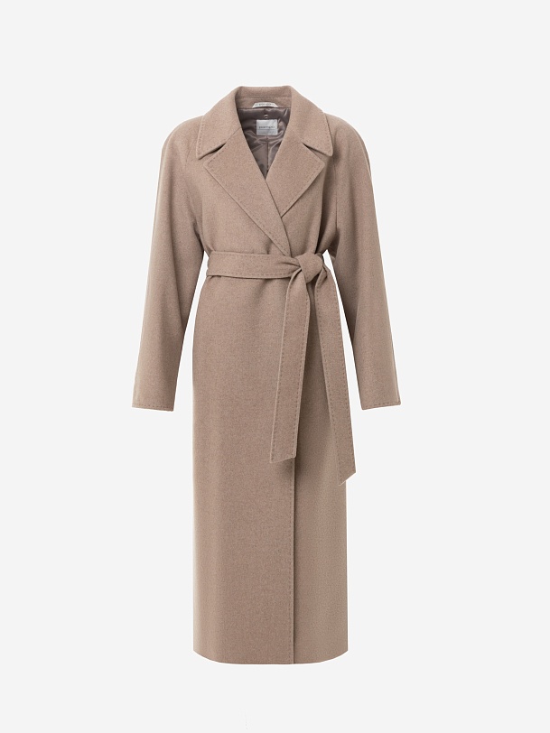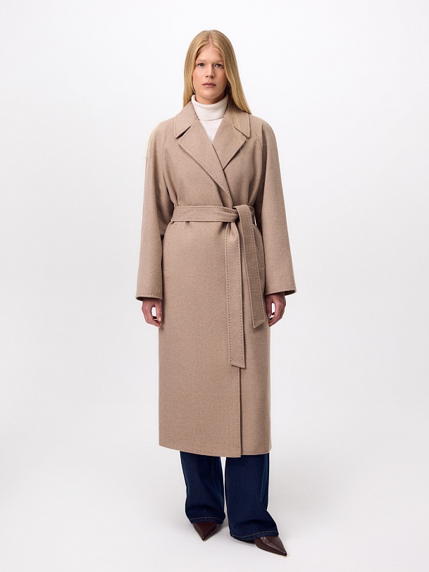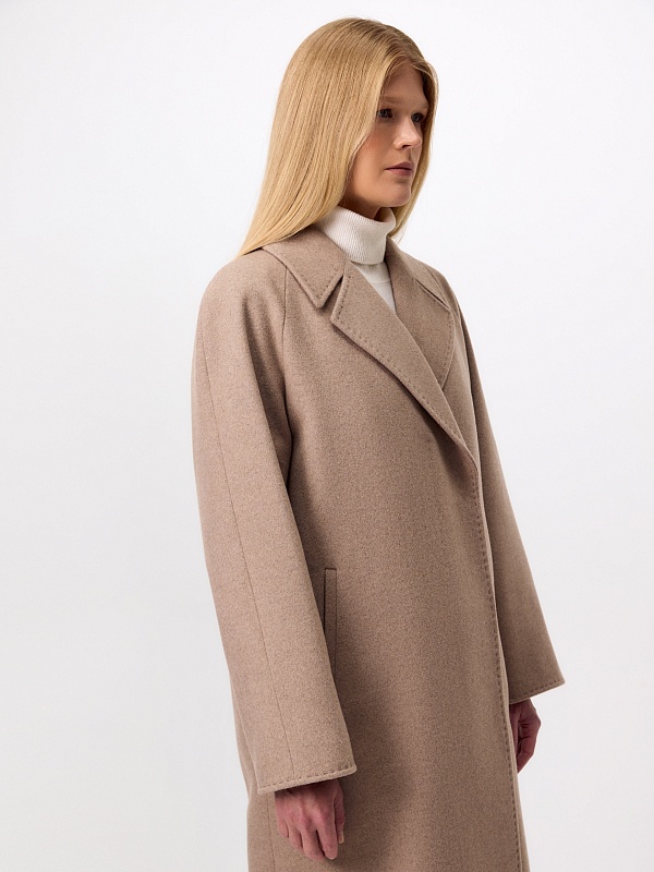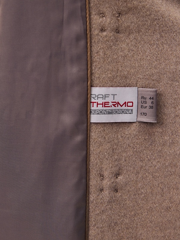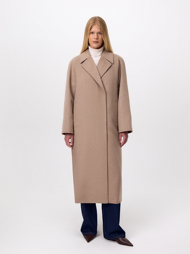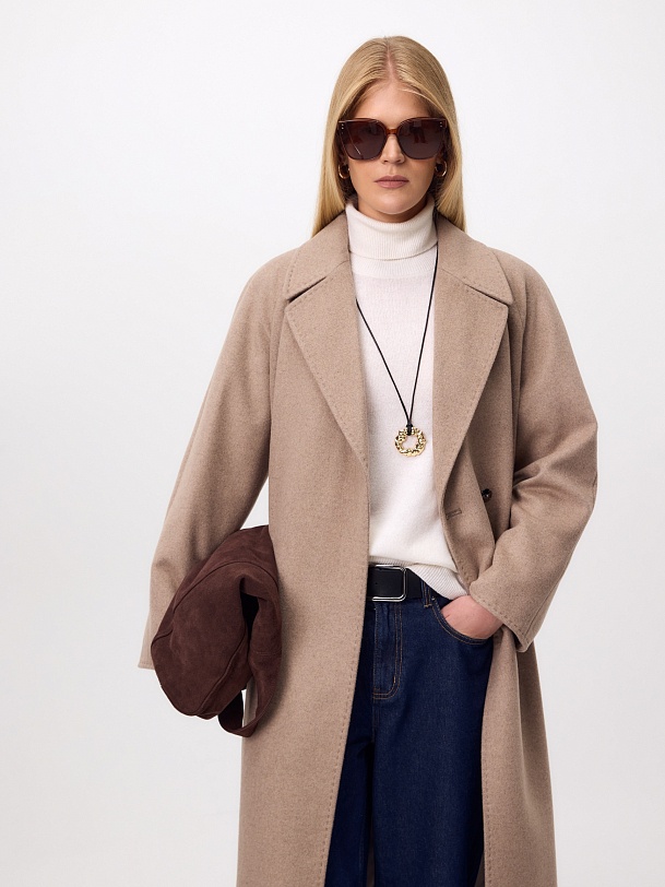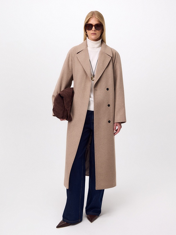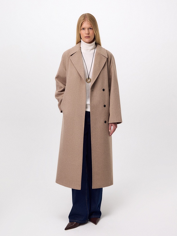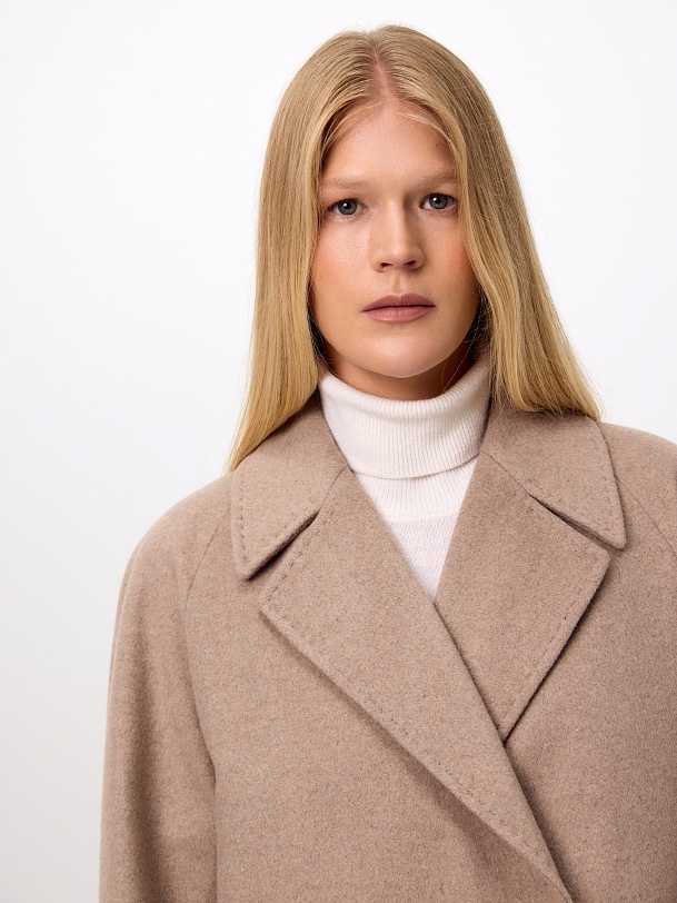 Двубортное пальто из ворсовой ткани с высоким содержанием натуральной шерсти в роскошном цвете капучино. Силуэт прямой, слегка зауженный к низу. Пальто имеет рукав-реглан, широкий английский воротник и застёжку на ряд надёжных пришивных кнопок. Образ дополняет пояс из основной ткани. В среднем шве спинки высокая шлица. А для наилучшей защиты от непогоды изделие выполнено с использованием высокотехнологичной мембраны RaftPro и инновационного утеплителя DuPont Sorona. Произведено в Санкт-Петербурге.