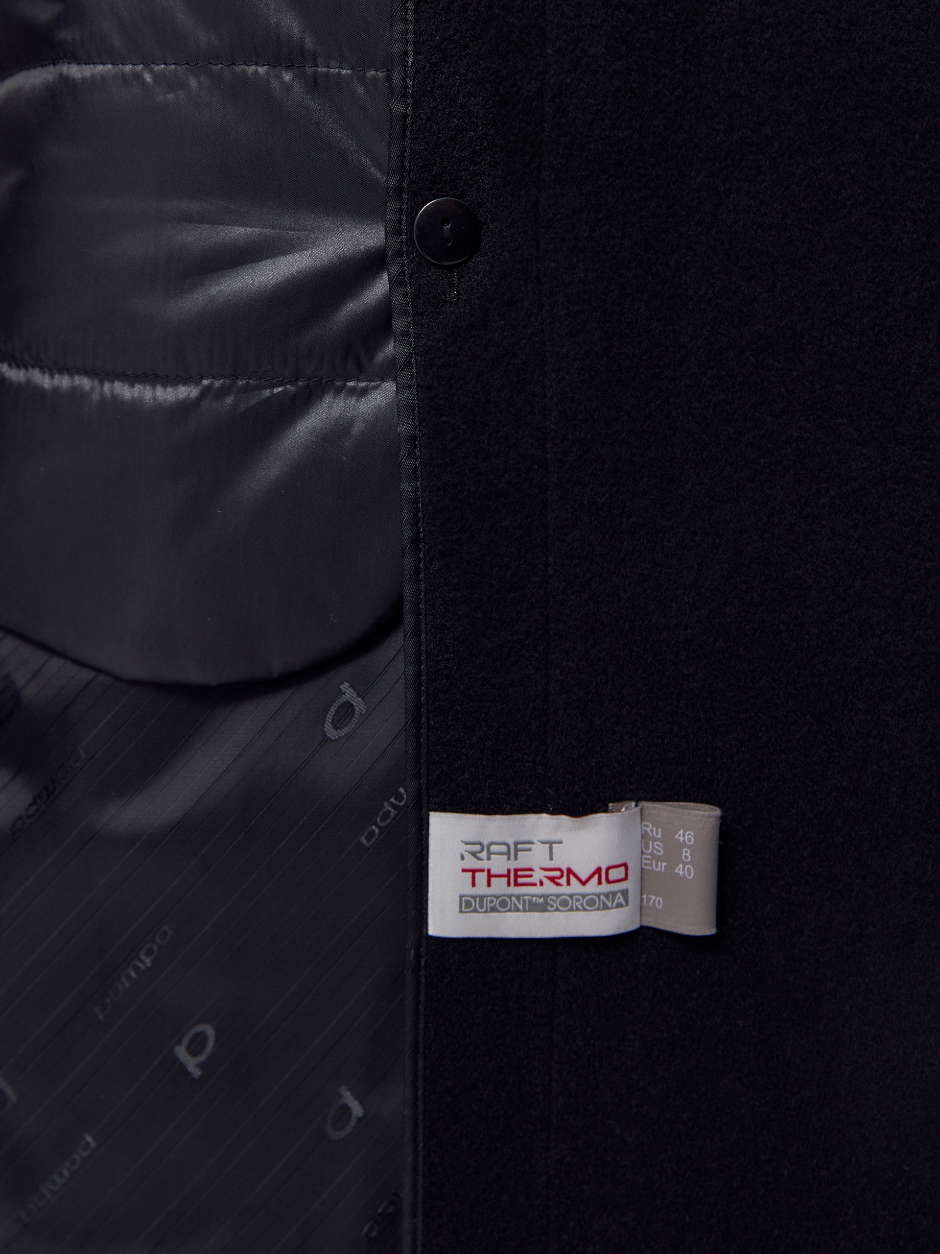 Must have этого сезона - пальто с подстёжкой классического чёрного цвета. Пальто двубортное из премиальной ворсовой ткани с содержанием натуральной шерсти 95%. Прямого силуэта, слегка заужено к низу, имеет втачной рукав и английский воротник с новой формой лацкана. По бокам расположены вместительные карманы с клапанами, на груди декоративная листочка. Застёгивается изделие на два ряда крупных пуговиц, по низу рукава выполнена застёжка на ряд пуговиц. В среднем шве спинки высокая шлица. В качестве дополнительного нижнего слоя в комплект к пальто предлагается съёмный жилет из стёганой плащевой ткани с водоотталкивающим покрытием, изготовленный с использованием инновационного утеплителя DuPont Sorona. А для наилучшей защиты от непогоды пальто выполнено с высокотехнологичной мембраной RaftPro. Произведено в Санкт-Петербурге.