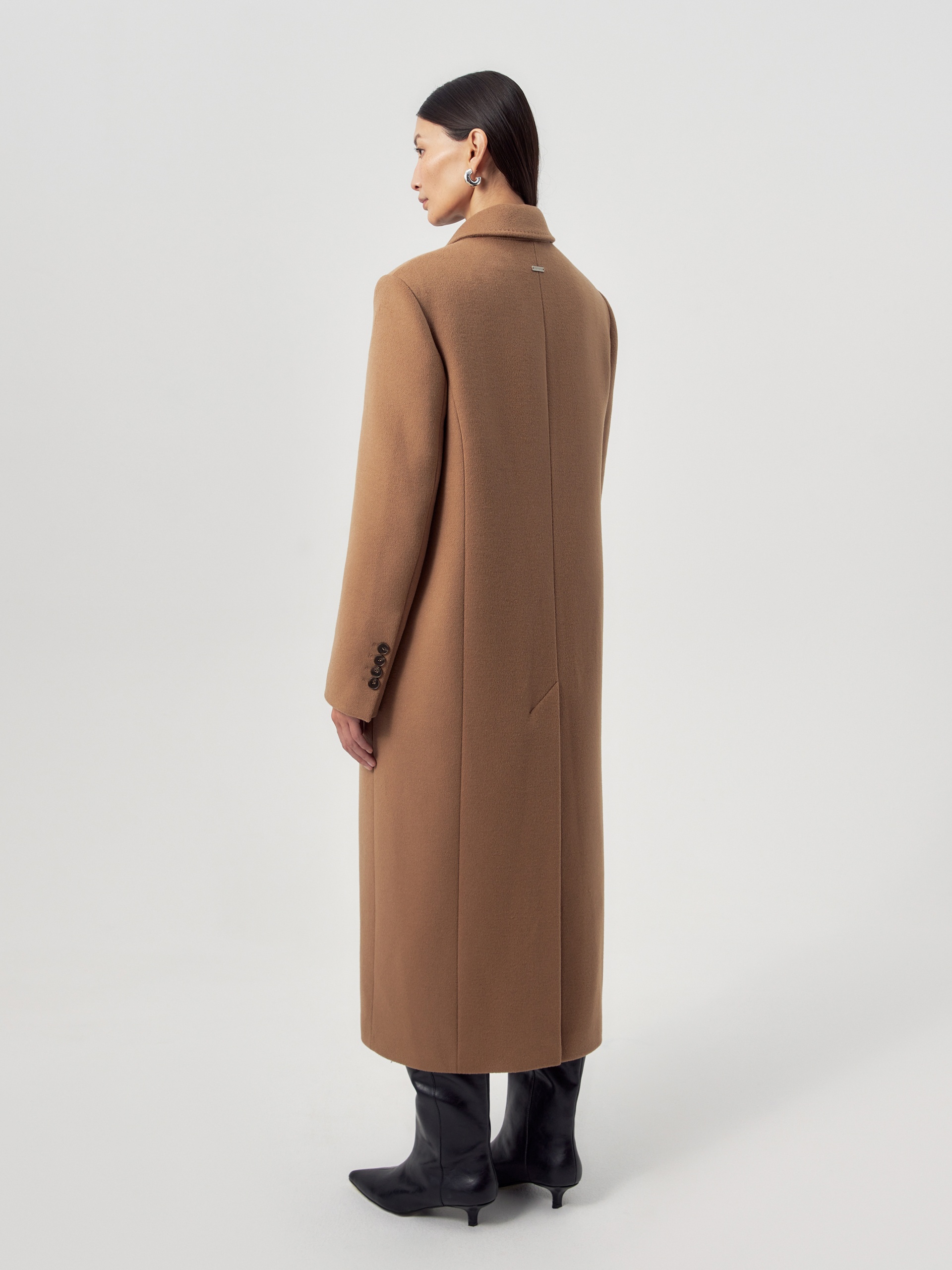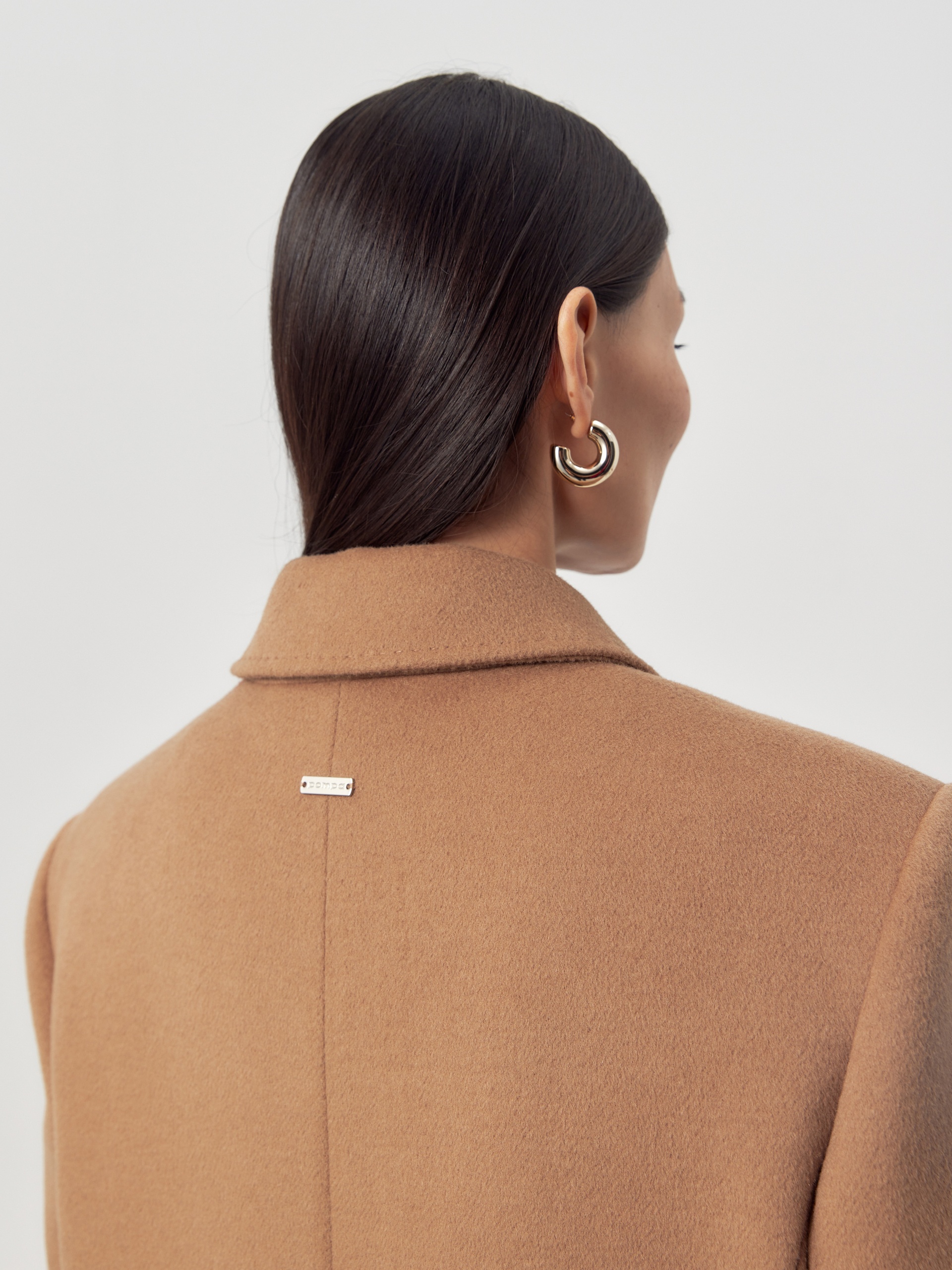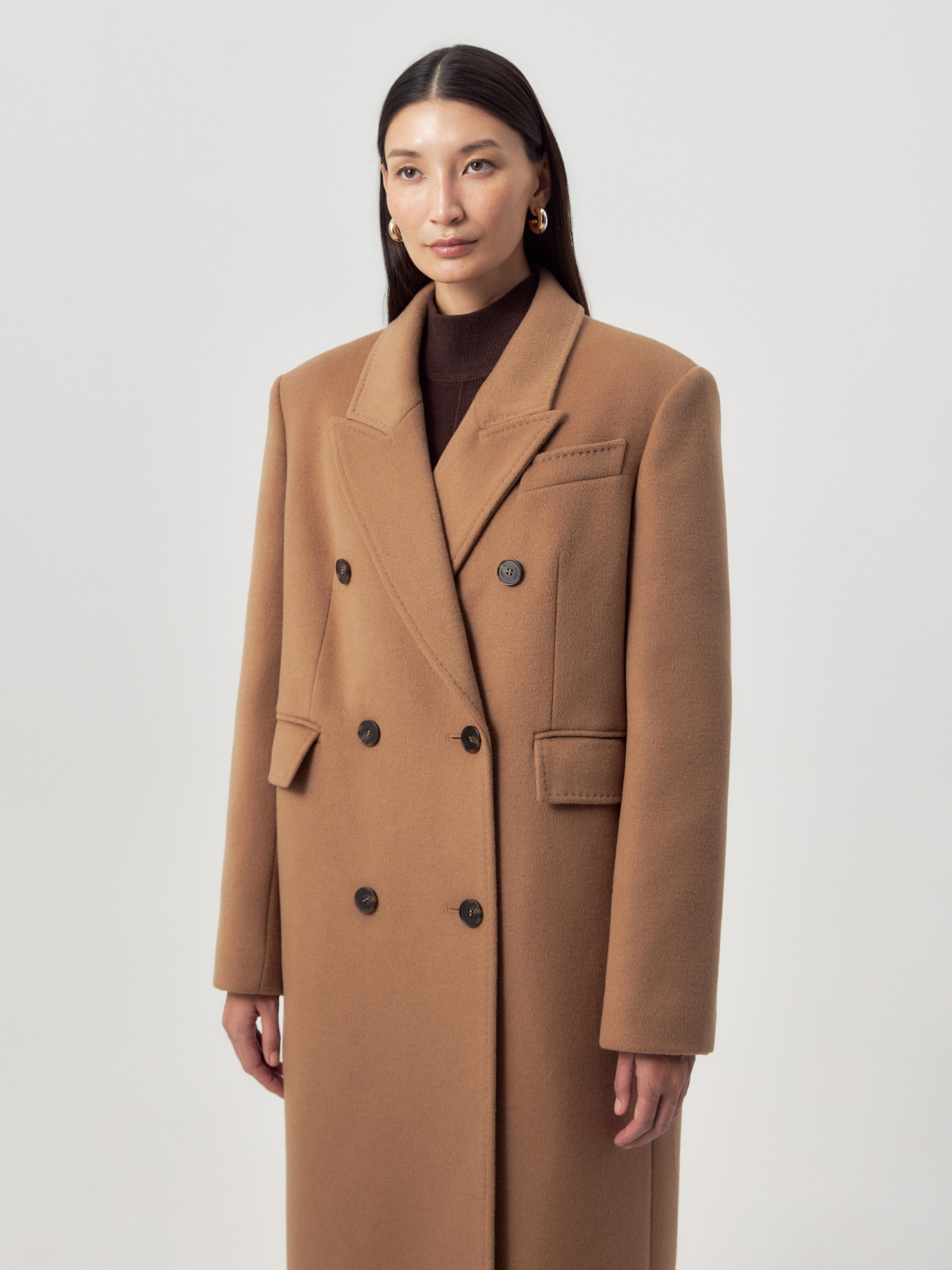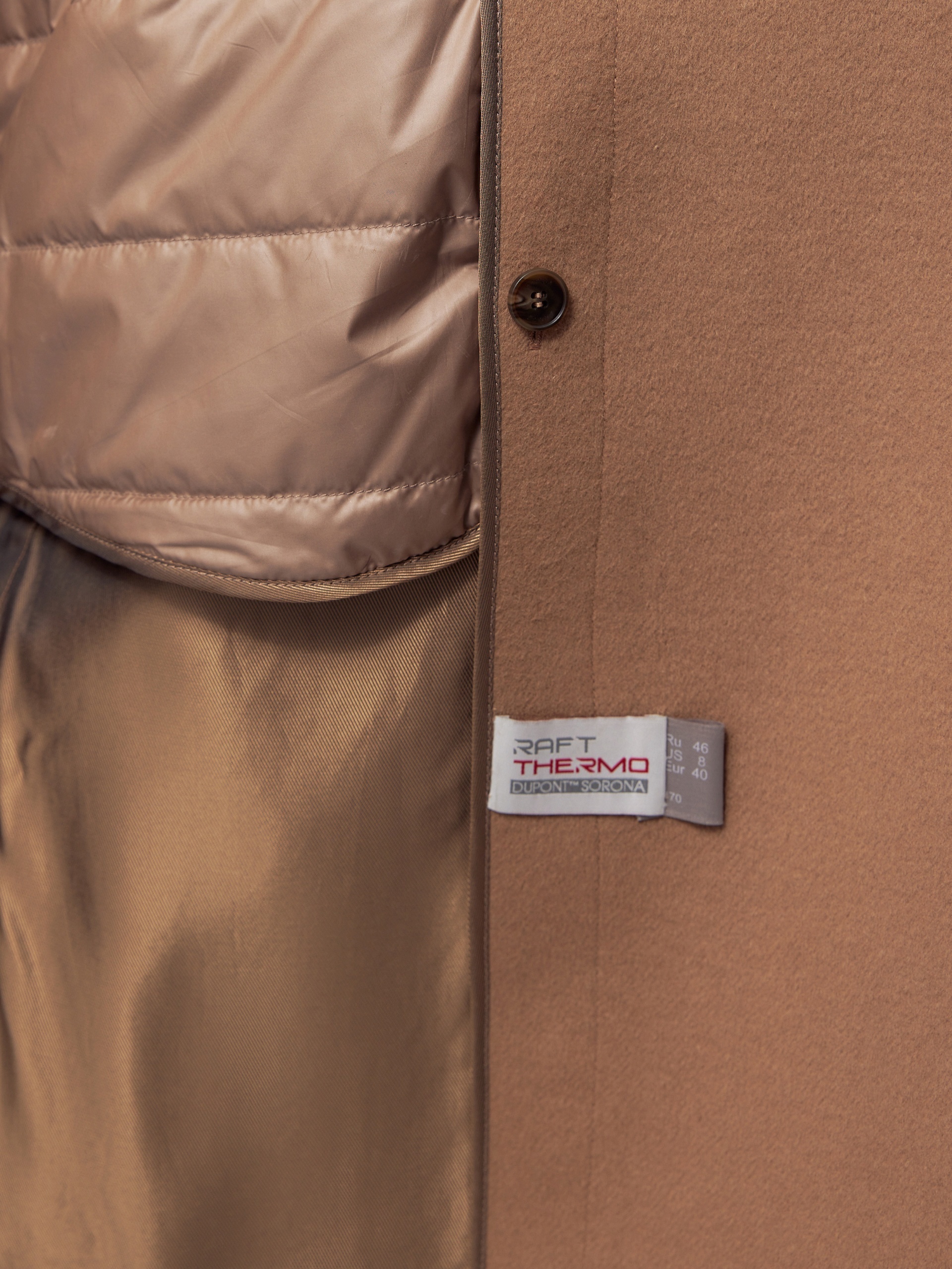 Must have этого сезона - пальто с подстёжкой в трендовом карамельном оттенке. Пальто двубортное из ворсовой ткани с высоким содержанием натуральной шерсти. Прямого силуэта, слегка заужено к низу, имеет втачной рукав и английский воротник с новой формой лацкана. По бокам расположены вместительные карманы с клапанами, на груди декоративная листочка. Застёгивается изделие на два ряда крупных пуговиц, по низу рукава выполнена застёжка на ряд пуговиц. В среднем шве спинки высокая шлица. В качестве дополнительного нижнего слоя в комплект к пальто предлагается съёмный жилет из стёганой плащевой ткани с водоотталкивающим покрытием, изготовленный с использованием инновационного утеплителя DuPont Sorona. А для наилучшей защиты от непогоды пальто выполнено с высокотехнологичной мембраной RaftPro. Произведено в Санкт-Петербурге.