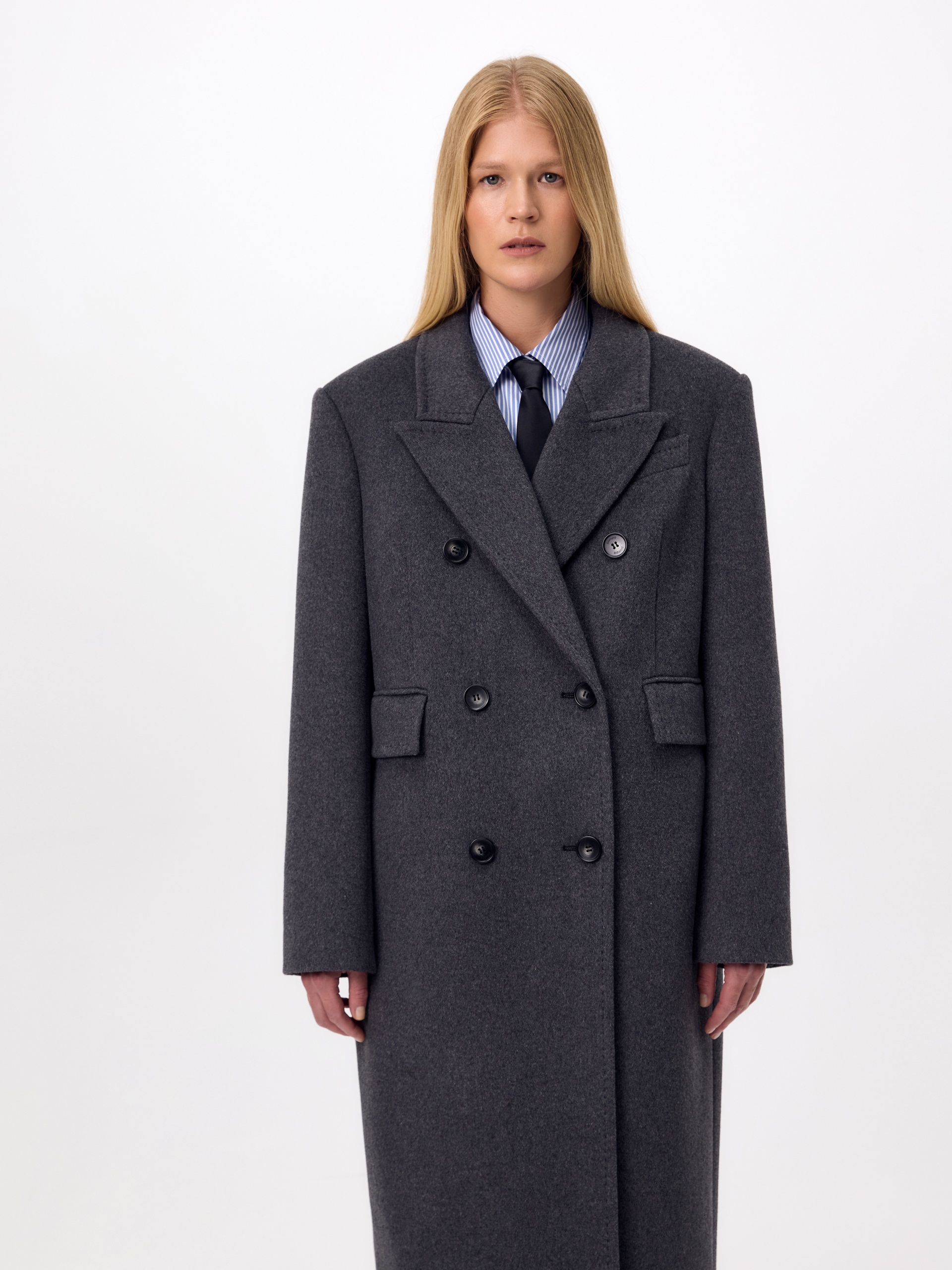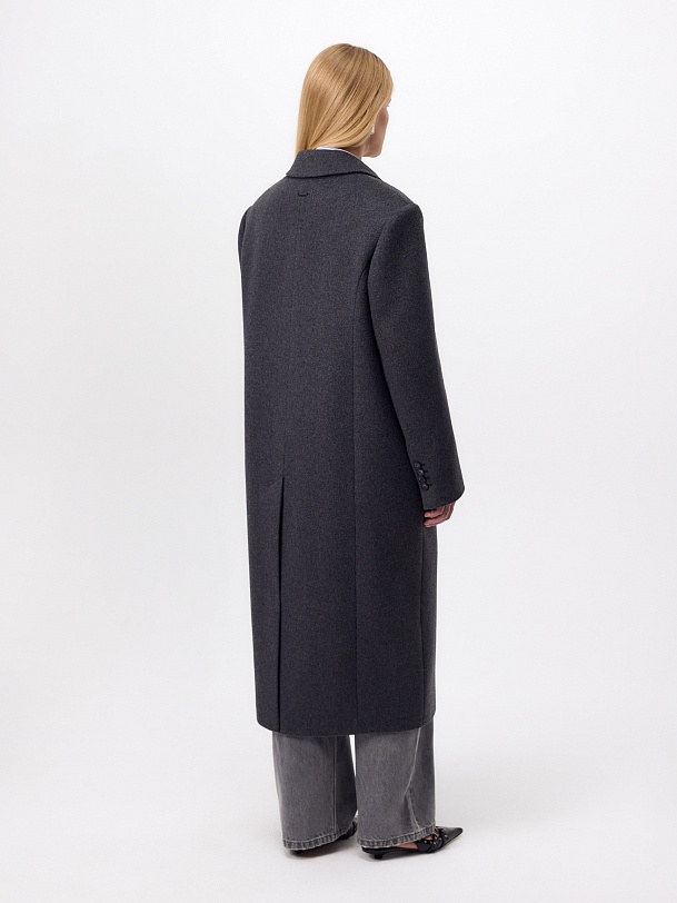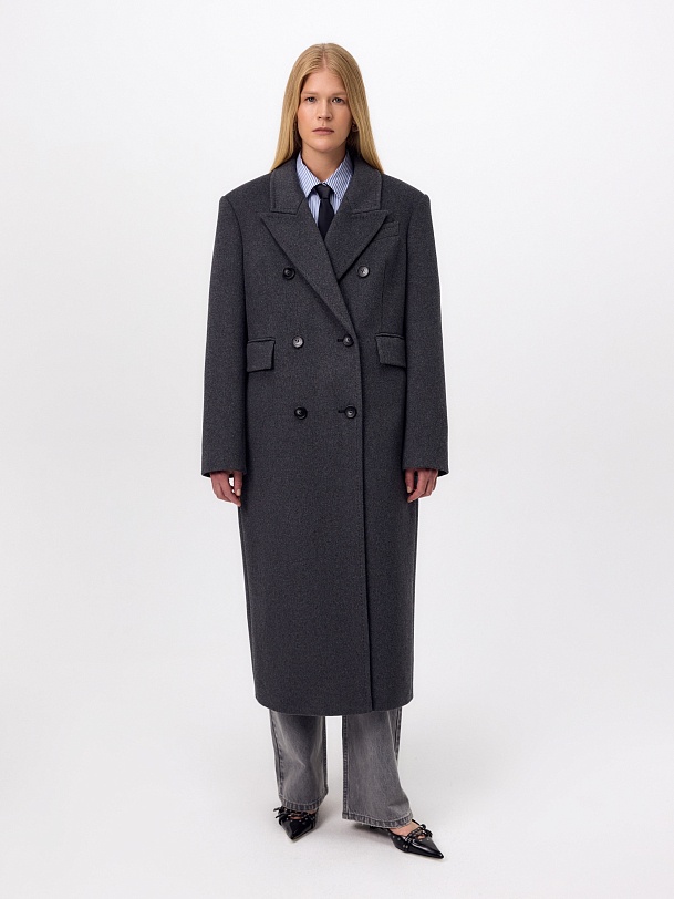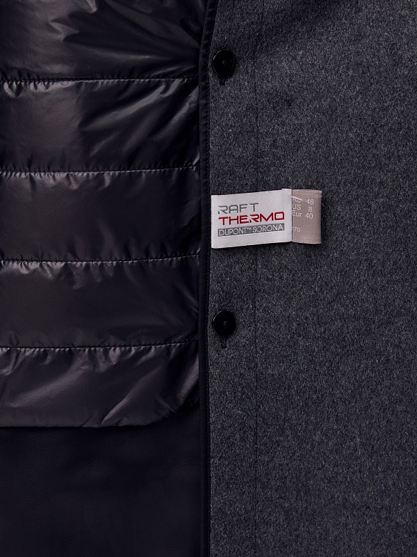 Must have этого сезона - пальто с подстёжкой в универсальном тёмно-сером цвете. Пальто двубортное из ворсовой ткани с высоким содержанием натуральной шерсти. Прямого силуэта, слегка заужено к низу, имеет втачной рукав и английский воротник с новой формой лацкана. По бокам расположены вместительные карманы с клапанами, на груди декоративная листочка. Застёгивается изделие на два ряда крупных пуговиц, по низу рукава выполнена застёжка на ряд пуговиц. В среднем шве спинки высокая шлица. В качестве дополнительного нижнего слоя в комплект к пальто предлагается съёмный жилет из стёганой плащевой ткани с водоотталкивающим покрытием, изготовленный с использованием инновационного утеплителя DuPont Sorona. А для наилучшей защиты от непогоды пальто выполнено с высокотехнологичной мембраной RaftPro. Произведено в Санкт-Петербурге.