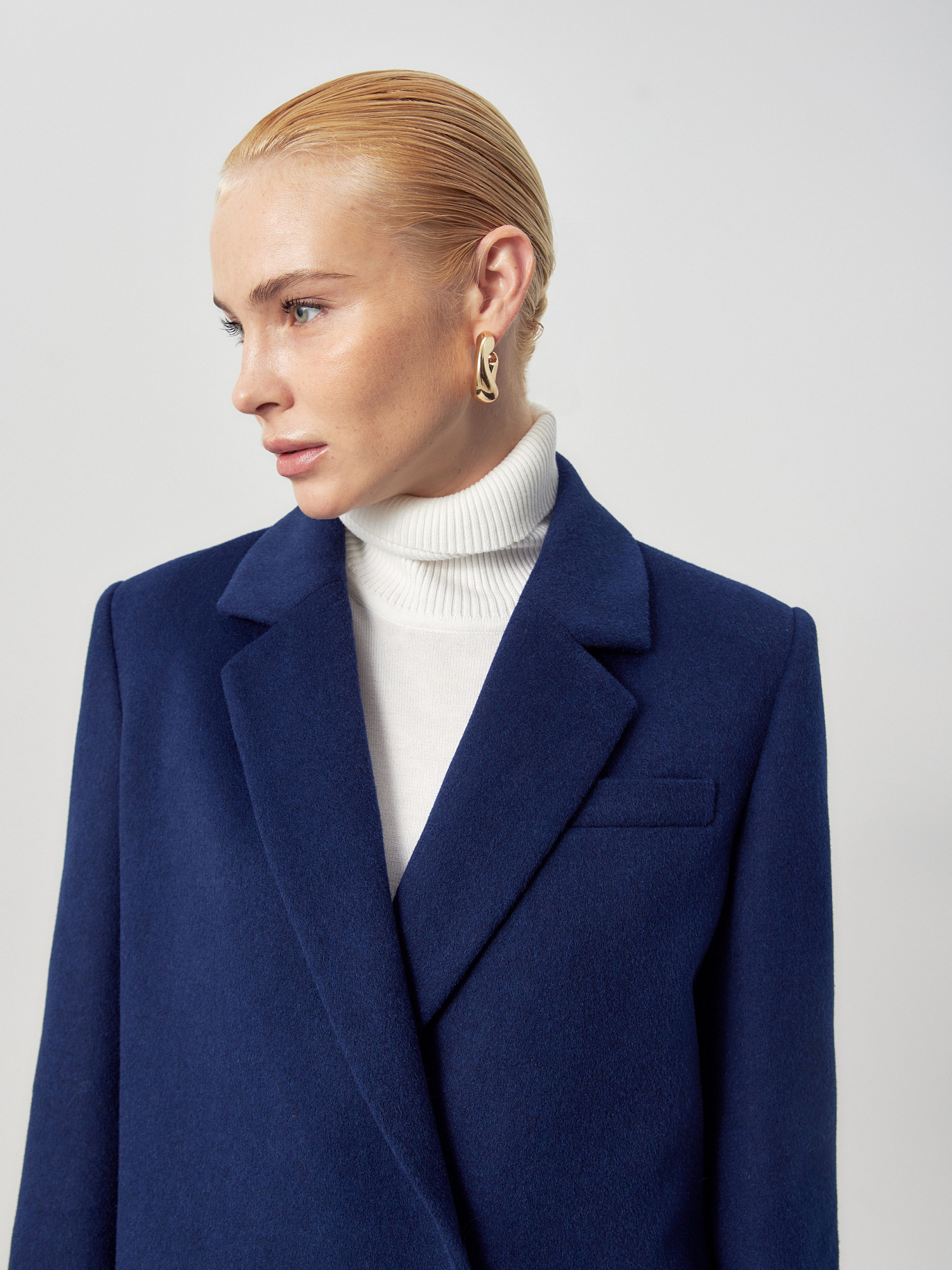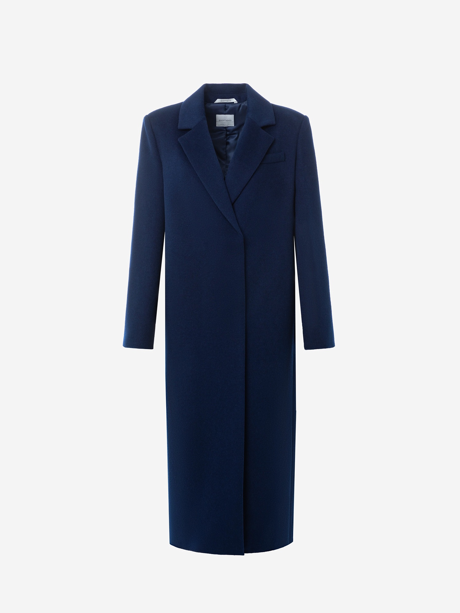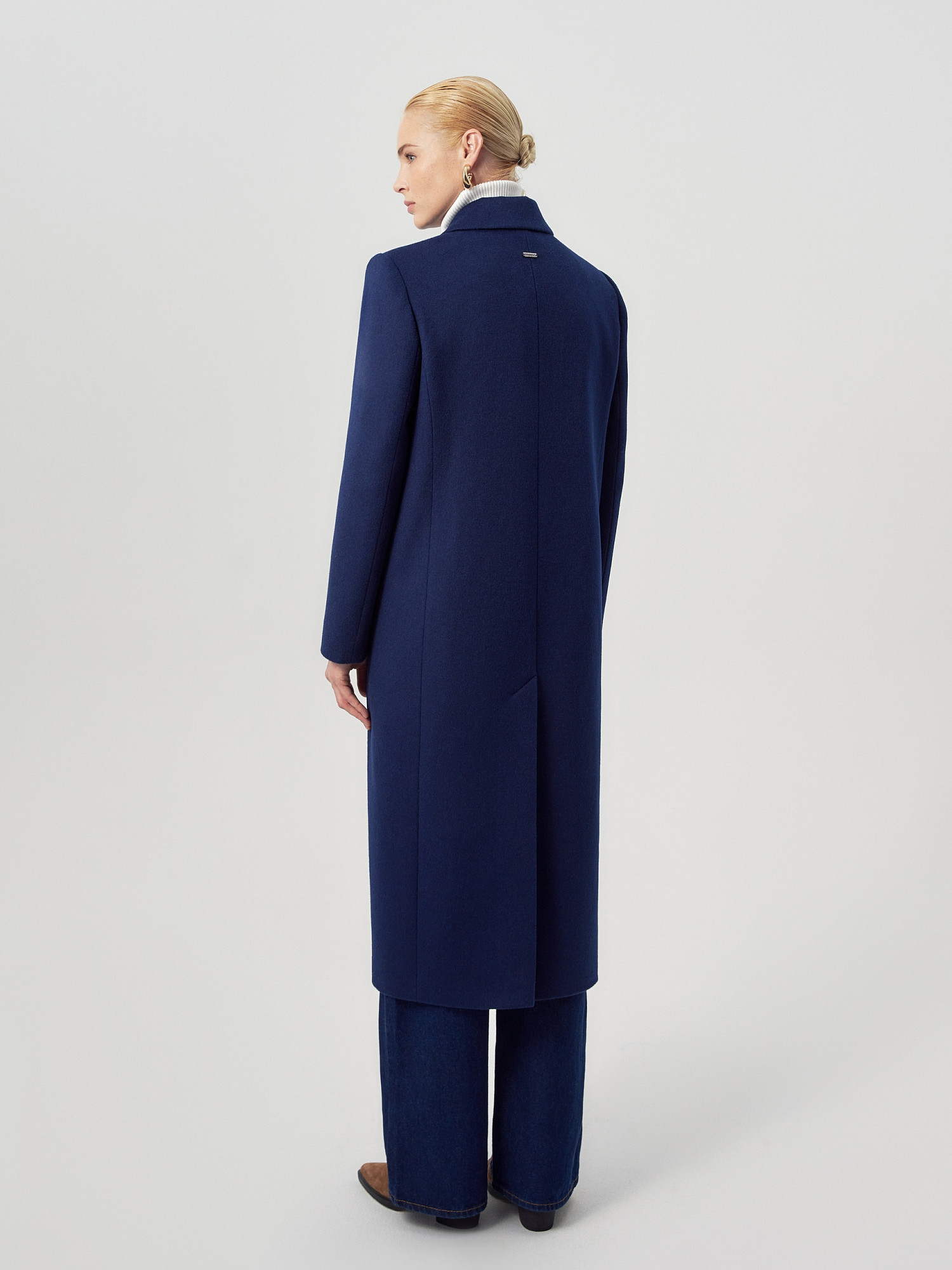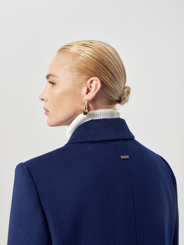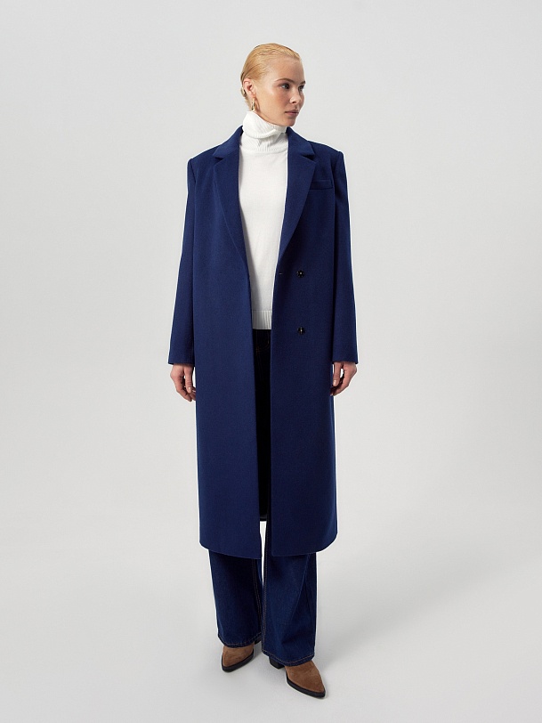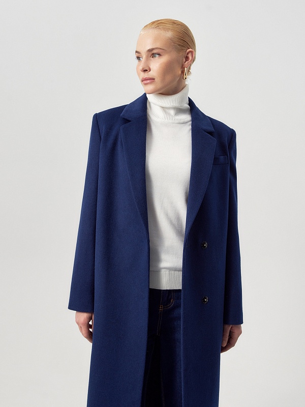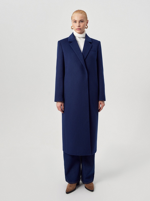 Классическое длинное двубортное тёмно-синее пальто из шерстяной ткани. Это минималистичное пальто идеально впишется в осенний базовый гардероб. Узкий английский воротник визуально удлиняет силуэт. Втачной рукав и рельефные швы делают образ строгим и лаконичным, декоративная листочка подчёркивает стилистику. В рельефах скрыты вместительные карманы. Пальто заужено к низу, в среднем шве спинки высокая шлица. Под нижним воротником прячется декоративная тесьма-мониль. Внутри пальто имеется нагрудный карман, а подкладка отделана кантом. Застёжка на ряд надёжных кнопок. А для наилучшей защиты от непогоды изделие выполнено с использованием высокотехнологичной мембраны RaftPro. Произведено в Санкт-Петербурге.