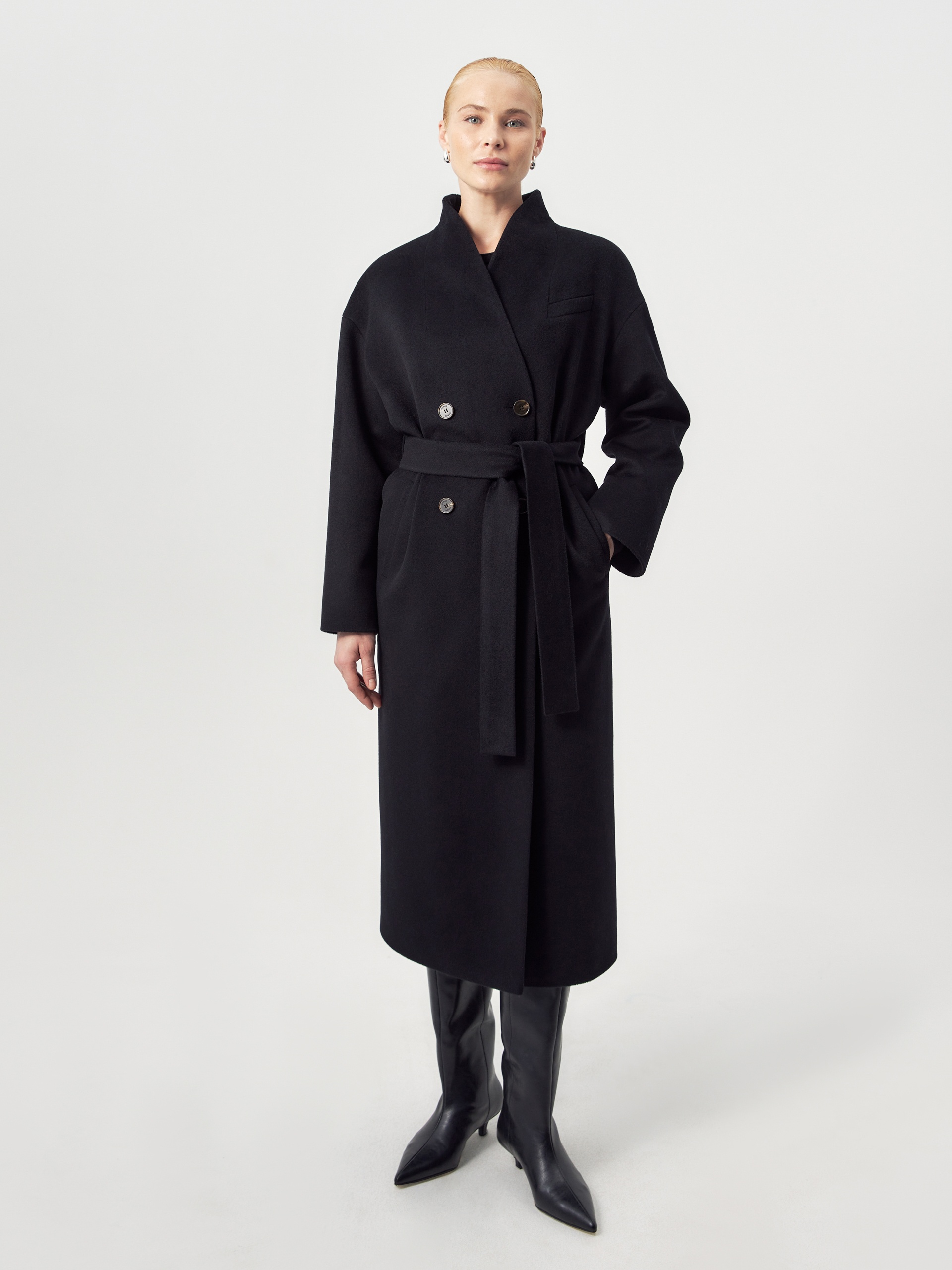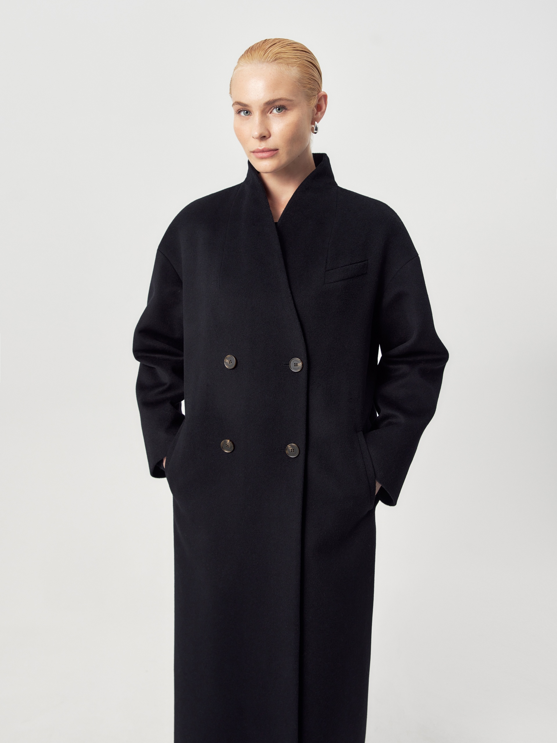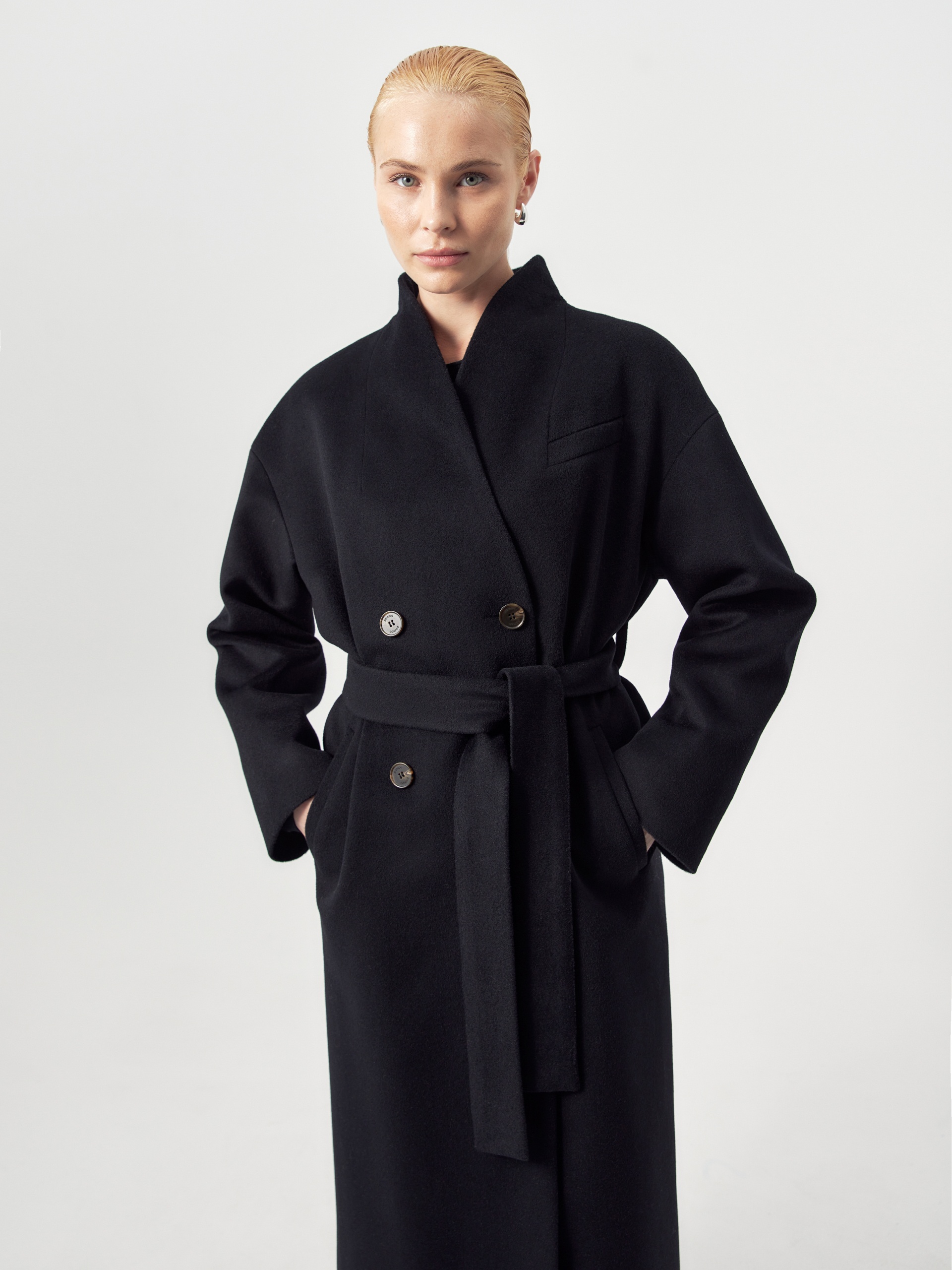 Длинное двубортное пальто из премиальной ворсовой ткани с содержанием натуарильной шерсти 95% в глубоком чёрном цвете. Пальто имеет новый цельнокроенный воротник-стойку и мягкий рубашечный рукав. На груди расположена декоративная листочка, по бокам вместительные карманы с листочками. Спинка пальто с широкой кокеткой и высокой шлицей. В комплекте с пальто предлагается пояс из основной ткани. А для наилучшей защиты от непогоды пальто выполнено с использованием высокотехнологичной мембраны RaftPro и инновационного утеплителя DuPont Sorona. Произведено в Санкт-Петербурге.