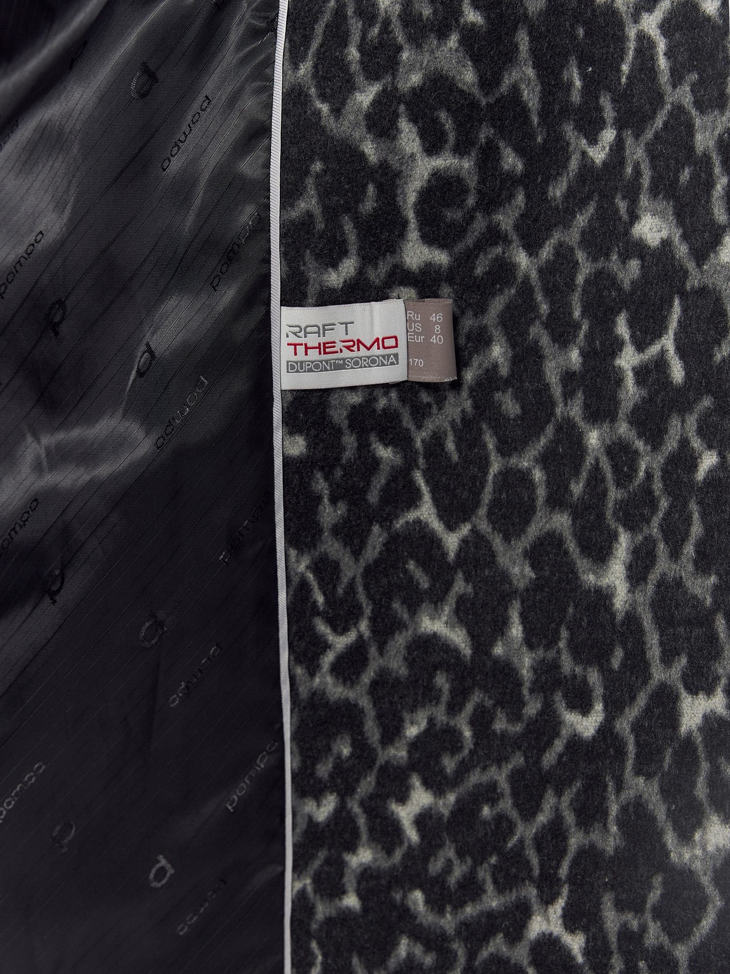 Остромодное длинное пальто из ворсовой ткани с высоким содержанием шерсти в новой расцветке "графитовый леопард". Пальто прямого силуэта, слегка заужено к низу, имеет новый широкий английский воротник и классический втачной рукав пиджачного типа с застёжкой на пуговицы по низу рукава. На груди декоративная листочка, по бокам расположены вместительные карманы с клапанами. Стойка воротника выполнена из отделочной ткани и декорирована тесьмой. Внутри подкладка обработана кантом. В среднем шве спинки высокая шлица. А для наилучшей защиты от непогоды пальто выполнено с использованием высокотехнологичной мембраны RaftPro и инновационного утеплителя DuPont Sorona. Произведено в Санкт-Петербурге.