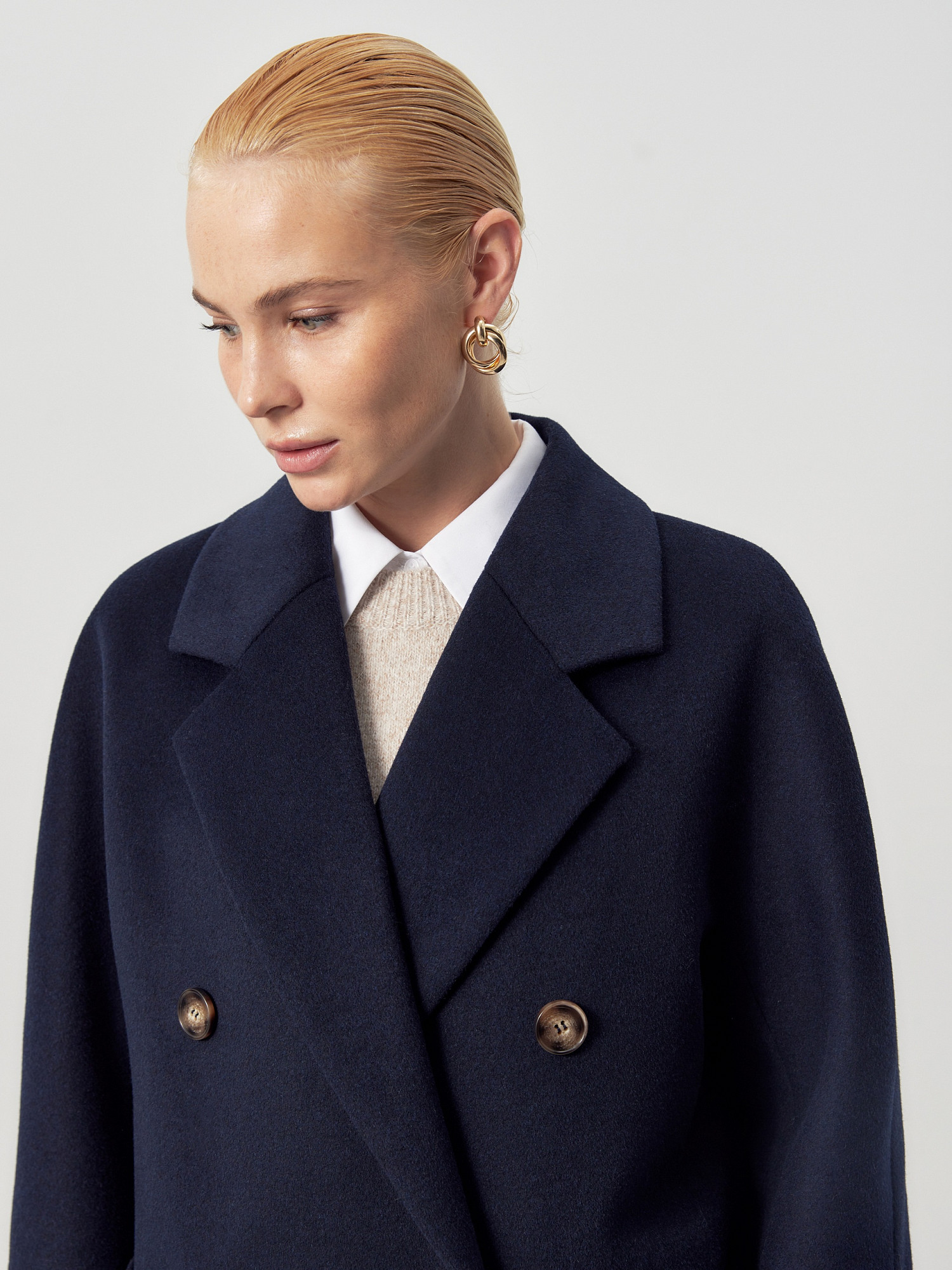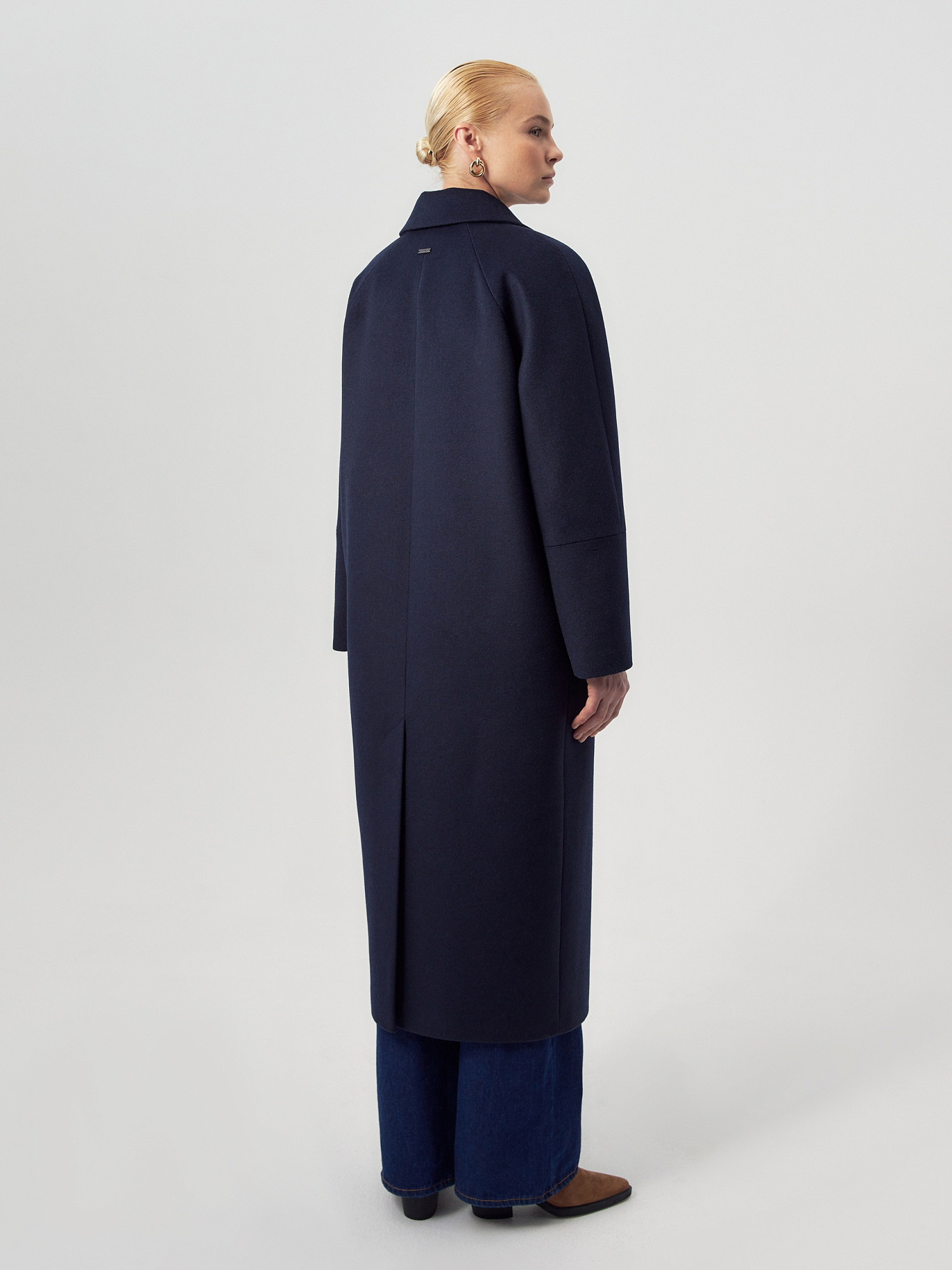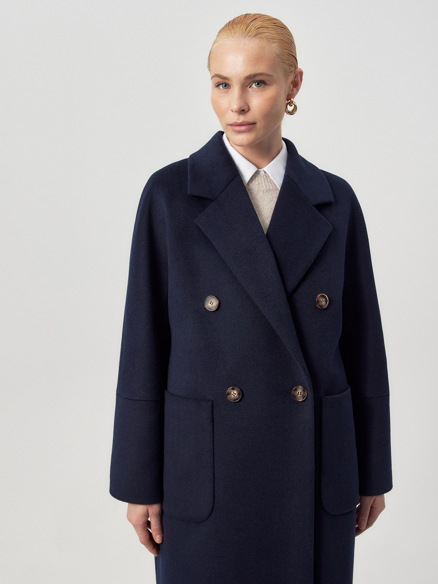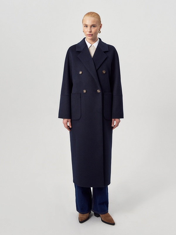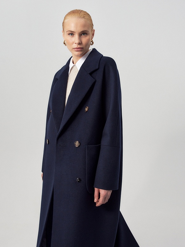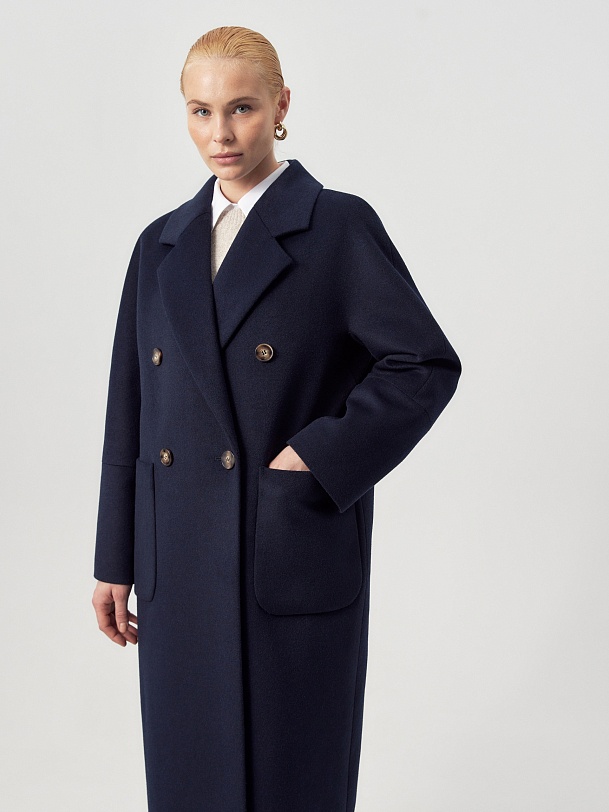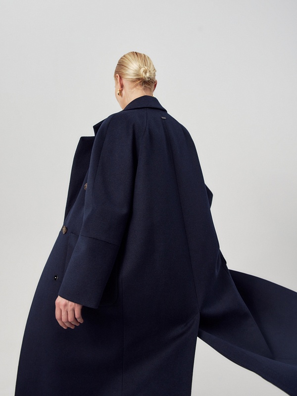 Длинное двубортное пальто в классическом оттенке dark navy из ворсовой ткани с высоким содержанием натуральной шерсти. Силуэт кокон и рубашечный рукав создают расслабленный образ и дарят уют и тепло. Пальто имеет классический английский воротник, по бокам располагаются вместительные накладные карманы. Рукава с широкими отрезными манжетами, в среднем шве спинки высокая шлица. А для наилучшей защиты от непогоды пальто выполнено с использованием высокотехнологичной мембраны RaftPro и инновационного утеплителя DuPont Sorona. Произведено в Санкт-Петербурге.