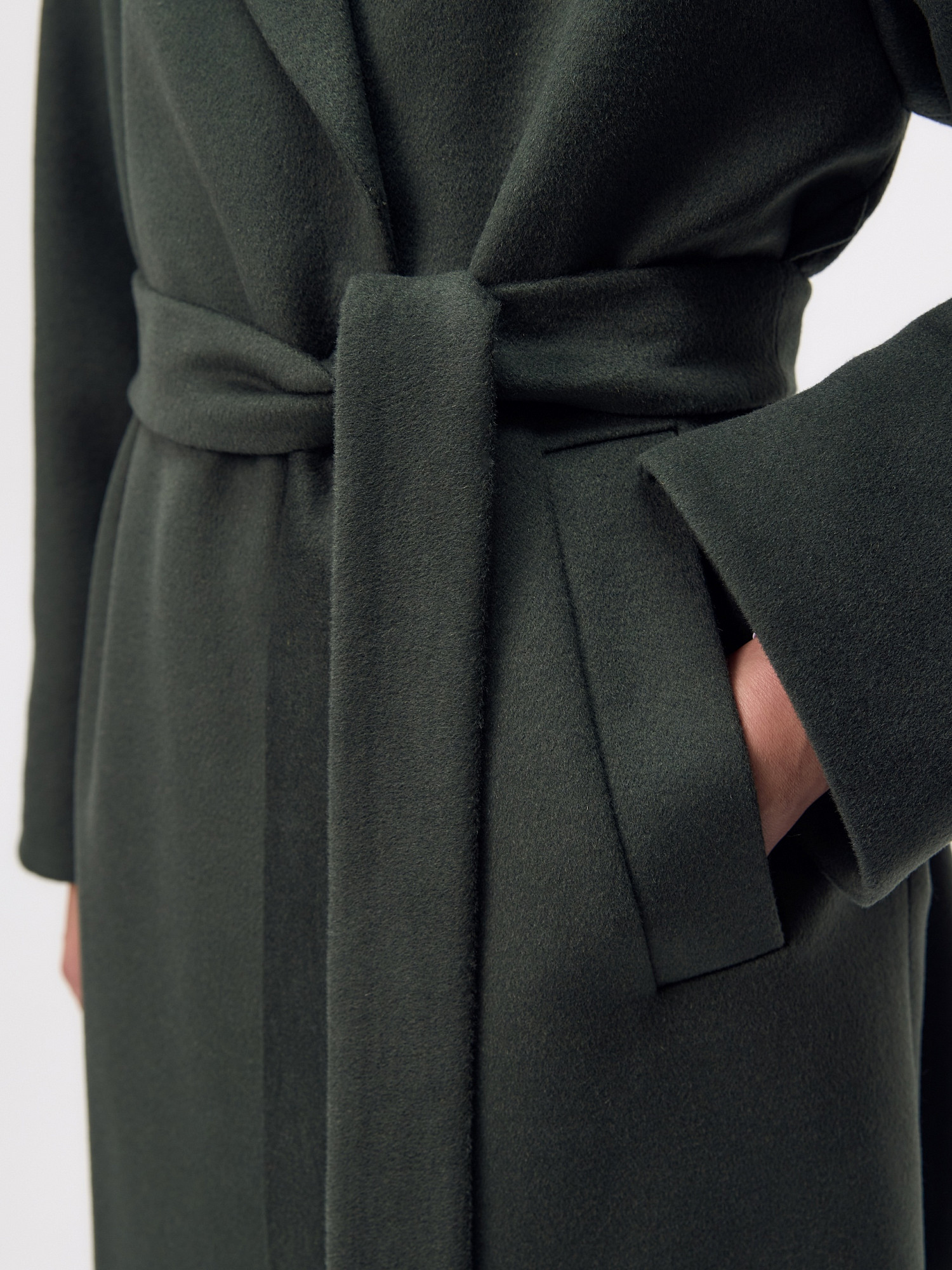 Двубортное пальто прямого силуэта из ворсовой ткани в классическом цвете хаки. Пальто имеет свободный и не стесняющий движений рубашечный рукав, классический английский воротник и универсальную длину ниже колена. По бокам располагаются глубокие карманы с листочками. Застегивается изделие на пришивные кнопки. Образ дополняет съемный капюшон на молнии из плащевой ткани. Для наилучшей защиты от непогоды изделие выполнено с использованием высокотехнологичной мембраны RaftPro, а спинка пальто имеет дополнительное утепление. Произведено в Санкт-Петербурге.