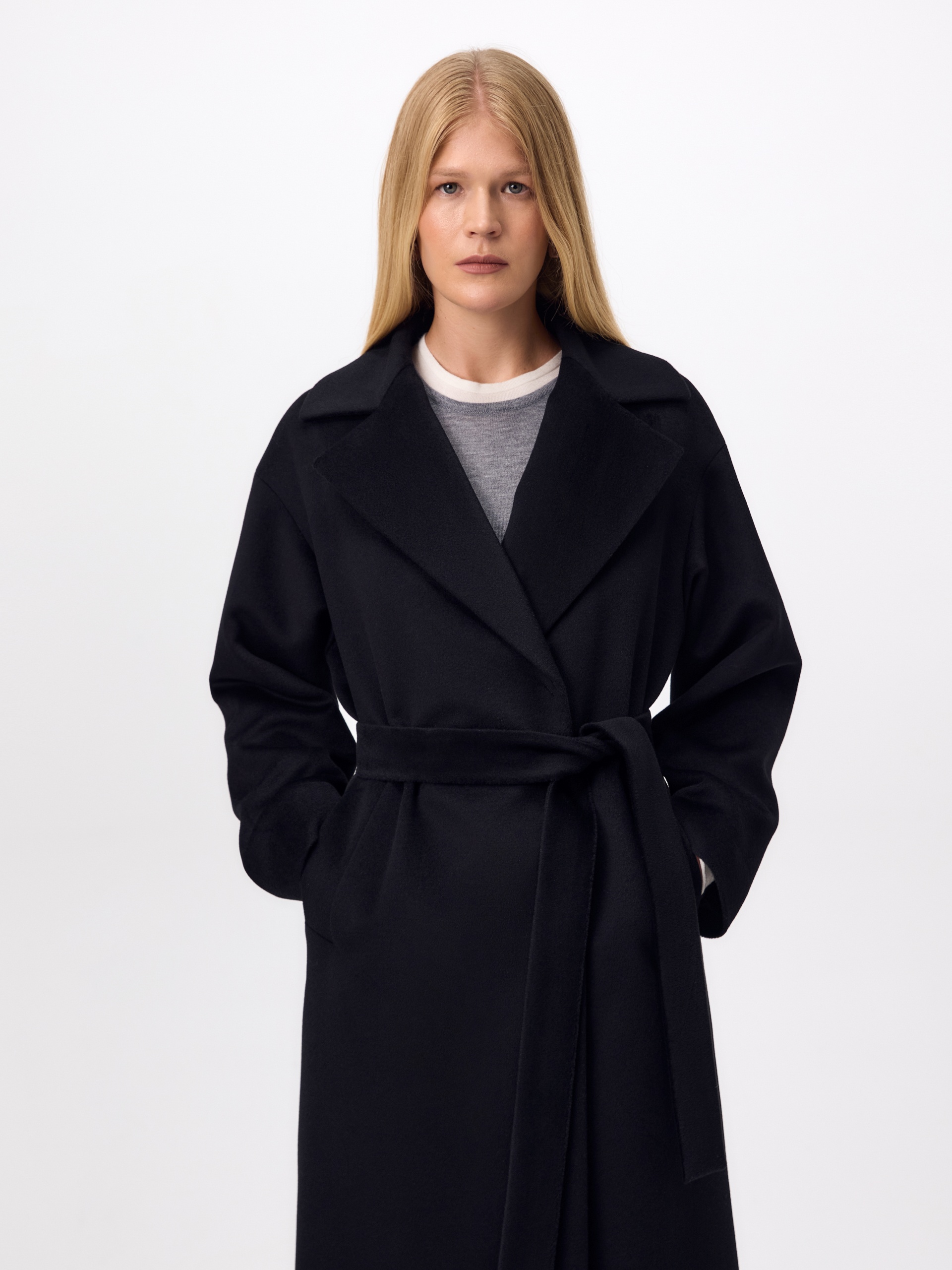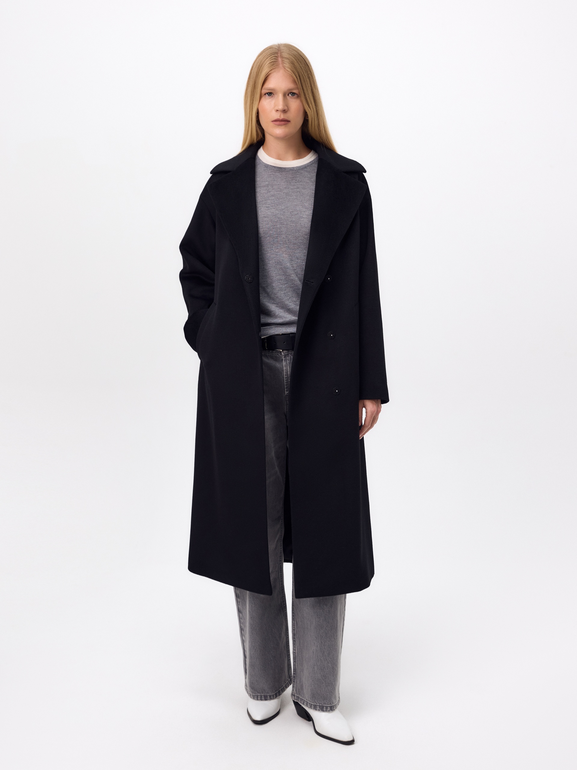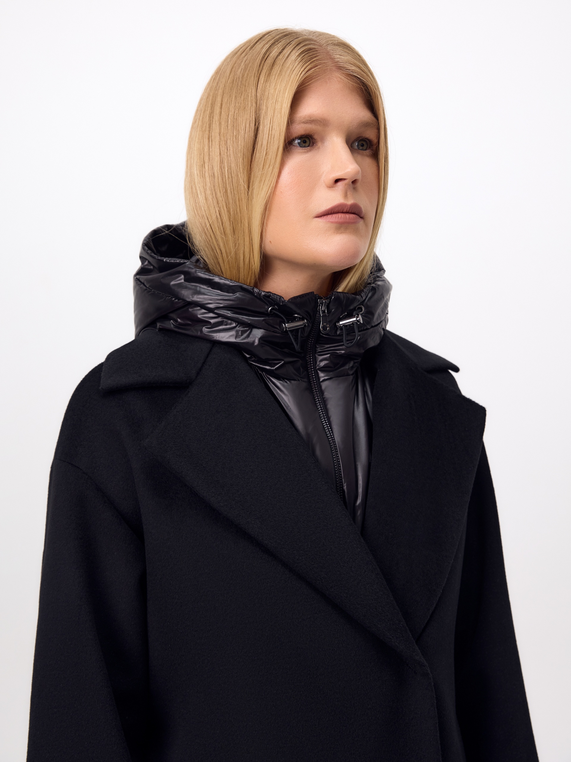 Полюбившаяся классика - двубортное пальто силуэта "удлинённый кокон", в этом сезоне представлена в обновлённом варианте. Пальто сшито из премиальной ворсовой ткани с высоким содержанием шерсти. Глубокий чёрный цвет, свободный рубашечный рукав и классический английский воротник делают его стильным и удобным. Застёжка на ряд надёжных пришивных кнопок, по бокам располагаются вместительные карманы с листочками. Спинка имеет дополнительное утепление. В комплекте с пальто предлагается тёплый капюшон из плащевой ткани с водоотталкивающим покрытием, надёжно защищающий от осадков. А для наилучшей защиты от ветра и непогоды пальто выполнено с использованием высокотехнологичной мембраны RaftPro. Произведено в Санкт-Петербурге.