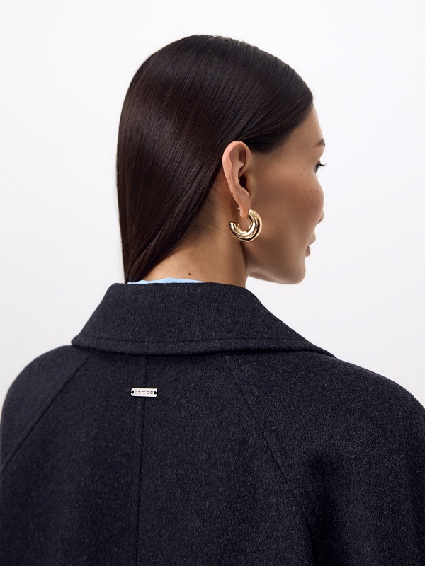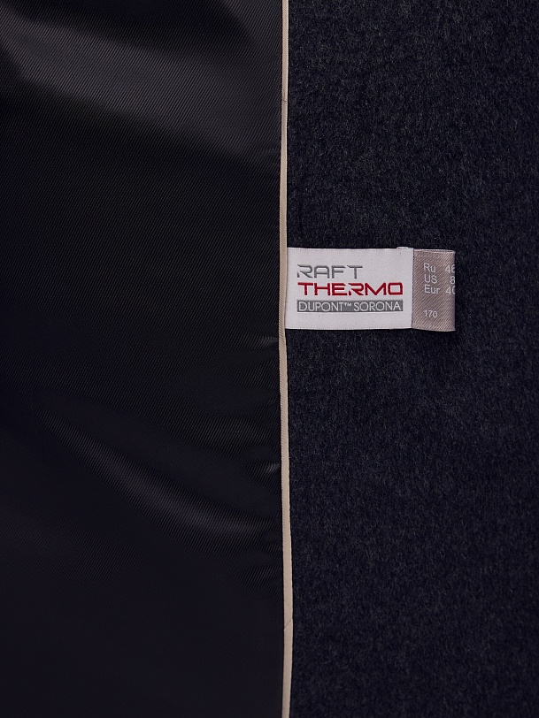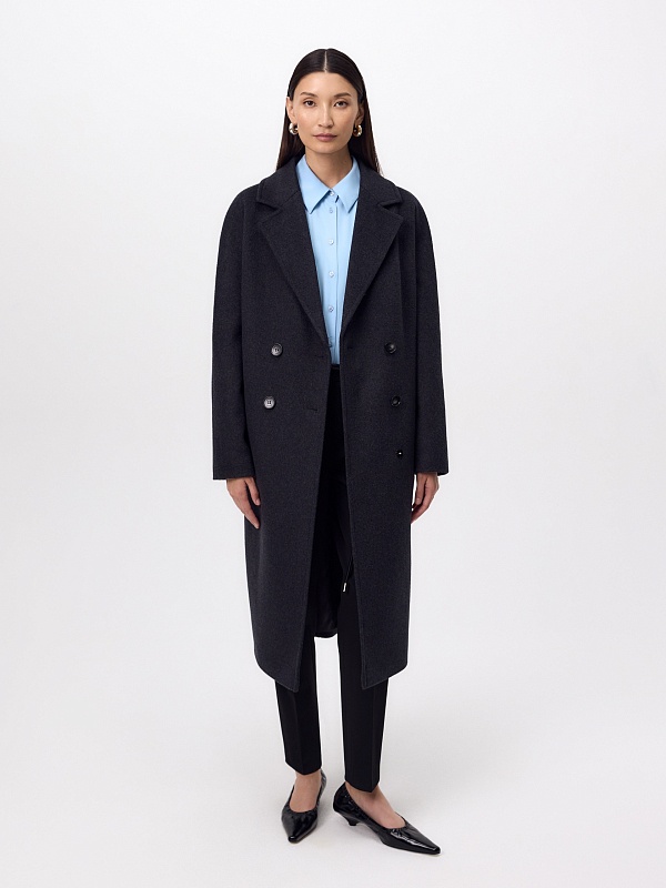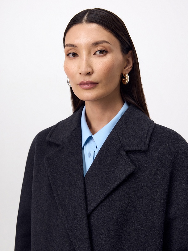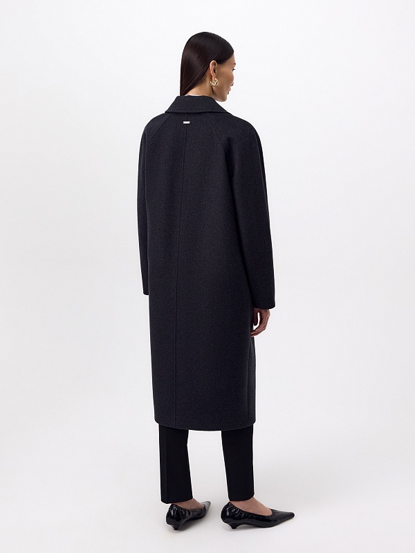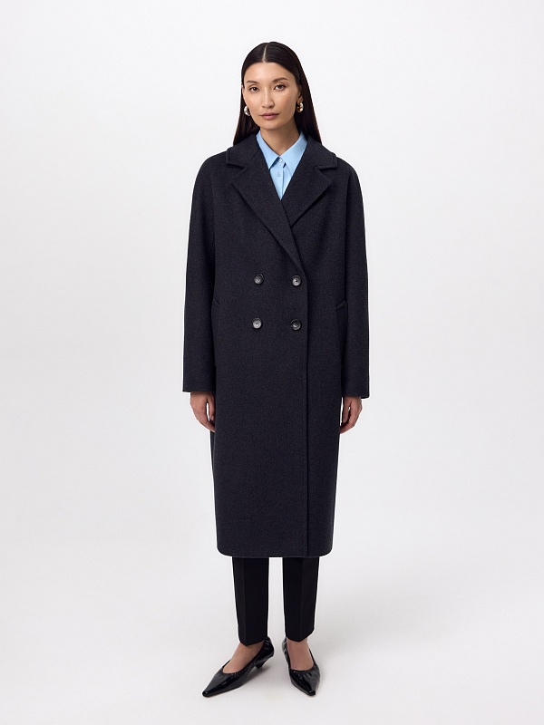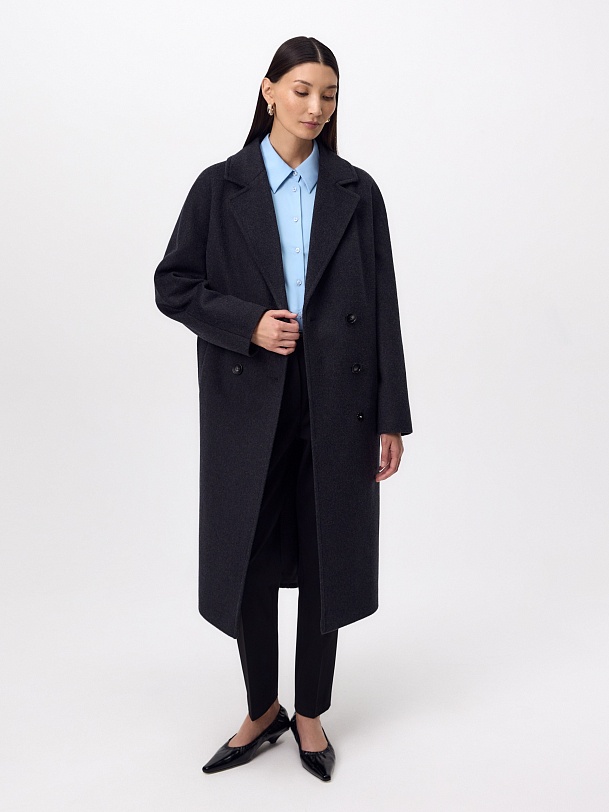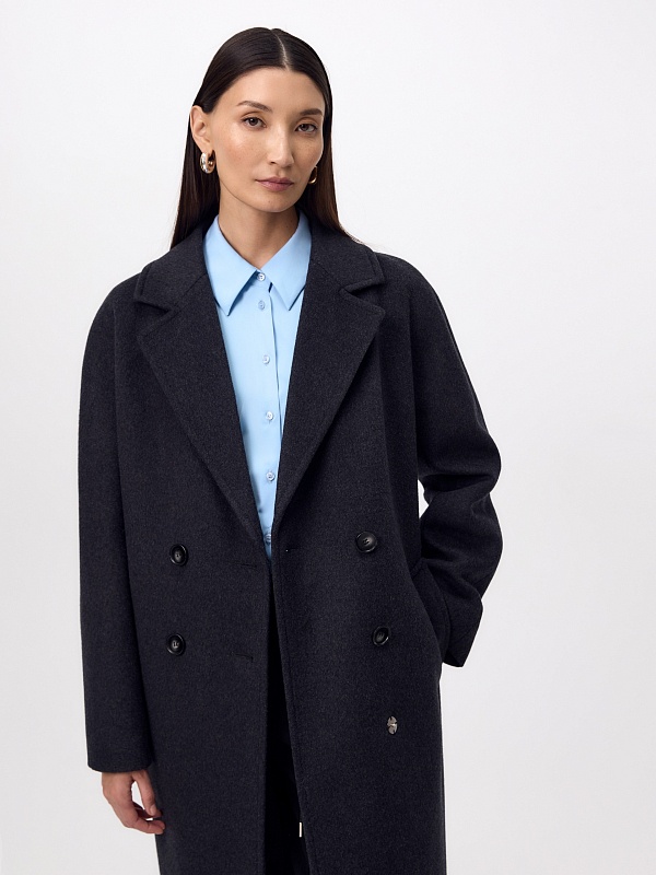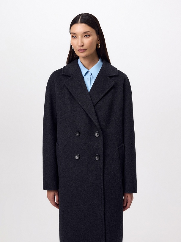 Двубортное пальто силуэта "удлиненный кокон" в благородном цвете тёмно-серый меланж. Пальто сшито из ворсовой ткани с высоким содержанием натуральной шерсти. Пальто имеет множество уникальных деталей: заведенные вперед боковые швы, объемный и мягкий силуэт, нетипичную линию английского воротника. Комбинированный рукав (цельнокроенный спереди и реглан на спинке) делает линию плеч мягкой и спокойной, не стесняет движений. Пальто универсальной длины ниже колена. Спинка имеет дополнительное утепление. Застежка на два ряда крупных тёмных пуговиц. В комплекте с пальто предлагается тёплый капюшон из плащевой ткани с водонепроницаемым покрытием. Такой капюшон надёжно защитит от осадков, а универсальный серый цвет позволит сочетать его и с другими пальто нашей коллекции. А для наилучшей защиты от непогоды пальто произведено с использованием высокотехнологичной мембраны RaftPro. Произведено в Санкт-Петербурге.