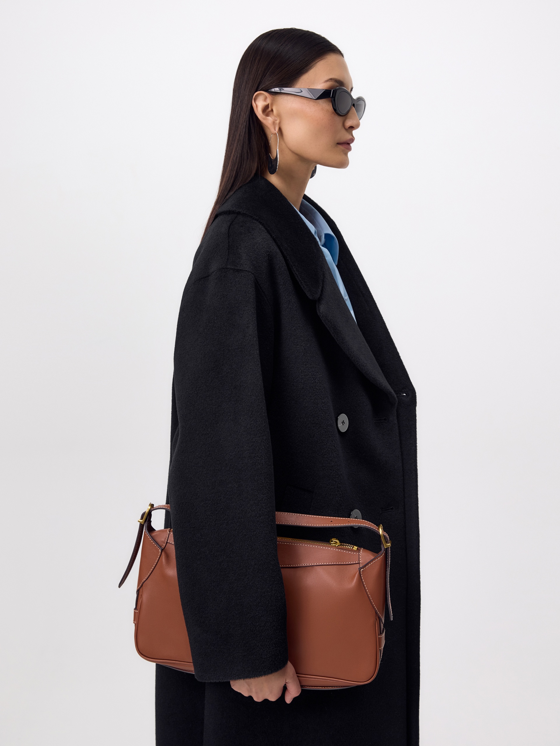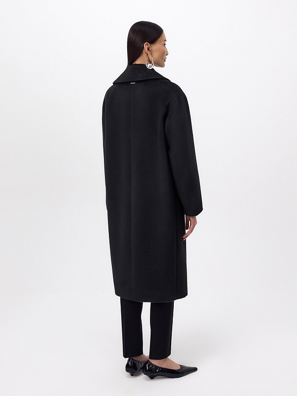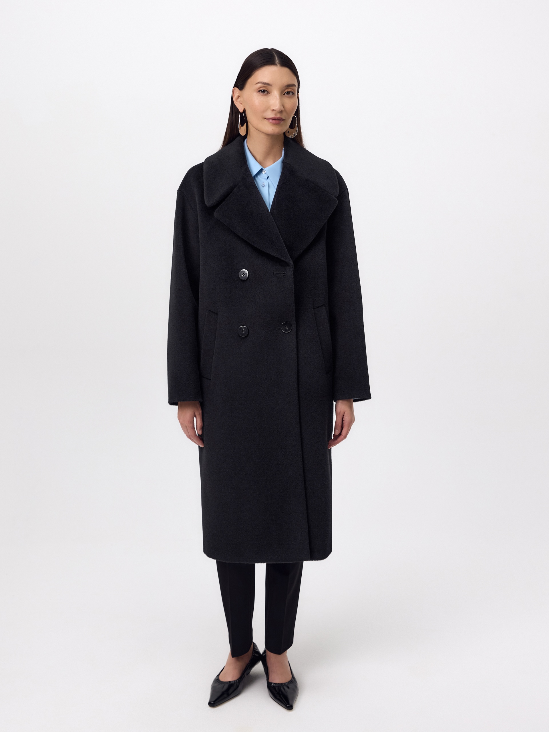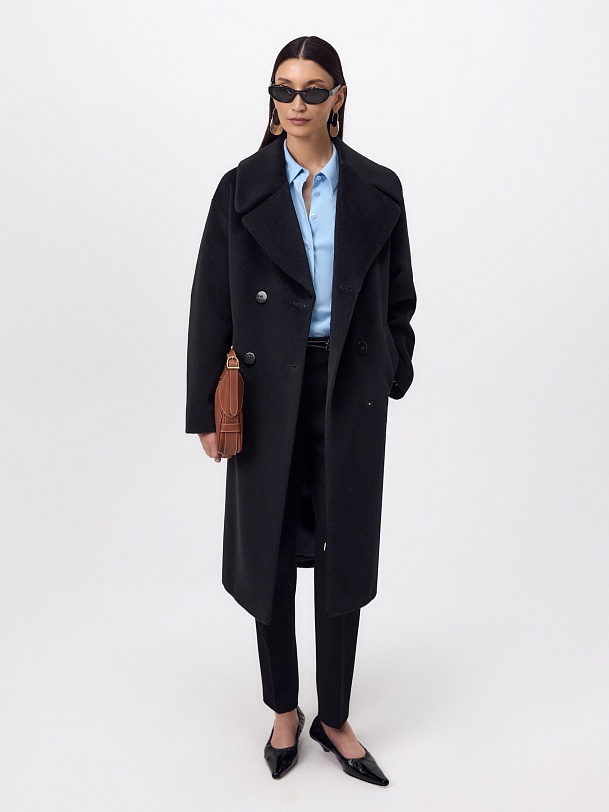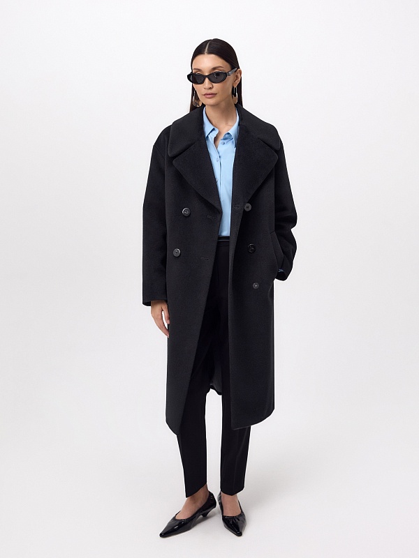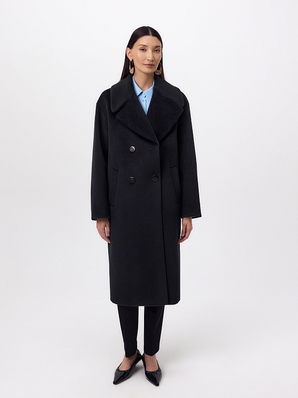 Двубортное классическое пальто обновленного силуэта "удлиненый кокон" в глубоком черном цвете. Пальто сшито из натуральной шерстяной ворсовой ткани с содержанием нежной шерсти альпаки. Пальто имеет новый модный английский воротник с широким лацканом и спокойный, не стесняющий движений рубашечный рукав. По бокам располагаются вместительные карманы с листочками. Застежка на три ряда крупных пуговиц. Длина пальто закрывает колено. А для наилучшей защиты от непогоды пальто выполнено с использованием высокотехнологичной мембраны RaftPro и инновационного утеплителя DuPont Sorona. Произведено в Санкт-Петербурге.
