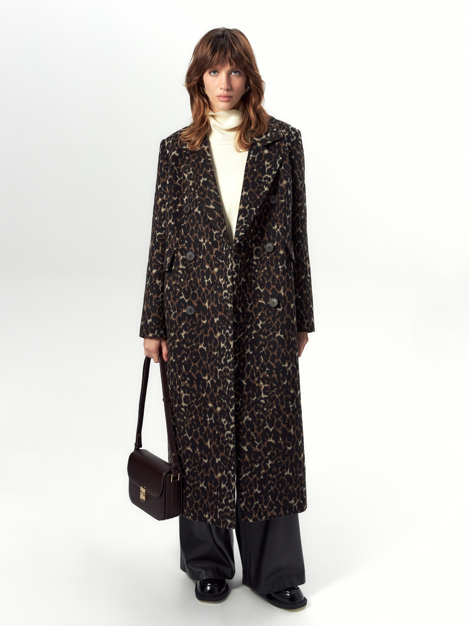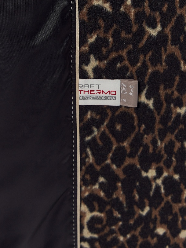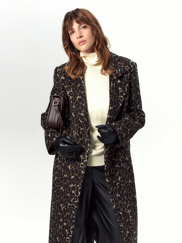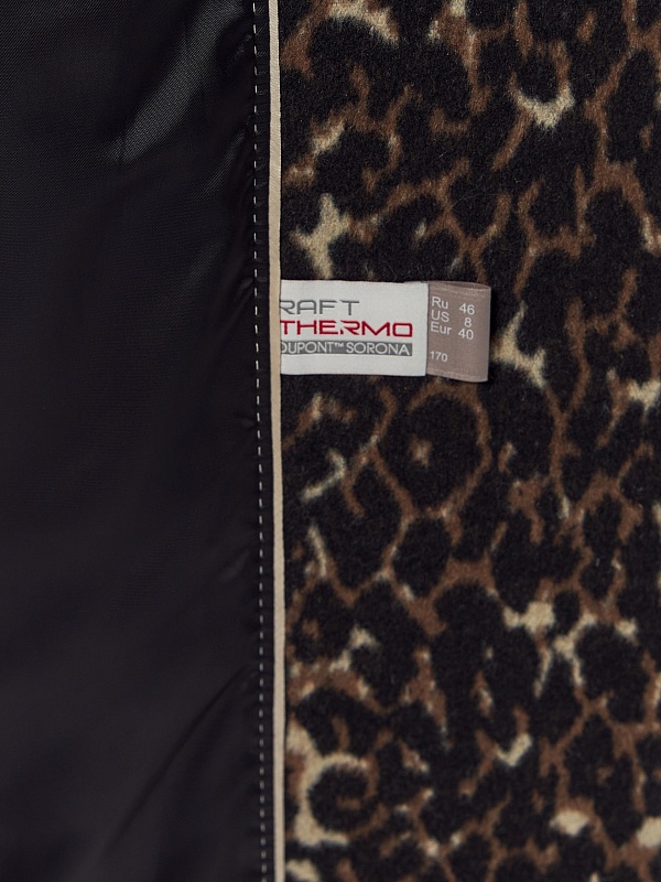 Двубортное классическое пальто прямого силуэта в мужском стиле с расширенной линией плеча. Выполнено из ворсовой ткани трендовой расцветки леопард . Пальто имеет английский воротник, декорированный по линии горловины спинки ценной цепочкой Мониль и втачной рукав пиджачного типа с застежкой по низу на ряд пуговиц. Карманы в рельефах с клапаном. В среднем шве спинки высокая шлица. Застежка на пуговицы . Для наилучшей защиты от непогоды изделие выполнено с использованием высокотехнологичной мембраны RaftPro, а спинка пальто имеет дополнительное утепление высокотехнологичным утеплителем DuPONT SORONA. Произведено в Санкт-Петербурге