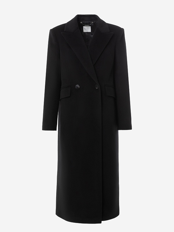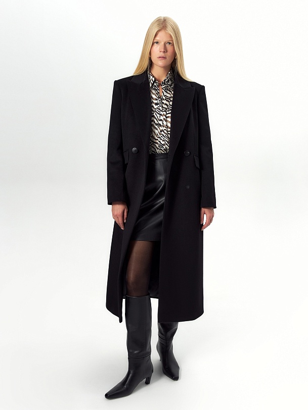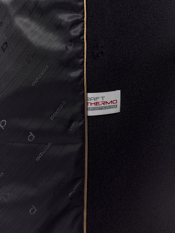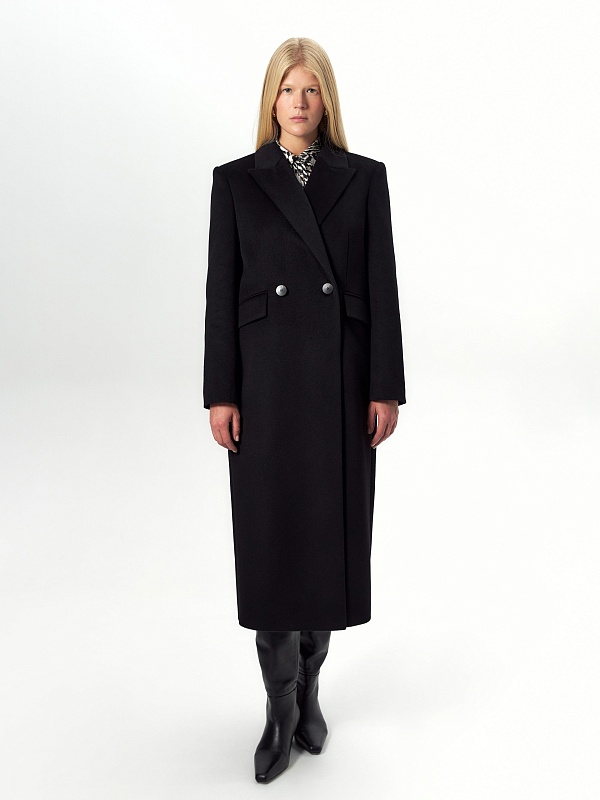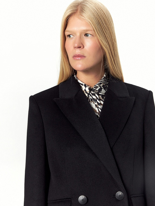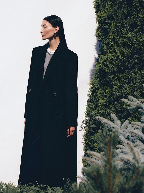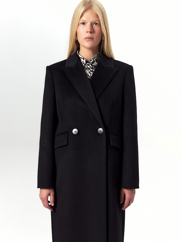 Двубортное классическое пальто прямого силуэта в мужском стиле с расширенной линией плеча. Выполнено из ворсовой ткани в глубоком черном цвете. Пальто имеет английский воротник и стильный втачной рукав пиджачного типа с застежкой по низу на ряд пуговиц. Карманы врезные листочки с клапаном. В среднем шве спинки высокая шлица. Застегивается изделие на пуговицы и пришивные кнопки. Для наилучшей защиты от непогоды изделие выполнено с использованием высокотехнологичной мембраны RaftPro, а спинка пальто имеет дополнительное утепление высокотехнологичным утеплителем Du Pont Sorona. Произведено в Санкт-Петербурге