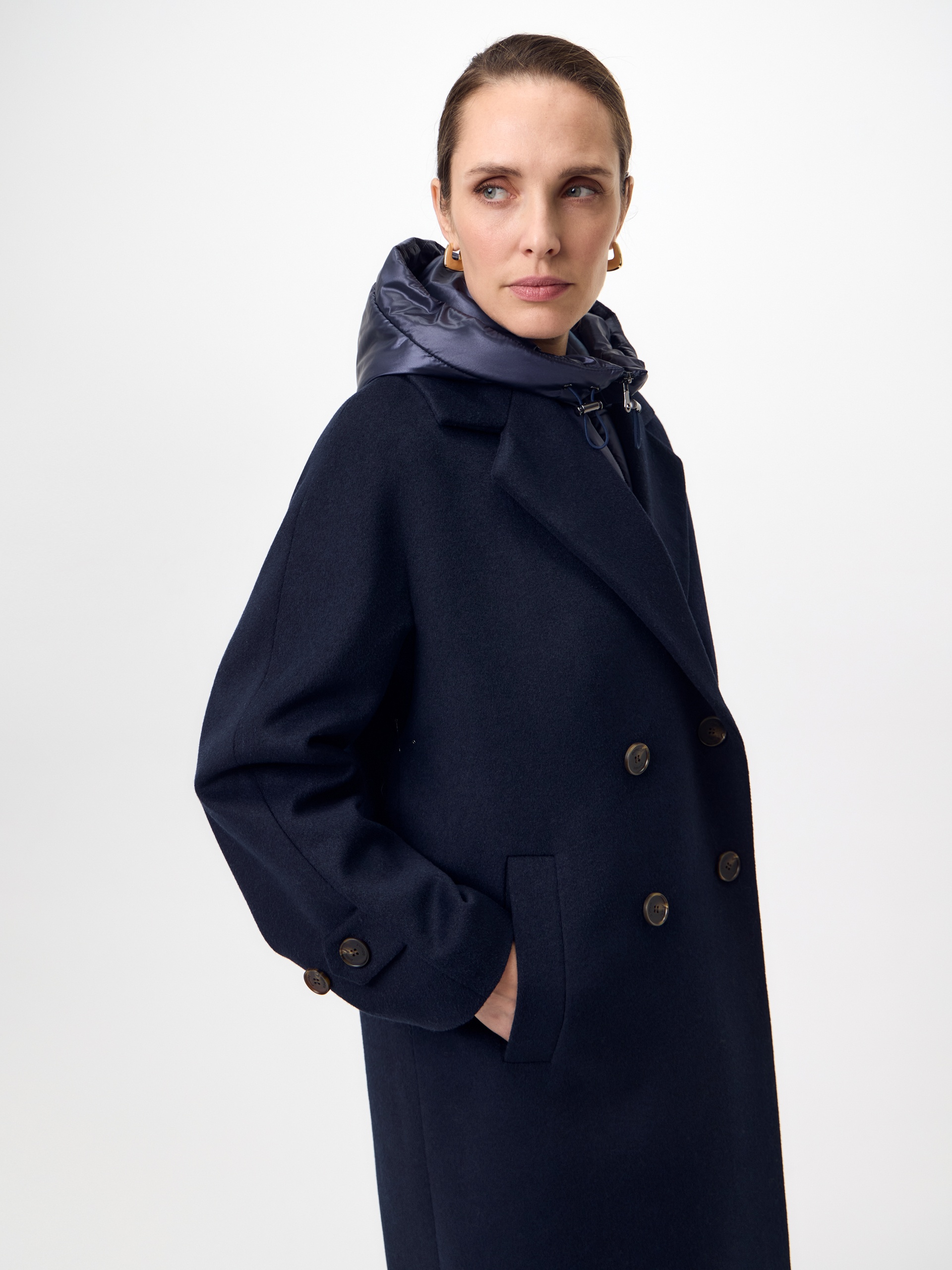 Пальто из шерсти с мембраной, утеплённой спинкой и съёмным капюшоном