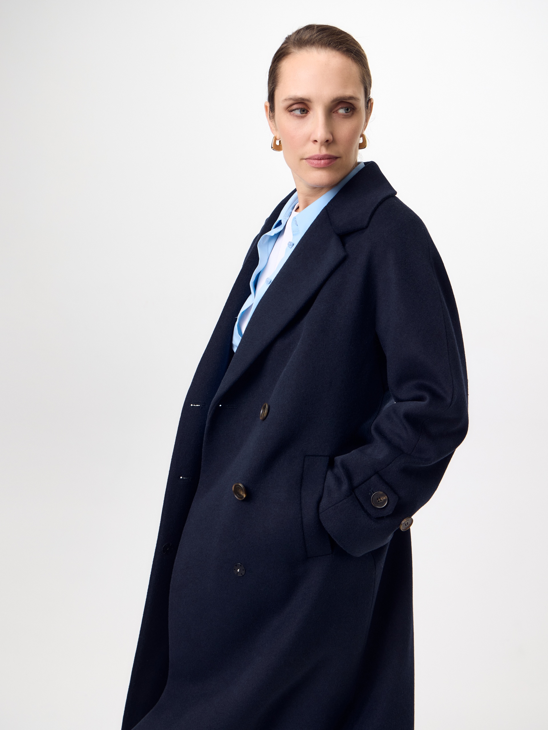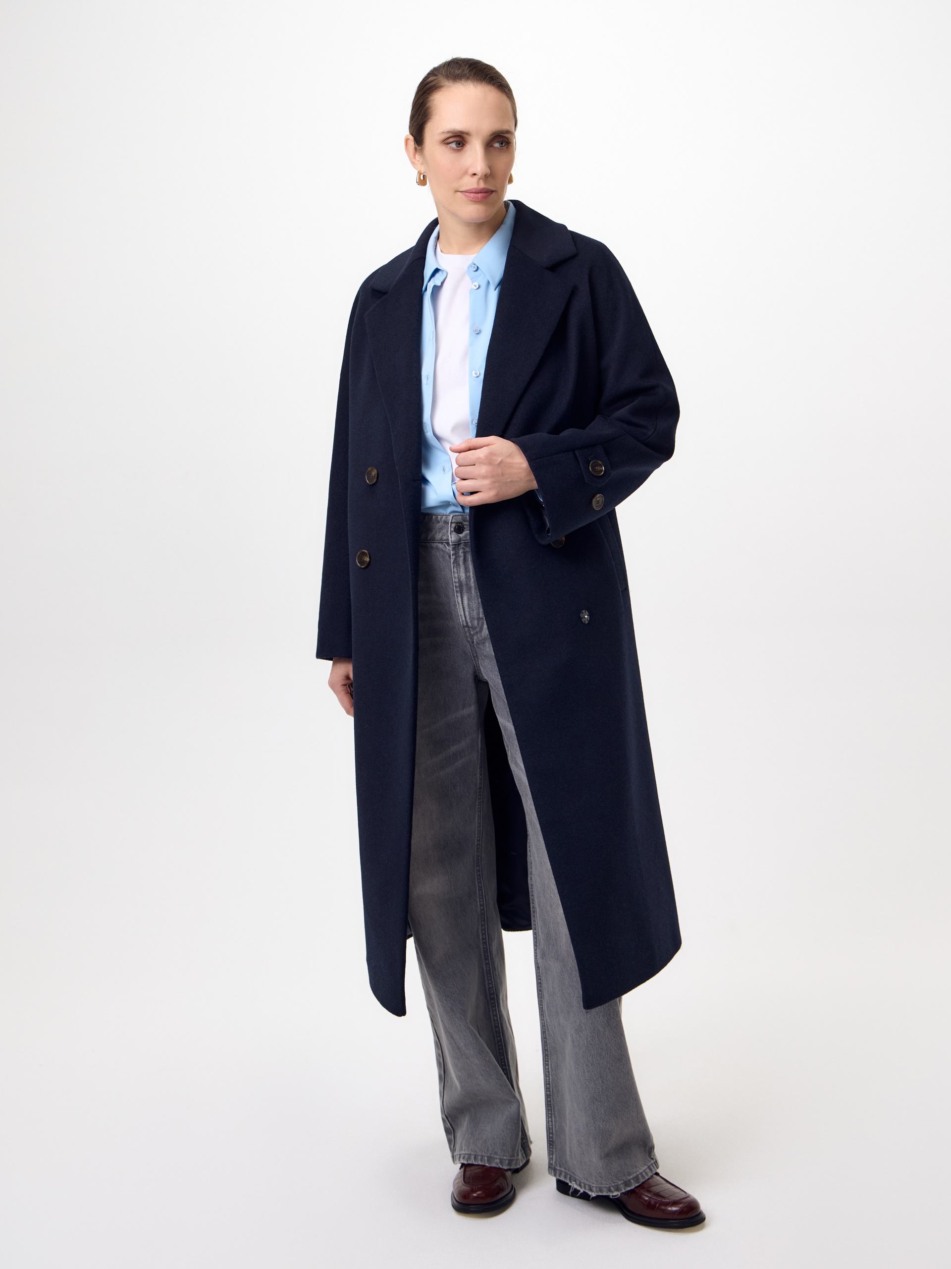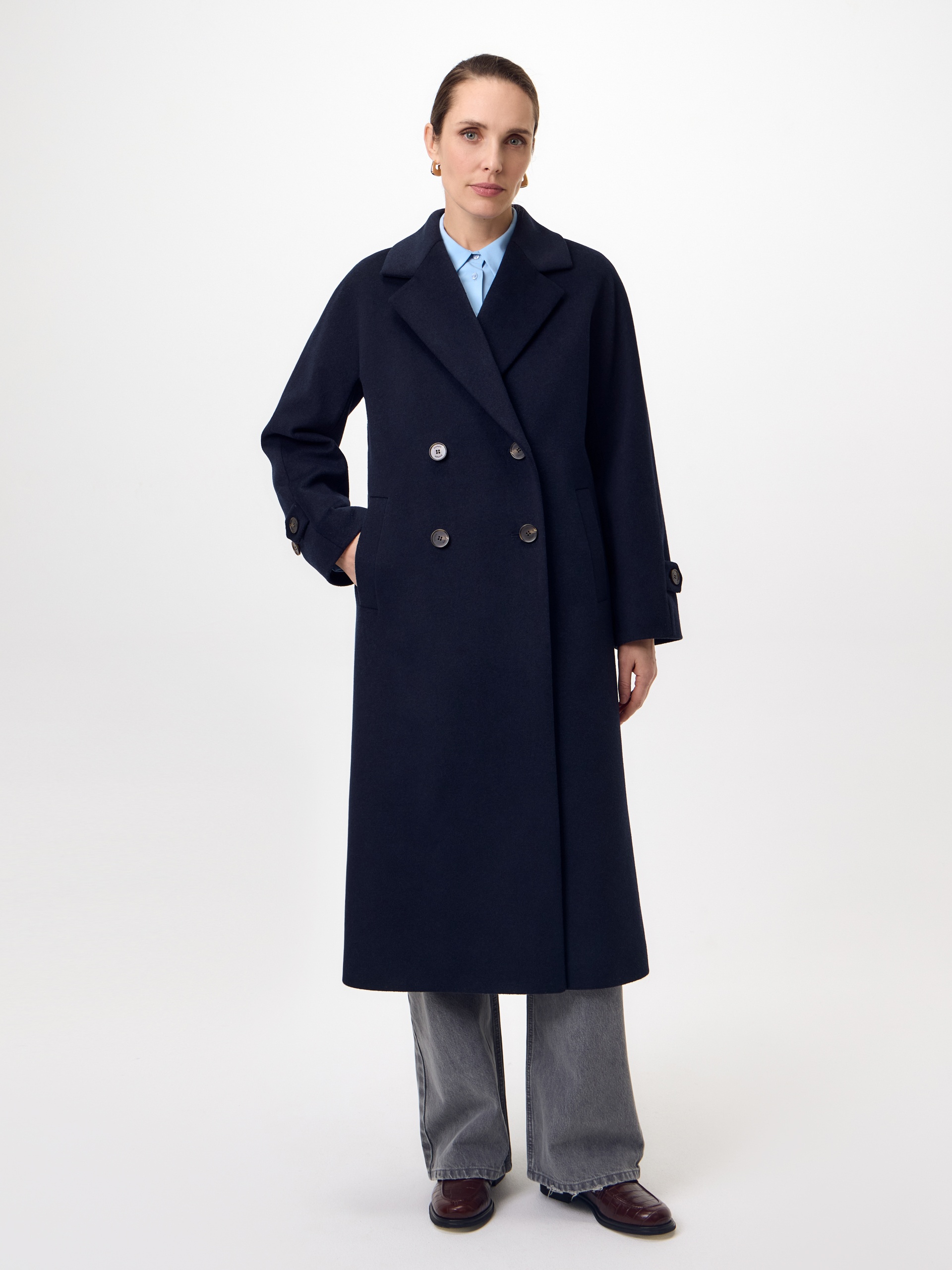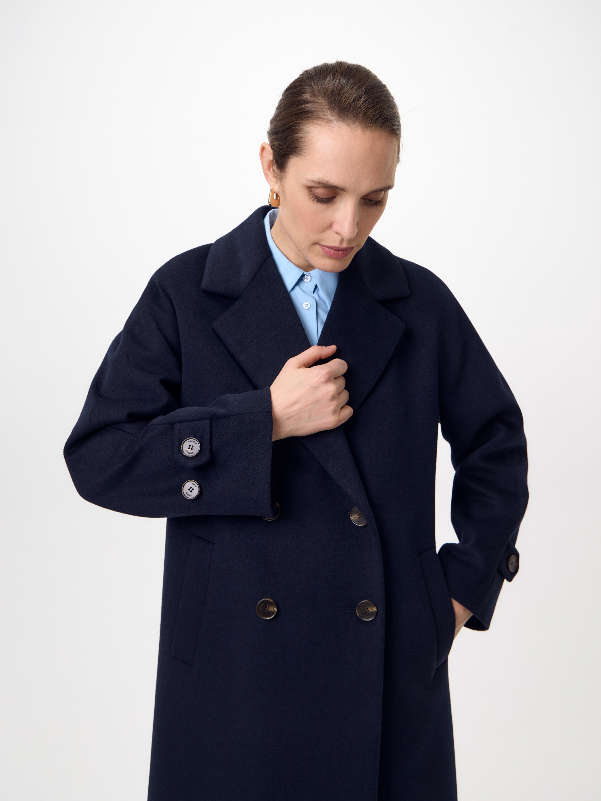 Объемное пальто прямого силуэта из премиальной шерстяной ткани в роскошном темно-синем оттенке. Классический английский воротник приобретает новую современную форму и стремится к застежке пальто, что зрительно вытягивает силуэт. Пальто имеет мягкую линию рукава, по низу которого рсположена встречная складка с фиксацией на пату для регулировки объема. Длина пальто ниже колена, в среднем шве спинки располагается высокая шлица. Застегивается изделие на ряд крупных стильных пуговиц. В комплекте с пальто предлагается теплый капюшон из плащевой ткани с водонепроницаемым покрытием. Такой капюшон надежно защитит от осадков, а универсальный цвет позволит сочетать его и с другими пальто нашей коллекции. А для наилучшей защиты от непогоды пальто произведено с использованием высокотехнологичной мембраны RaftPro, а его спинка имеет утепление инновационным утеплителем DuPont Sorona. Произведено в Санкт-Петербурге.