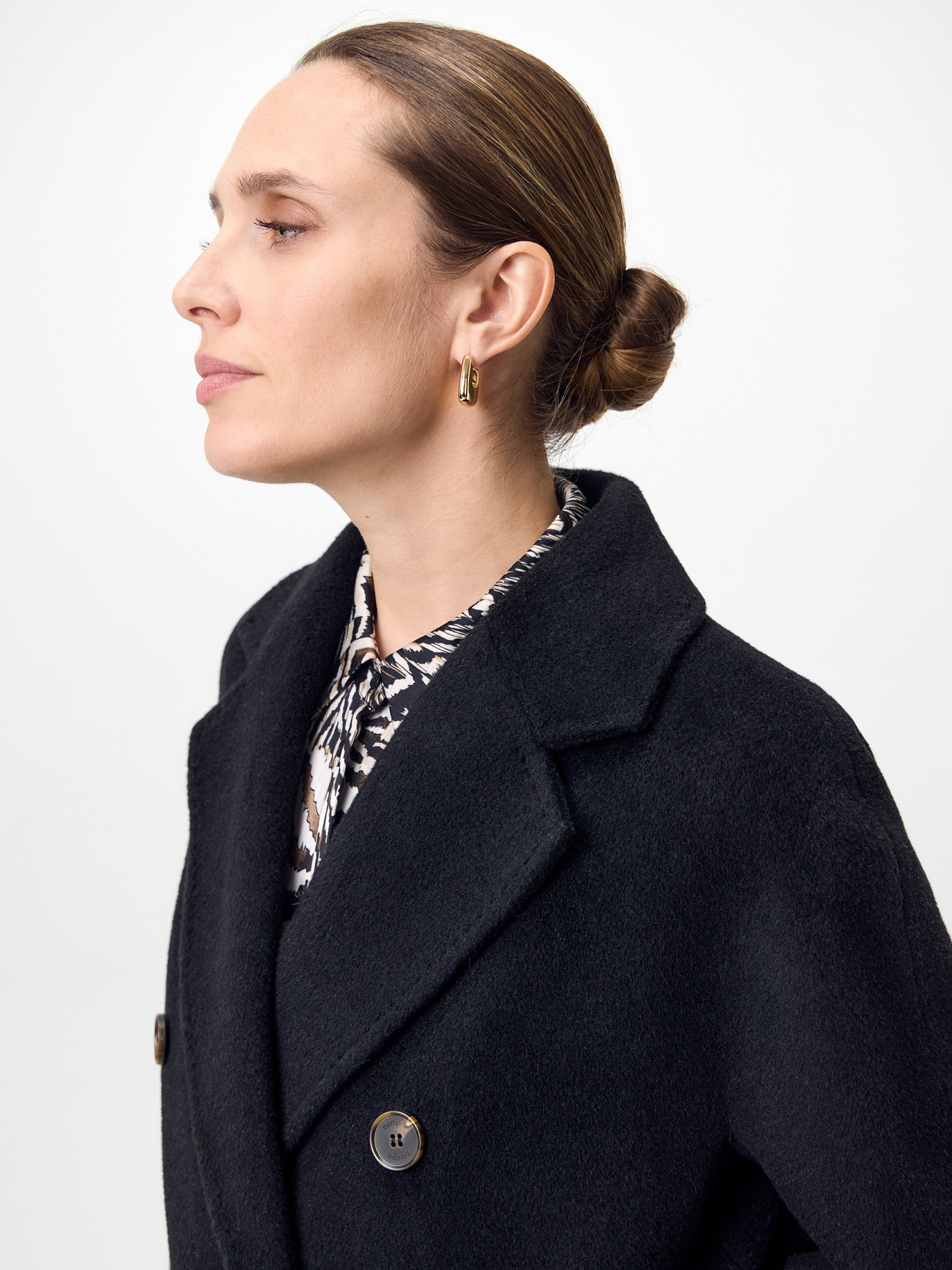 Двубортное пальто силуэта удлиненный кокон - это всем полюбившаяся классика пальто. Для данного изделия мы подобрали премиальную ворсовую шерстяную ткань с содержанием нежных волокон шелка. Пальто глубокого черного цвета и комфортной длины ниже колена, что расширяет возможности для формирования образов. Уникальный цельнокроеный рукав спереди и реглан на спинке создает уютный и расслабленный образ и не стесняет движений. Горловину пальто обрамляет классический широкий английский воротник. Пальто имеет два глубоких кармана с листочками. Застегивается на два ряда стильных крупных пуговиц. Дополняет образ съемный пояс, благодаря которому можно подчеркнуть талию. А для наилучшей защиты от непогоды пальто выполнено с использованием высокотехнологичной мембраны RaftPro, а спинка пальто имеет дополнительное утепление инновационным утеплителем DuPont Sorona. Произведено в Санкт-Петербурге.