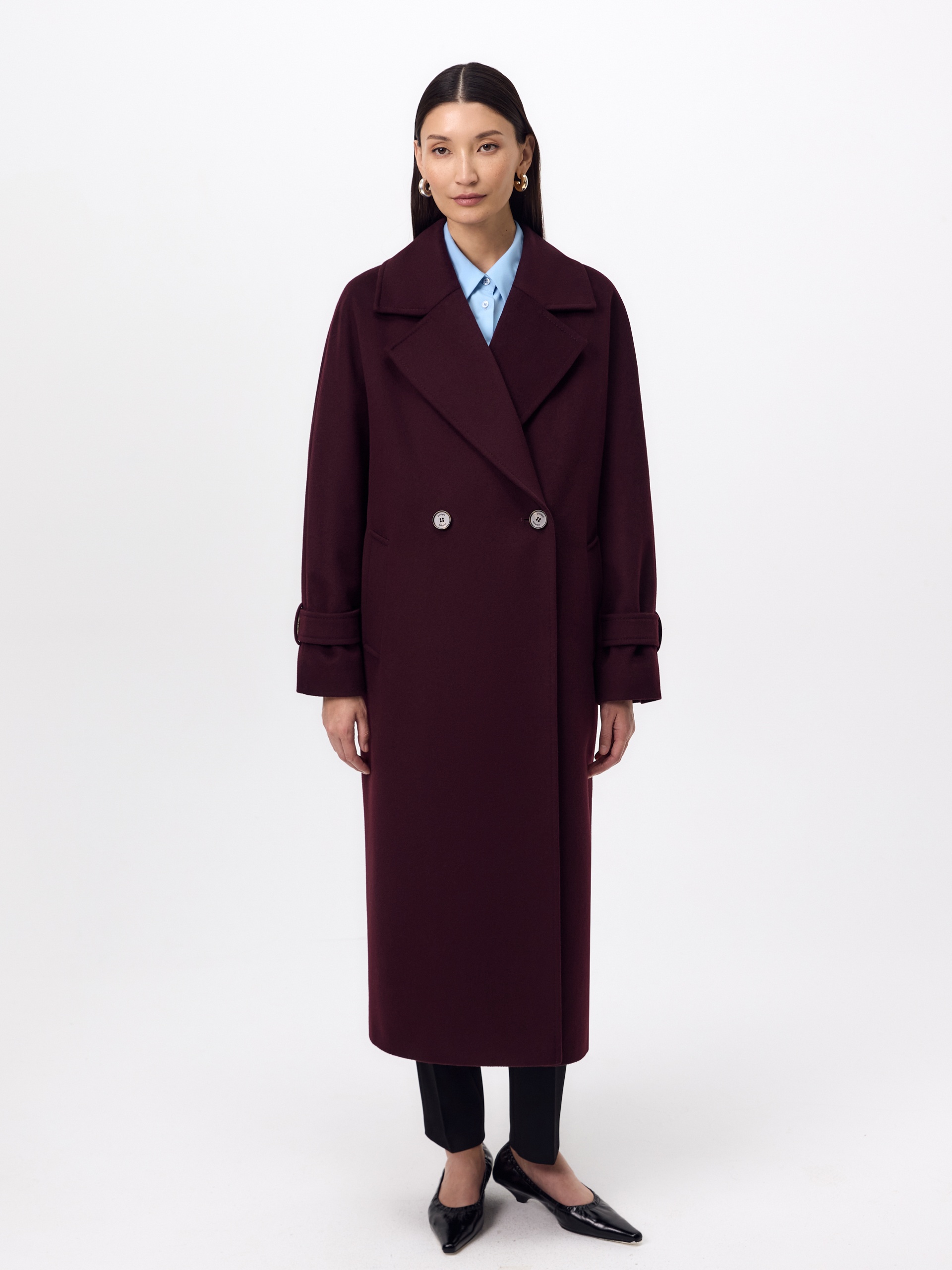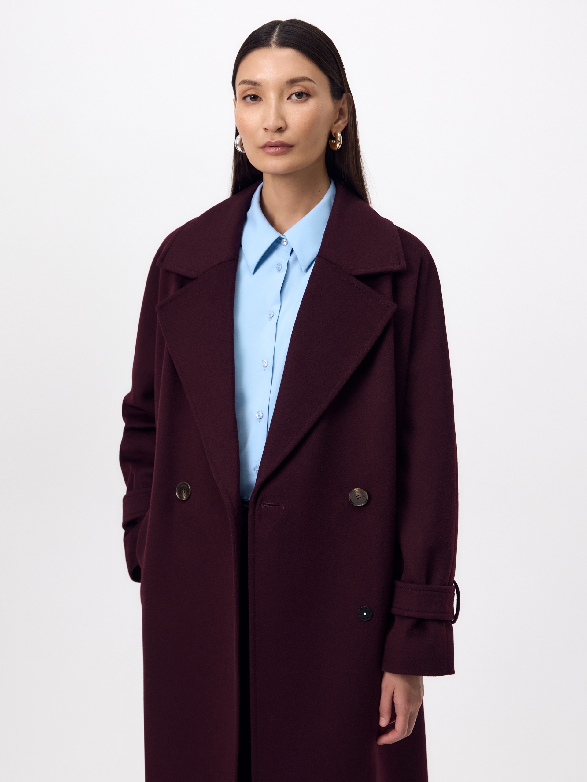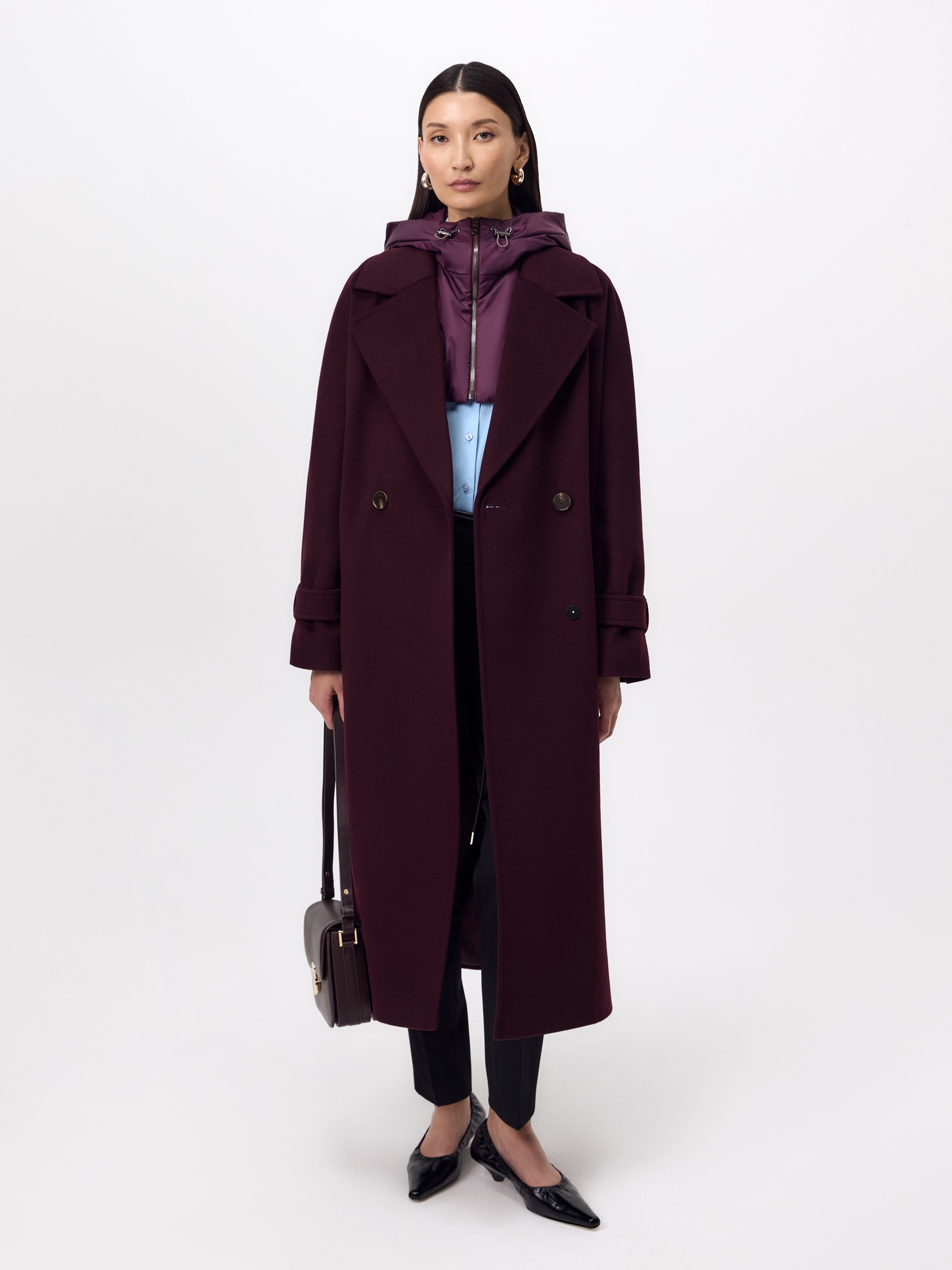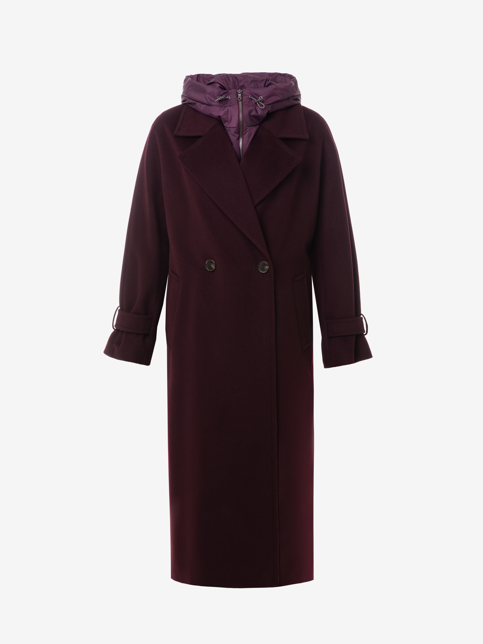 Классическое двубортное пальто силуэта "удлиненный кокон" в классическом винном оттенке. Пальто сшито из премиальной ворсовой ткани с высоким содержанием шерсти. Широкий английский воротник с новой современной конструкцией лацкана и свободный комбинированный рукав делают пальто стильным и удобным. Низ рукава оформлен декоративной патой. По бокам расположены глубокие карманы с листочками. В среднем шве спинки высокая шлица. Застегивается пальто на пару крупных пуговиц и пришивные кнопки. Образ дополняет пояс из основной ткани. Длина пальто ниже колена. В комплекте с пальто предлагается теплый капюшон из плащевой ткани с водонепроницаемым покрытием. Такой капюшон надежно защитит от осадков, а универсальный цвет позволит сочетать его и с другими пальто нашей коллекции. А для наилучшей защиты от непогоды пальто произведено с использованием высокотехнологичной мембраны RaftPro, а его спинка имеет дополнительное утепление инновационным утеплителем DuPont Sorona. Произведено в Санкт-Петербурге.