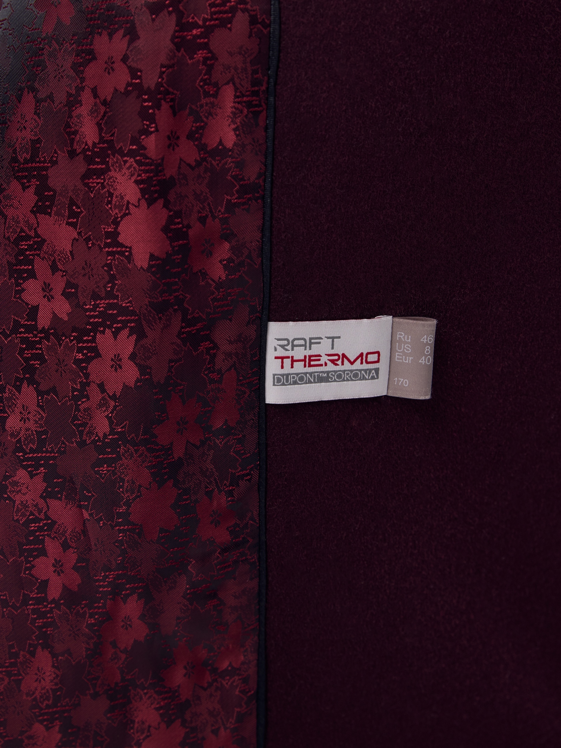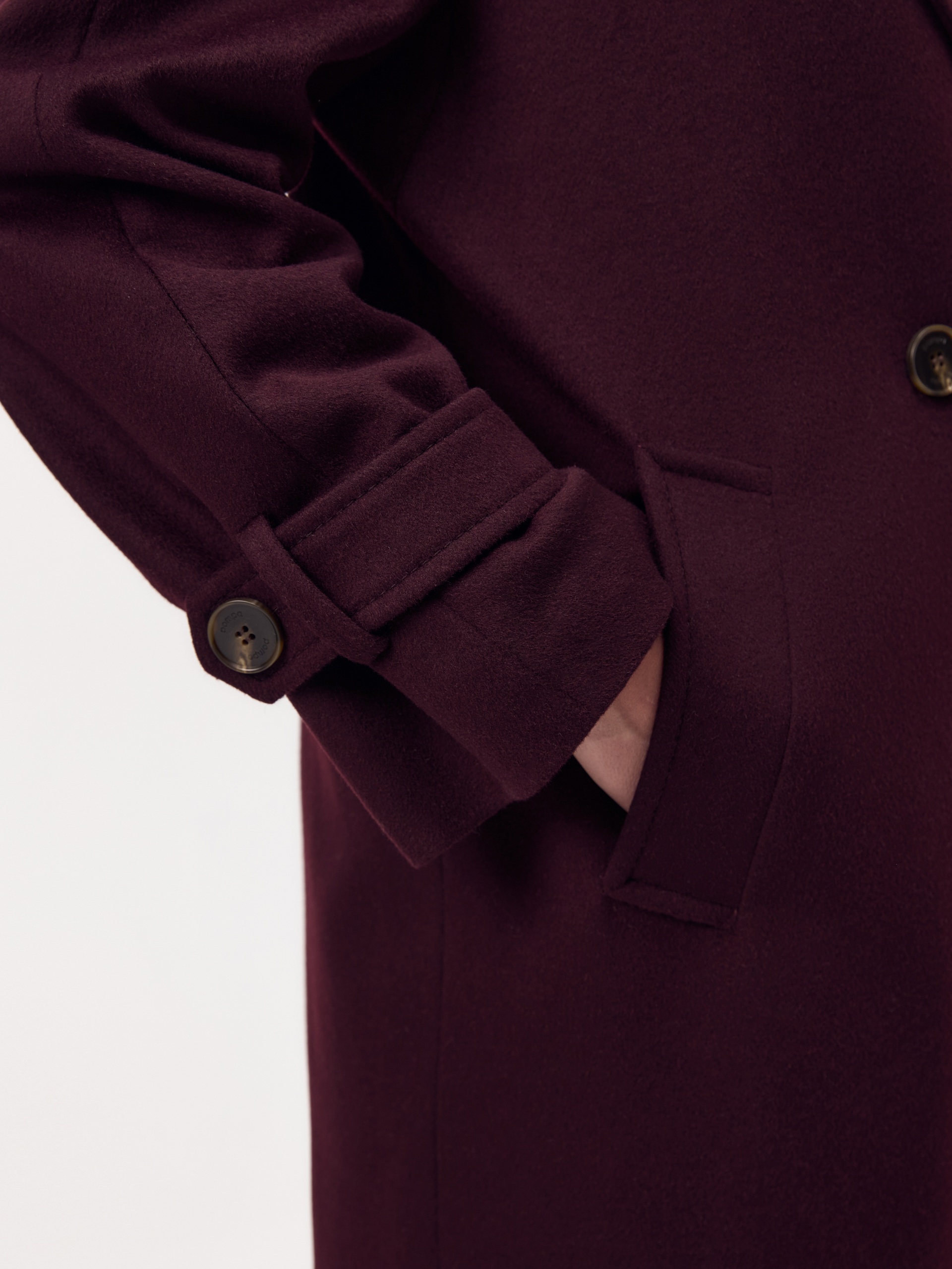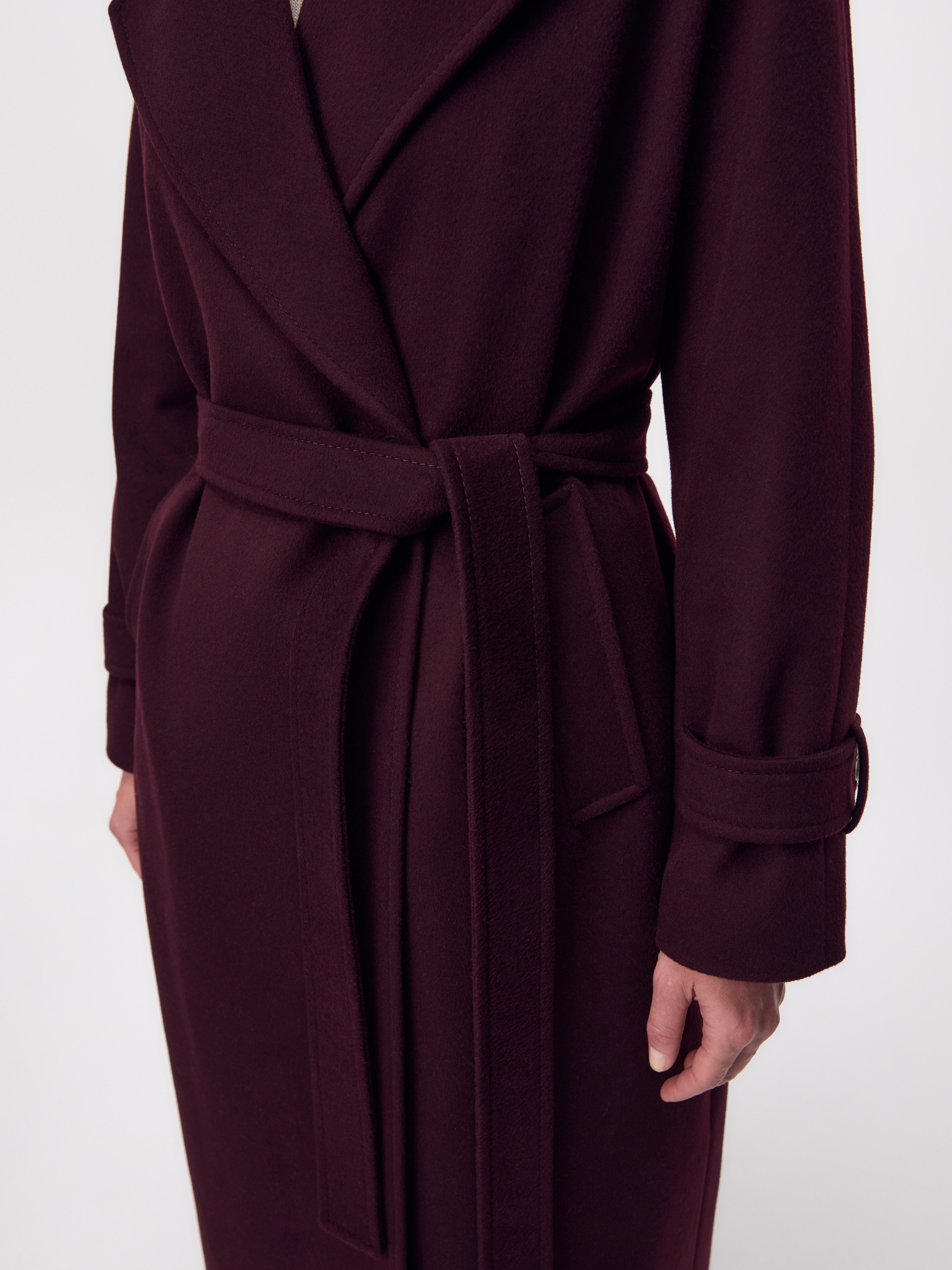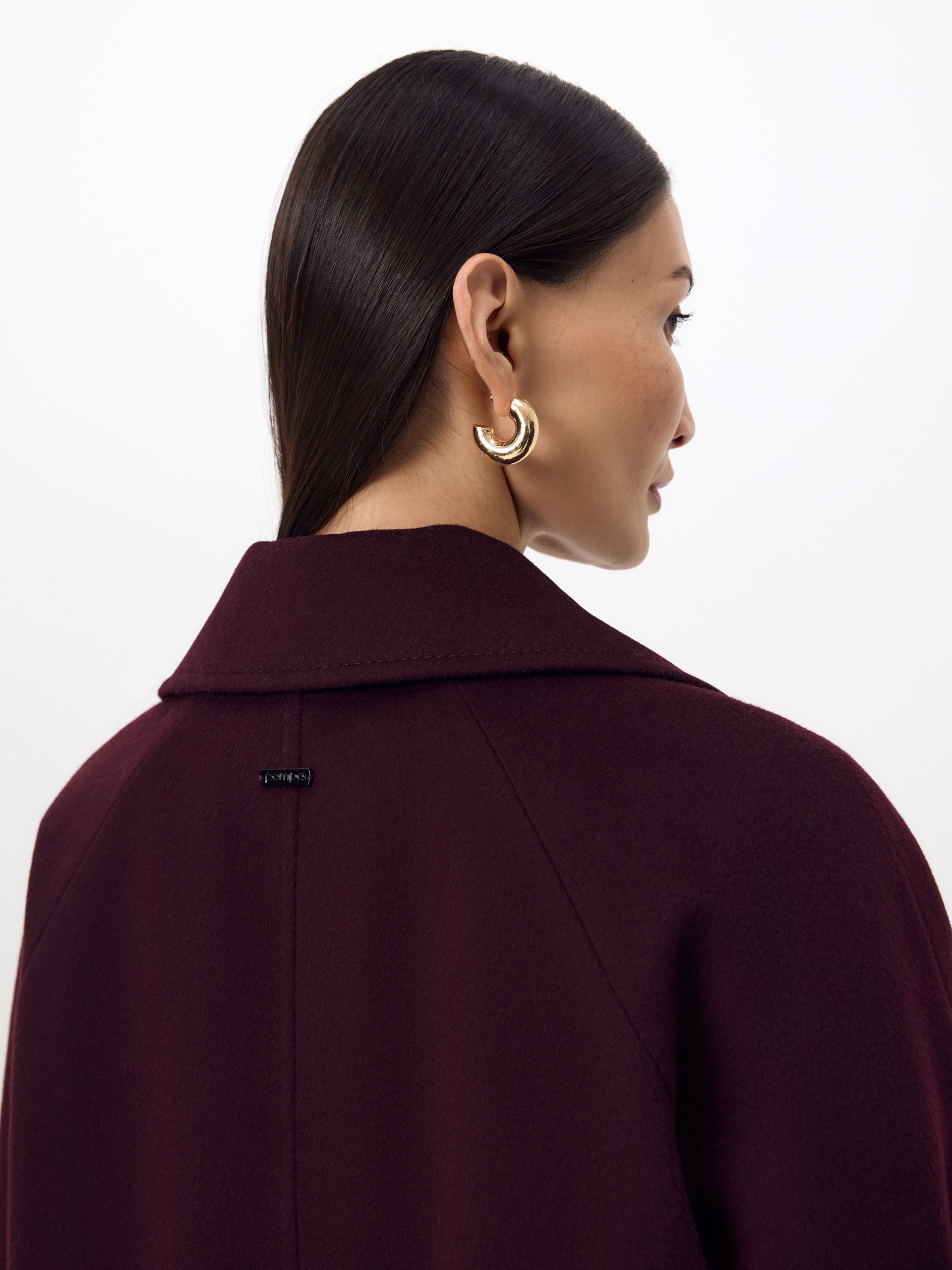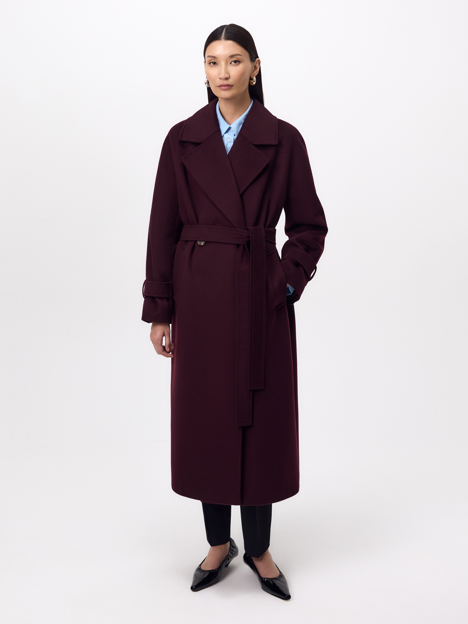 Классическое двубортное пальто силуэта "удлиненный кокон" в классическом винном оттенке. Пальто сшито из премиальной ворсовой ткани с высоким содержанием шерсти. Широкий английский воротник с новой современной конструкцией лацкана и свободный комбинированный рукав делают пальто стильным и удобным. Низ рукава оформлен декоративной патой. По бокам расположены глубокие карманы с листочками. В среднем шве спинки высокая шлица. Застегивается пальто на пару крупных пуговиц и пришивные кнопки. Образ дополняет пояс из основной ткани. Длина пальто ниже колена. В комплекте с пальто предлагается теплый капюшон из плащевой ткани с водонепроницаемым покрытием. Такой капюшон надежно защитит от осадков, а универсальный цвет позволит сочетать его и с другими пальто нашей коллекции. А для наилучшей защиты от непогоды пальто произведено с использованием высокотехнологичной мембраны RaftPro, а его спинка имеет дополнительное утепление инновационным утеплителем DuPont Sorona. Произведено в Санкт-Петербурге.