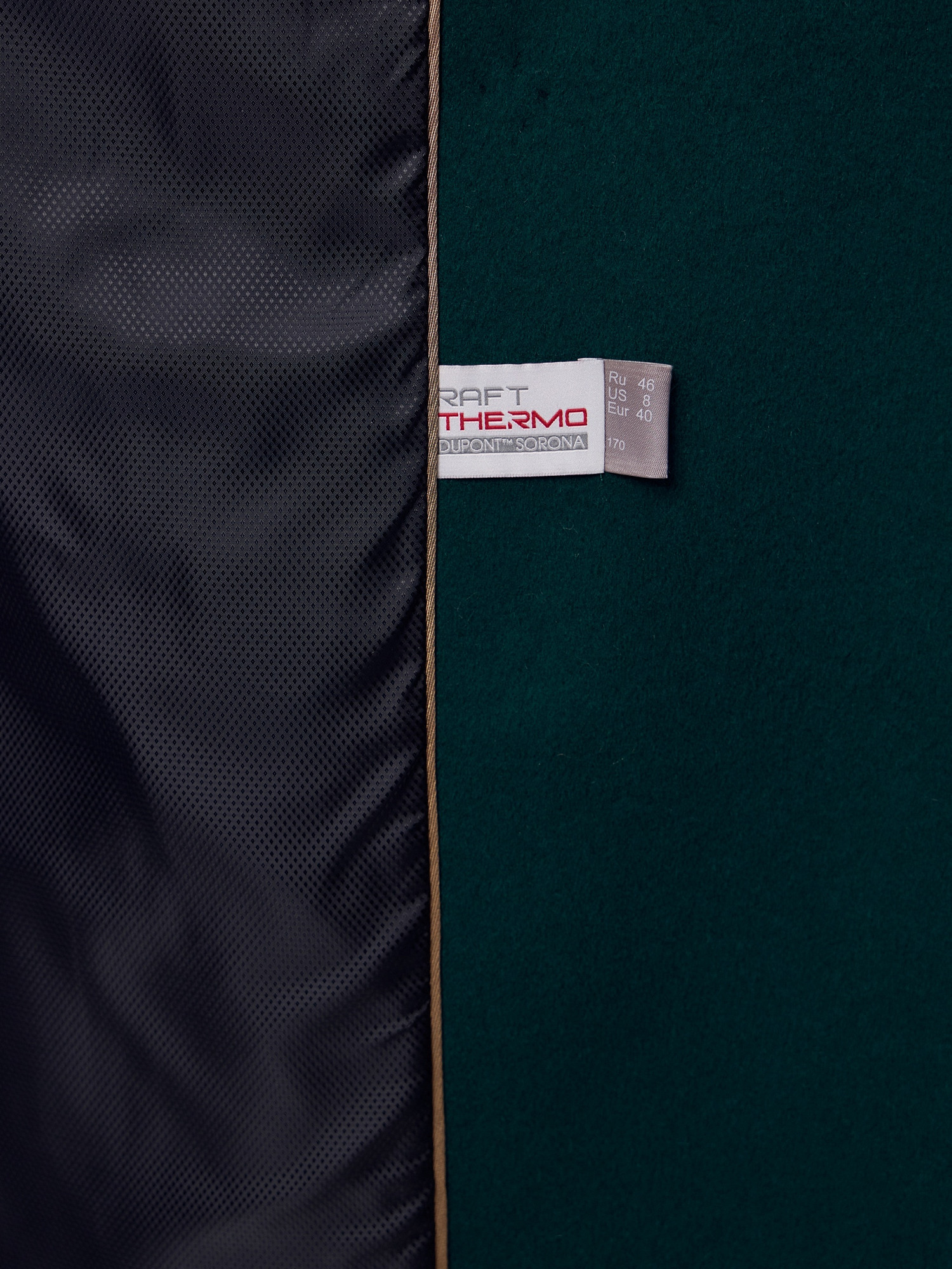 Полюбившаяся классика - двубортное пальто силуэта "удлинённый кокон", в этом сезоне представлена в обновлённом варианте. Пальто сшито из премиальной ворсовой ткани с высоким содержанием натуральной шерсти. Трендовый изумрудный цвет, свободный рубашечный рукав и классический английский воротник делают его стильным и удобным. Застёжка на ряд надёжных пришивных кнопок, по бокам располагаются вместительные карманы с листочками. Спинка имеет дополнительное утепление. В комплекте с пальто предлагается тёплый капюшон из плащевой ткани с водоотталкивающим покрытием, надёжно защищающий от осадков. А для наилучшей защиты от ветра и непогоды пальто выполнено с использованием высокотехнологичной мембраны RaftPro. Произведено в Санкт-Петербурге.