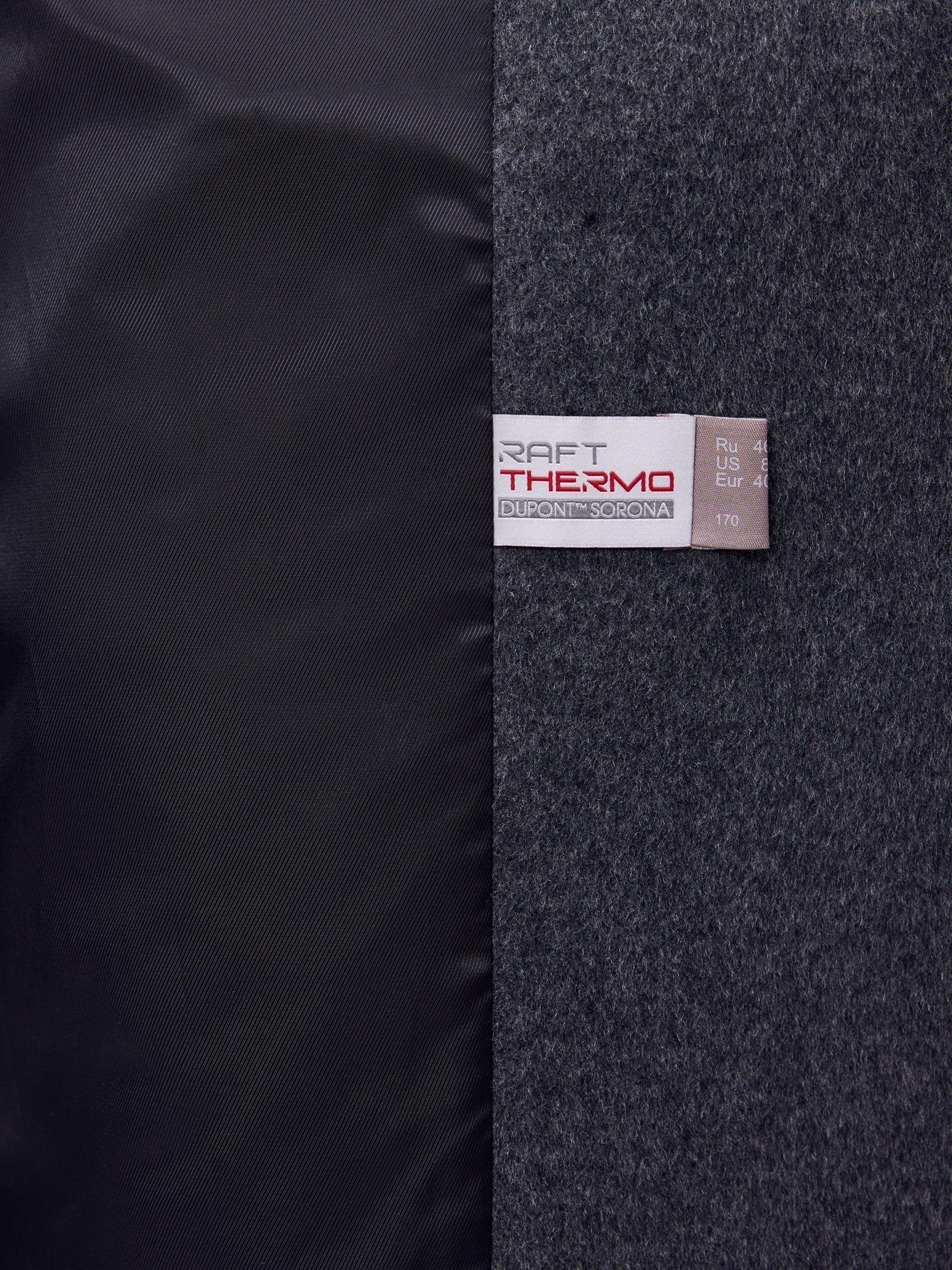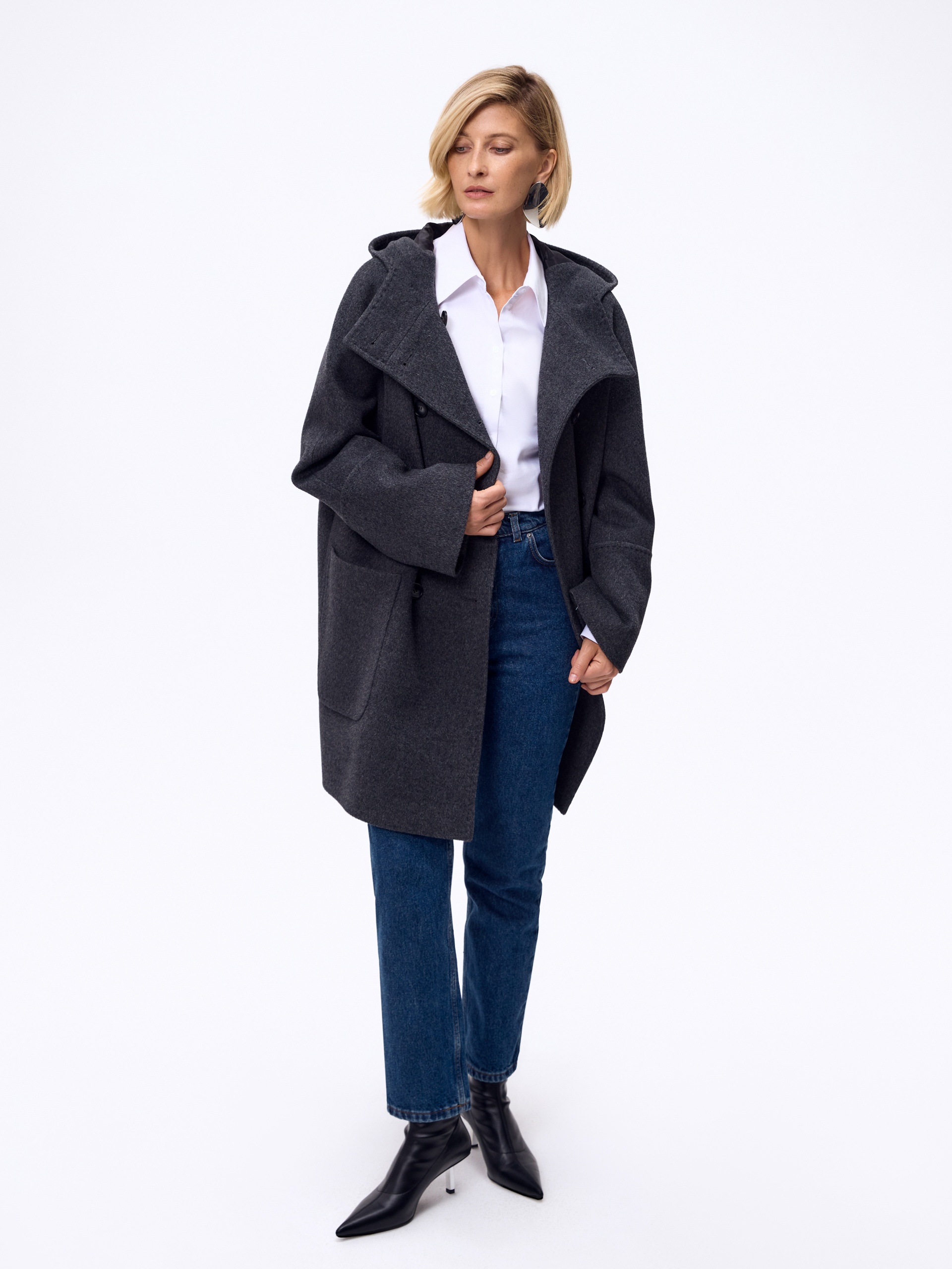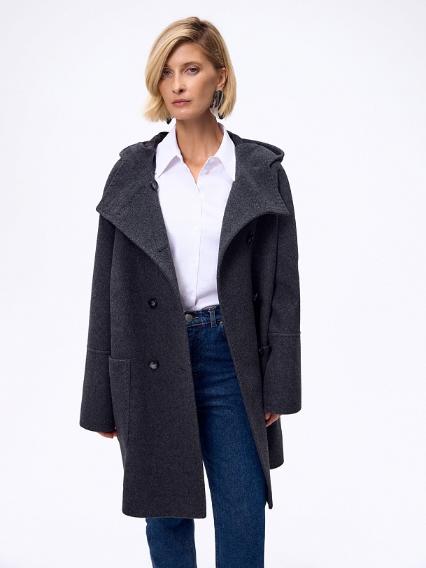 Объёмное полупальто из ворсовой ткани с высоким содержанием натуральной шерсти и утеплённой спинкой. Для этой модели мы выбрали ткань в актульном цвете графит. Высокий воротник-стойка переходит в глубокий капюшон и надёжно защищает от холода и ветра. Цельнокроеный рукав не стесняет движений, по бокам располагаются накладные карманы. Застёжка на два ряда крупных брендированных пуговиц. А для наилучшей защиты от непогоды изделие выполнено с использованием высокотехнологичной мембраны RaftPro и инновационного утеплителя DuPont Sorona. Произведено в Санкт-Петербурге.