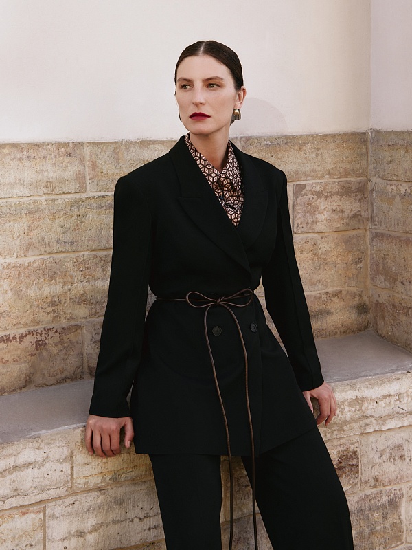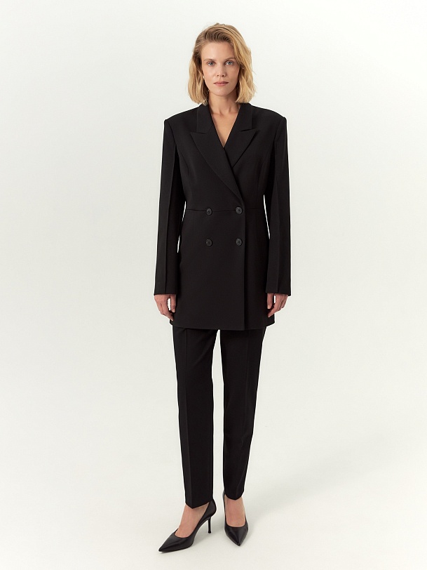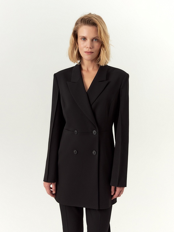 Приталенный двубортный удлиненный жакет с острым английским воротником и V-образным вырезом, из костюмной ткани черного цвета. Рукава широкие с заутюженной стрелкой. Жакет на подкладке.