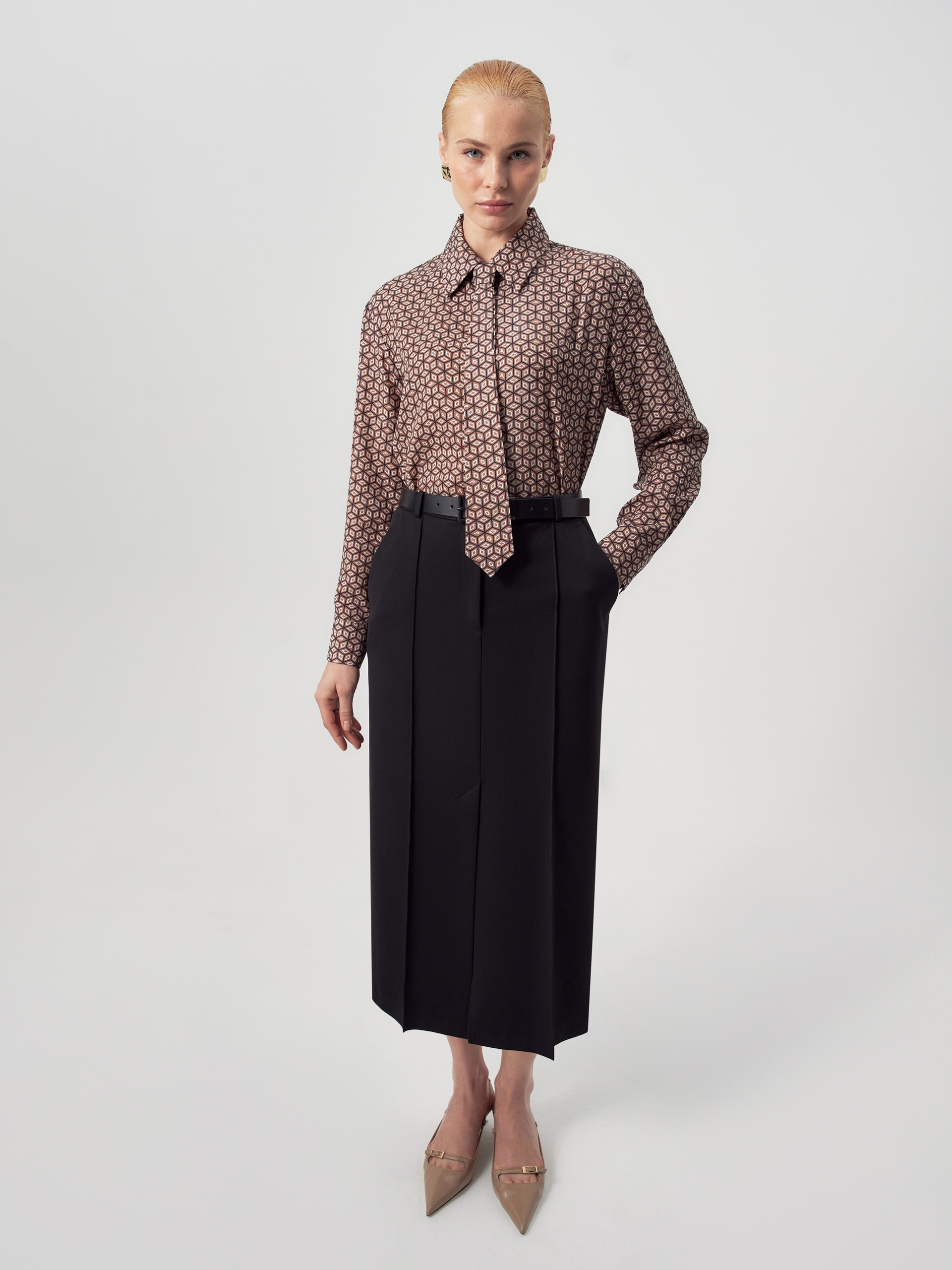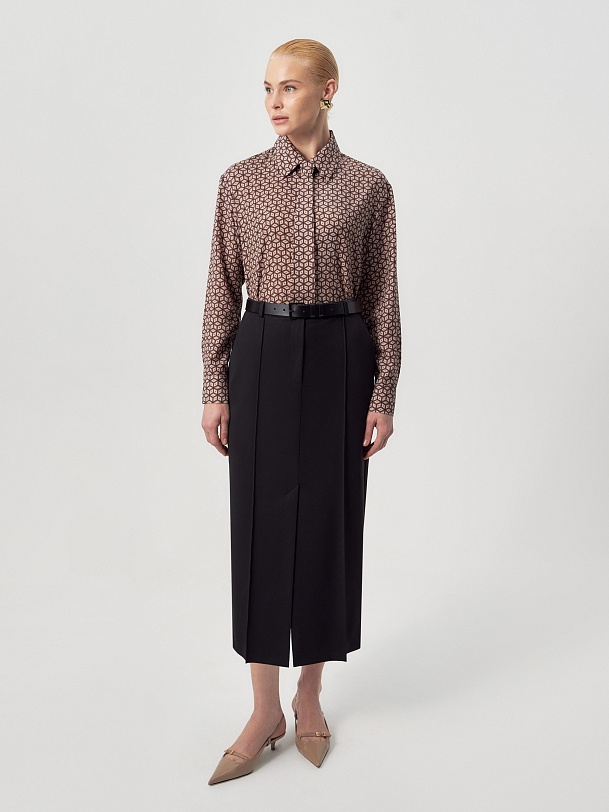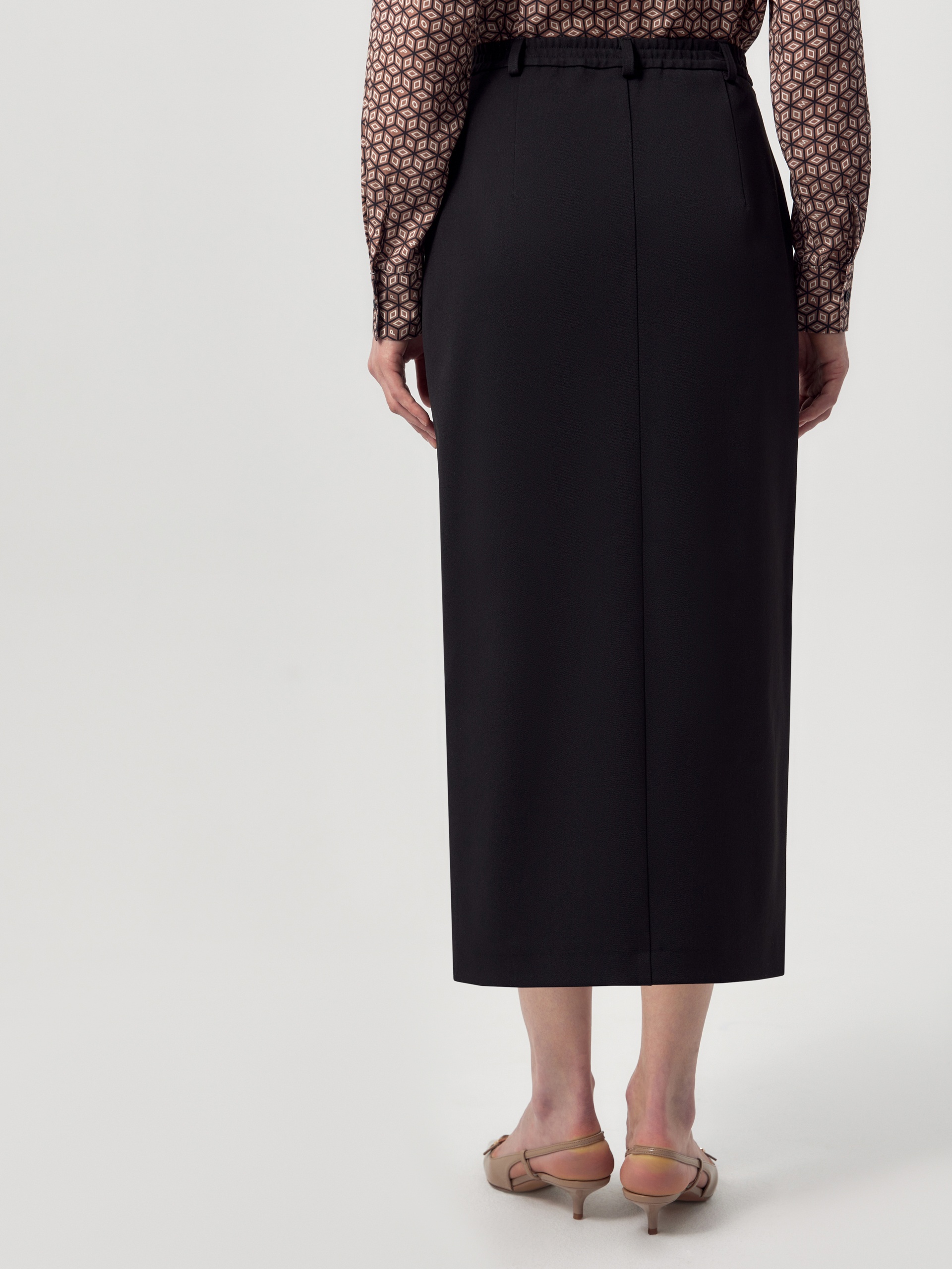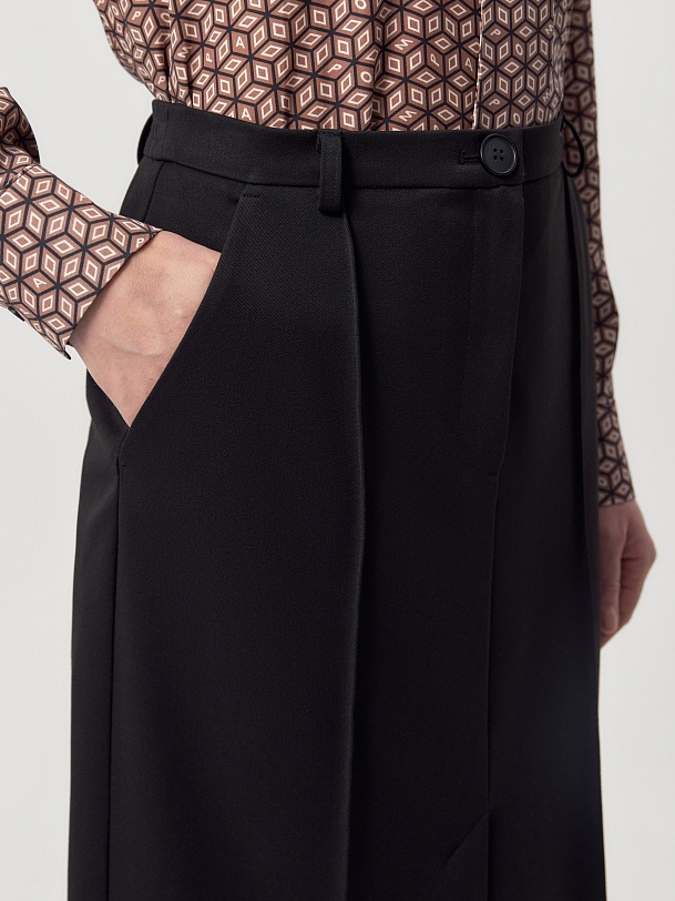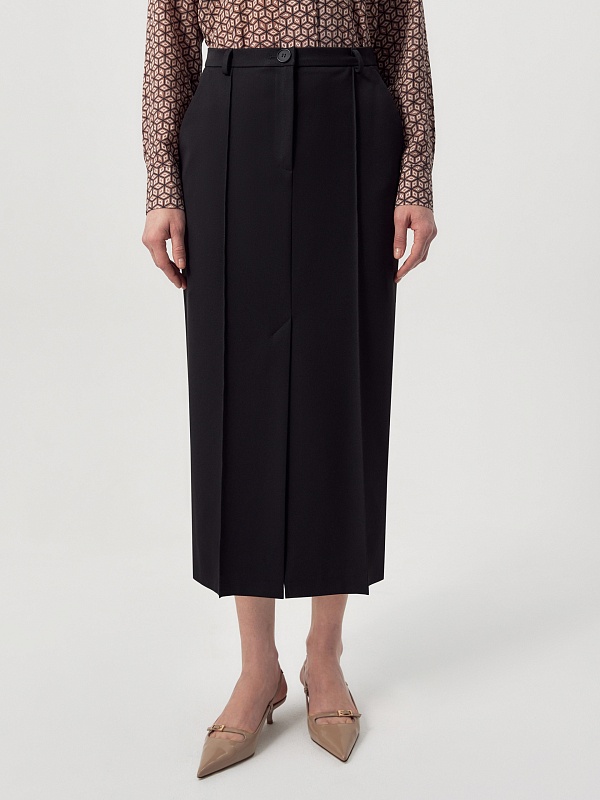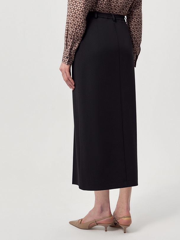 Прямая юбка за колено из черной костюмной ткани на средней посадке со шлевками. Спереди боковые карманы и застежка на молнию и пуговицу. По переду рельефы с отстрочками и шлица.