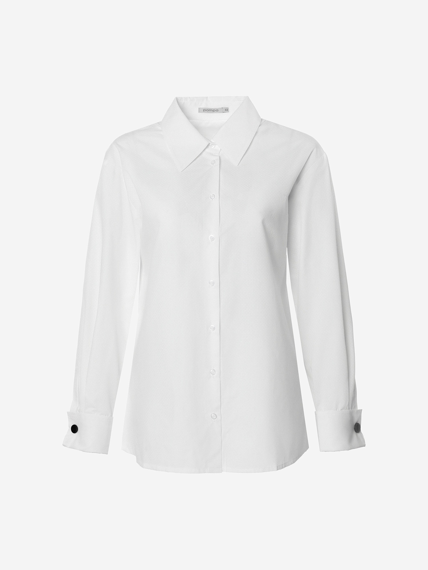 Прямая белая блуза из жаккардовой ткани с отложным воротником, планка на пуговицах. Рукава втачные с лаконичными запонками на манжетах.