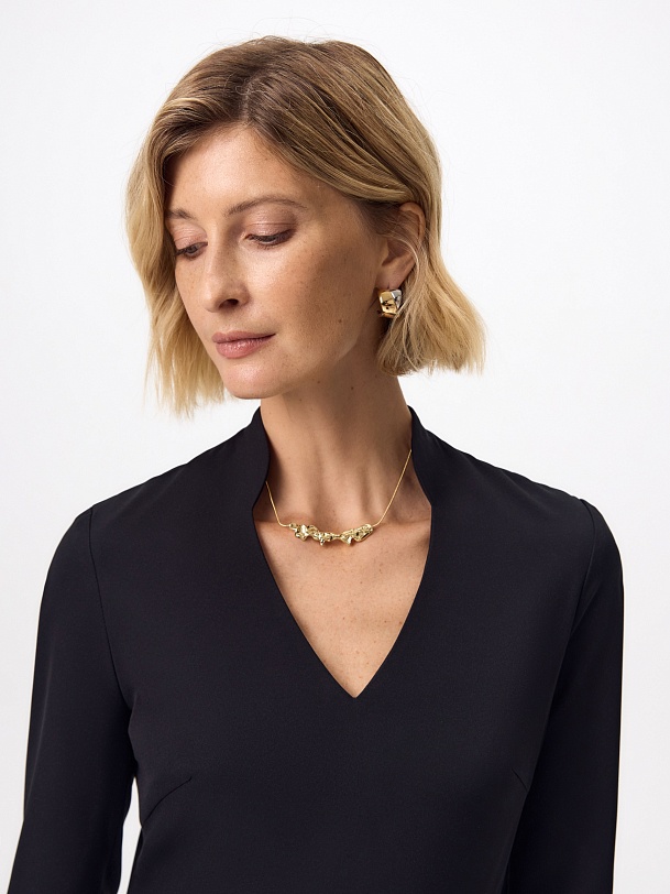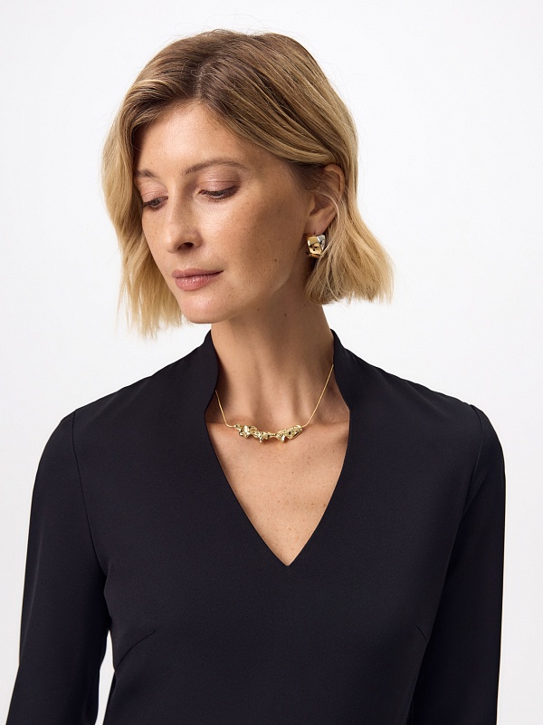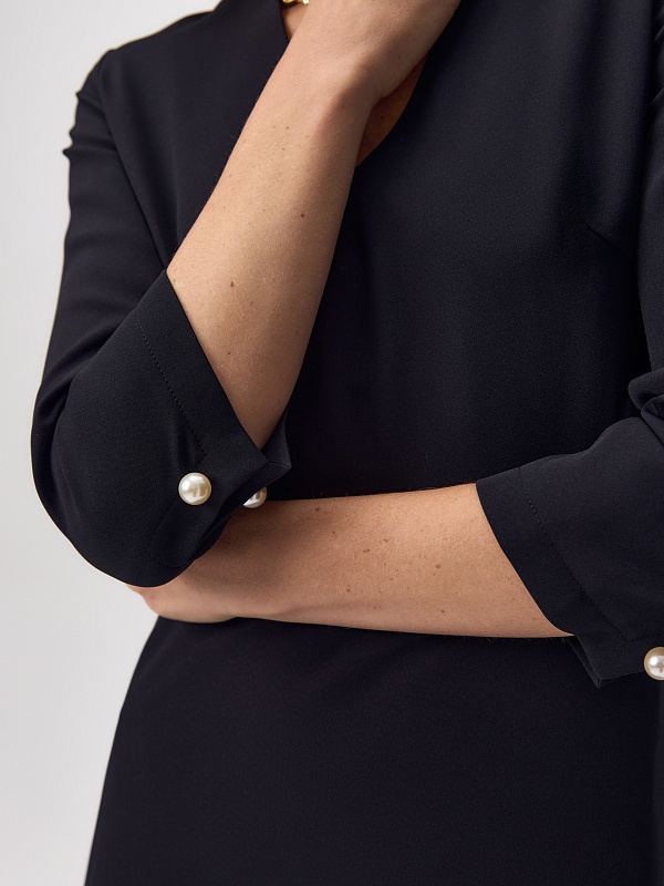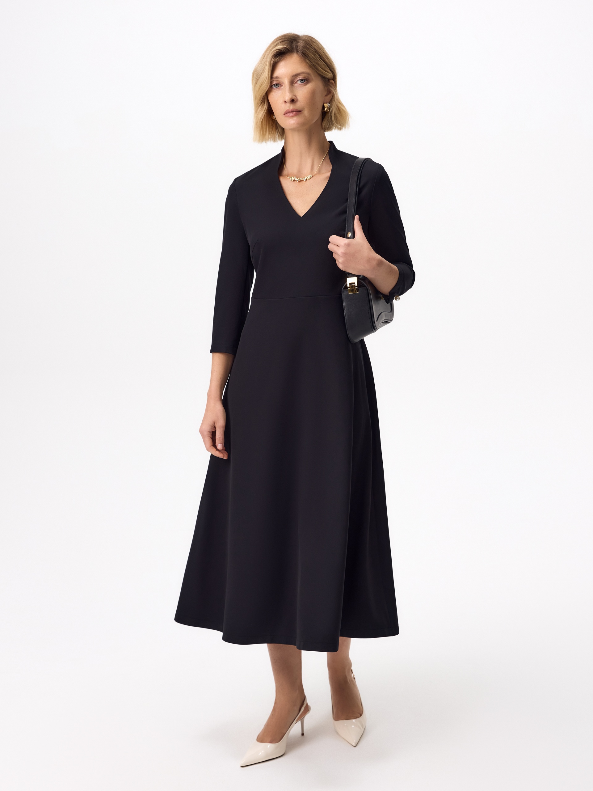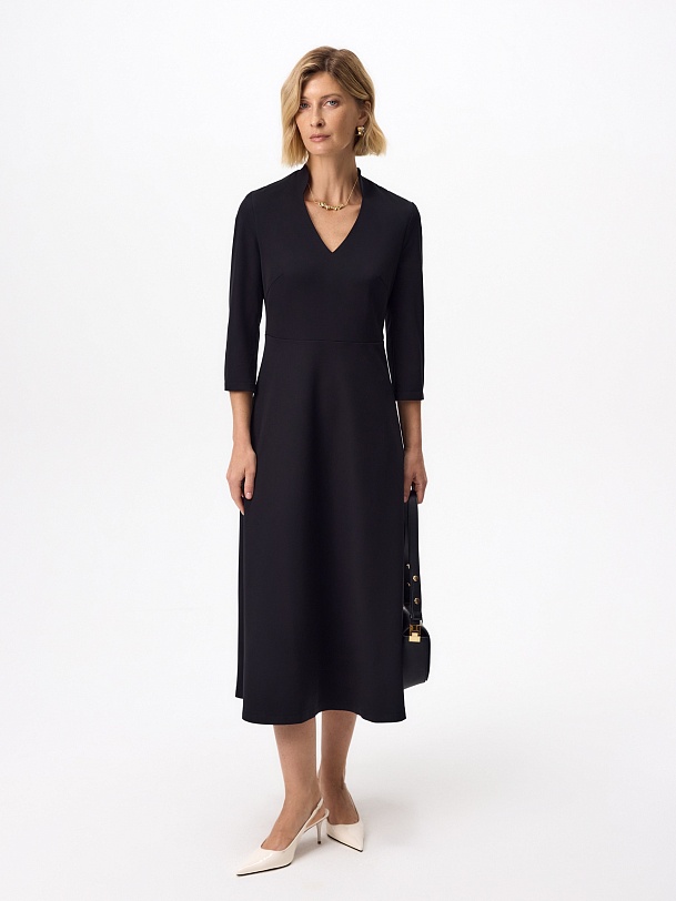 Приталенное платье с расклешенной юбкой, цельнокроеным воротником и V-образной горловиной, рукав втачной длиной за локоть с разрезами и жемчужной булавкой, потайная молния на спинке.