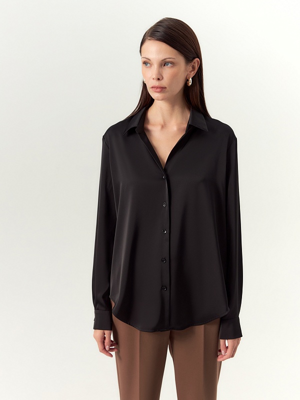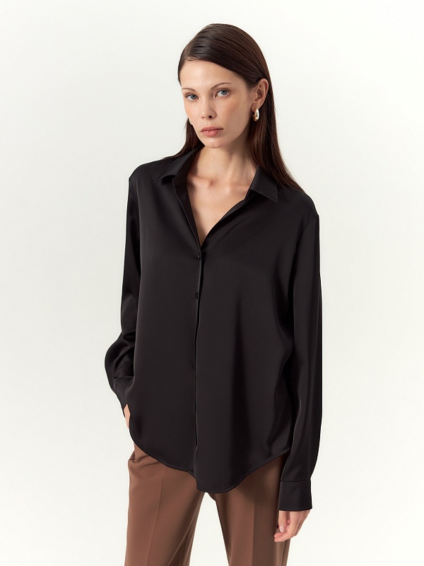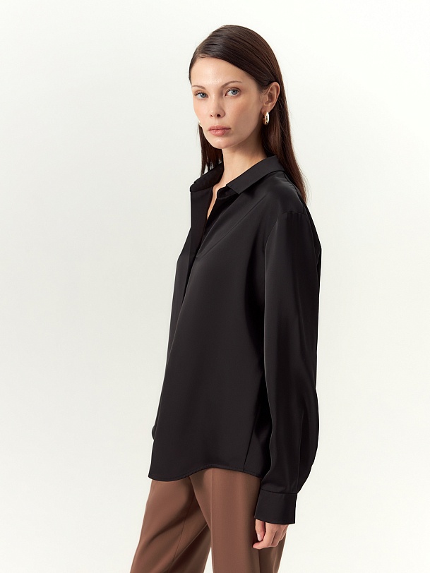 Блуза полуприлегающего силуэта из атласной ткани с пуговицами на планке и отложным воротником, рукав втачной на манжете. Спинка длиннее полочек и круглый низ.