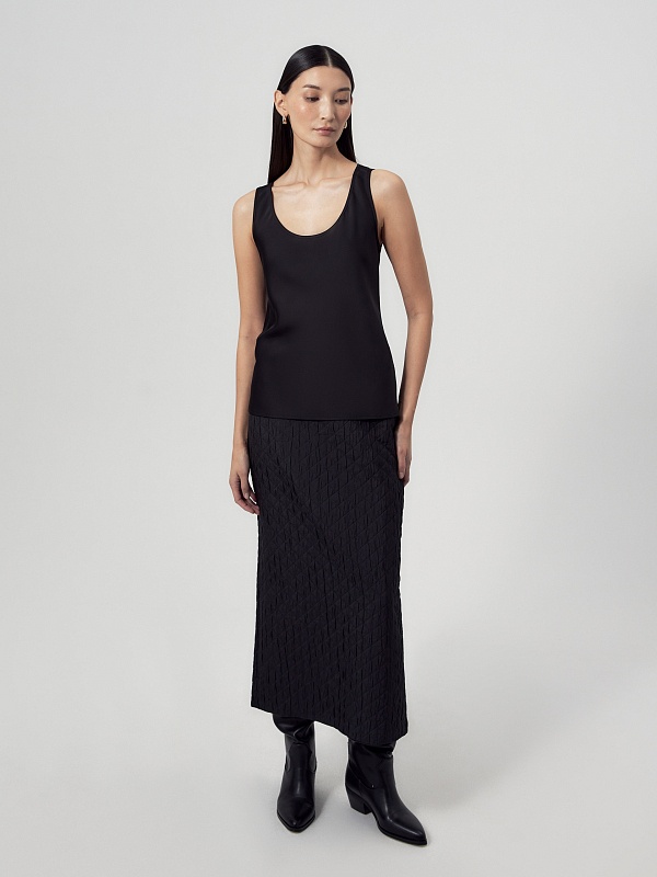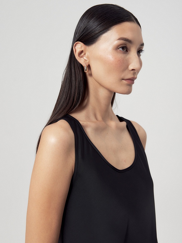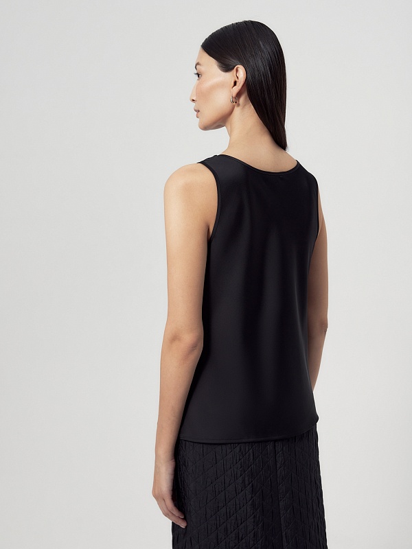Блуза прямого силуэта с круглой горловиной и узкими лямками из блузочной атласной ткани.
