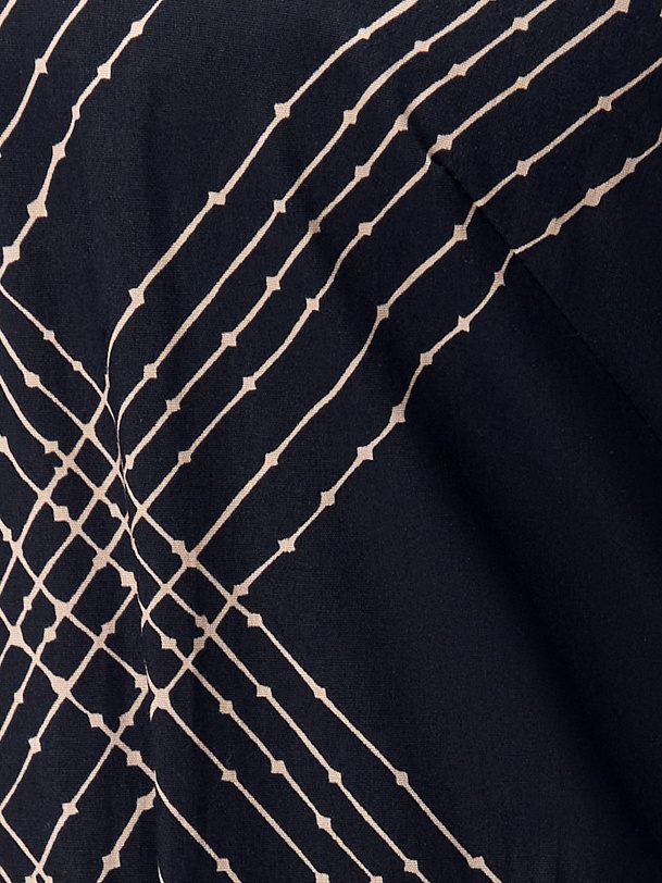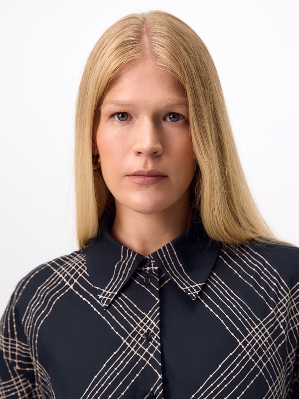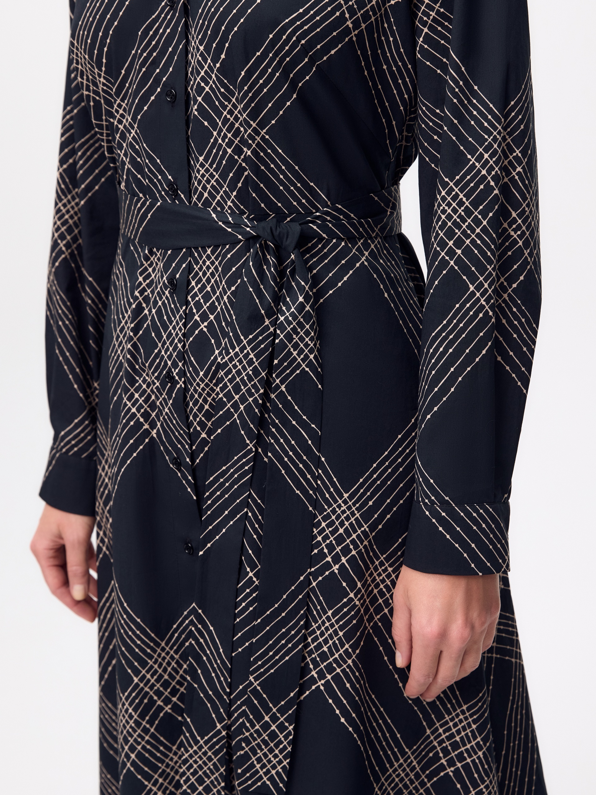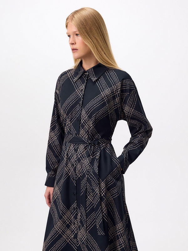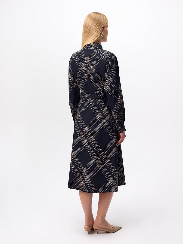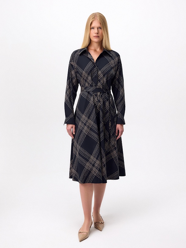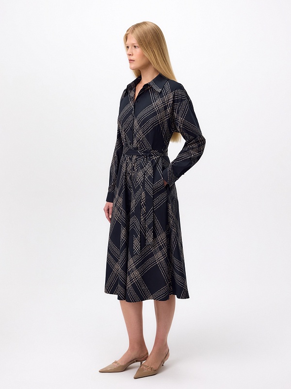 Классическое приталенное платье из принтованной хлопковой ткани на пуговицах. Линия плеча спущена для создания более мягкого образа и добавления объема. Рукав на манжете. Юбка - колокол. В комплекте идет пояс из основной ткани.