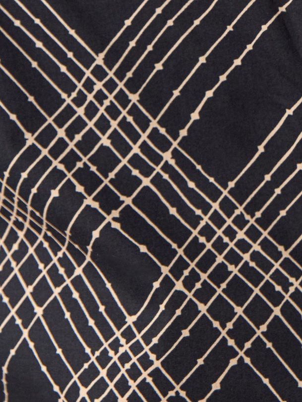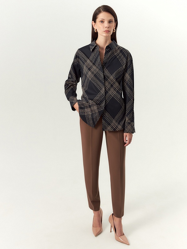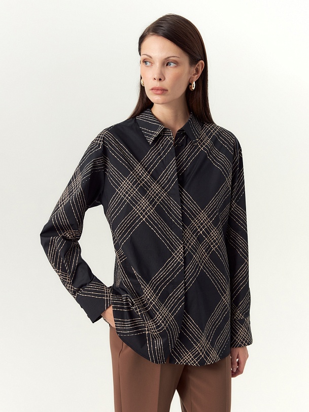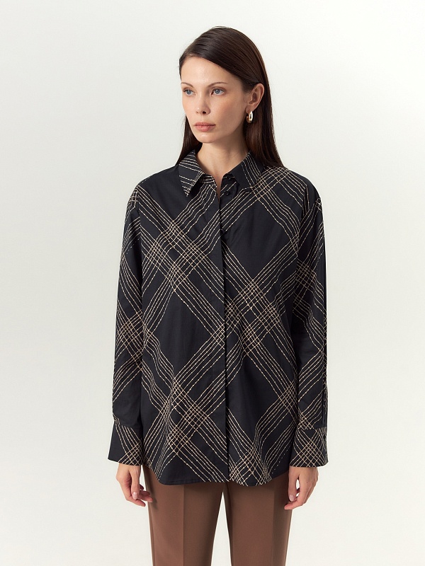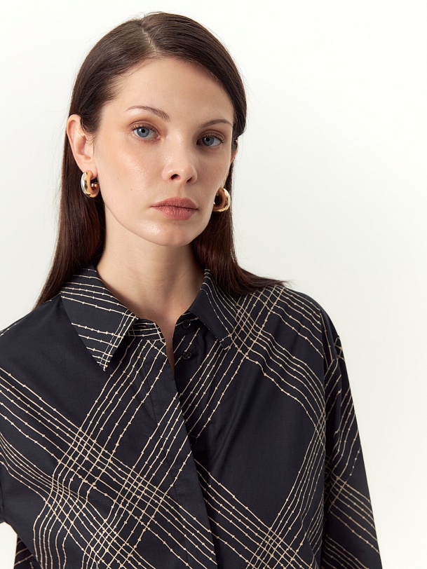 Прямая хлопковая принтованная блуза с классическим отложным воротником и потайной планке, рукав втачной со спущенной линией плеча на широком манжете. На спинке складка от горловины.
