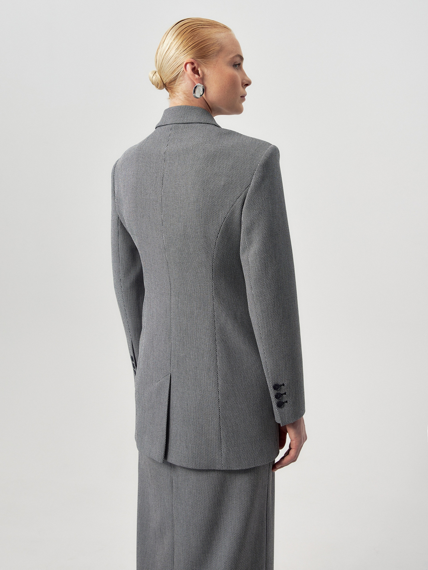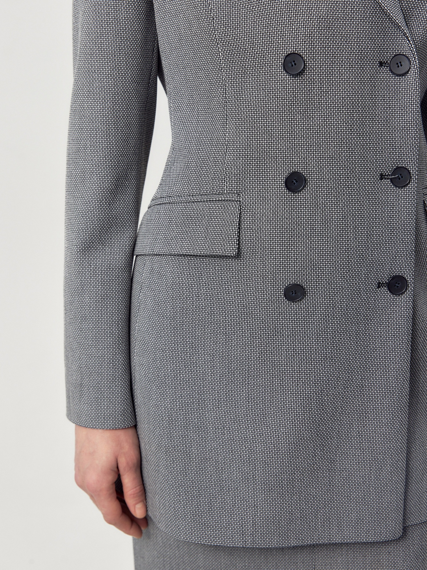 Полуприлегающий удлиненный двубортный жакет из костюмной ткани с переплетением рогожка. Жакет с английским воротником и V-образным вырезом, на полочке прорезные карманы листочки с клапанами. На спинке шлица, рукав классический втачной.