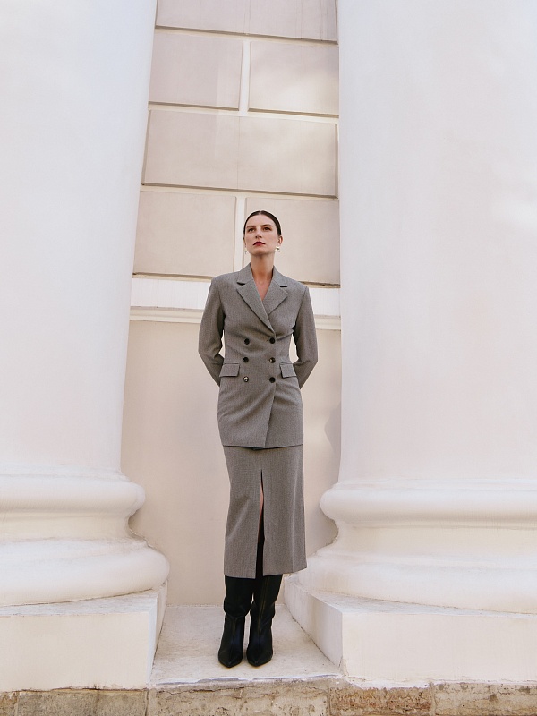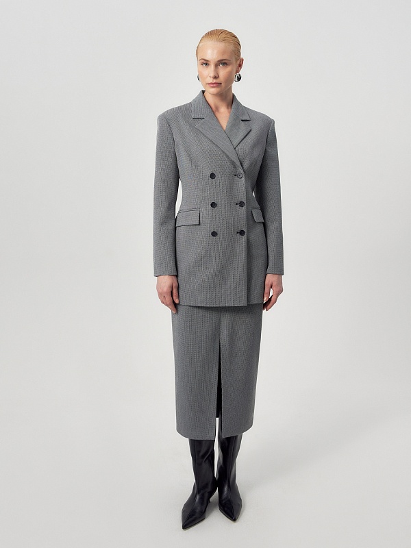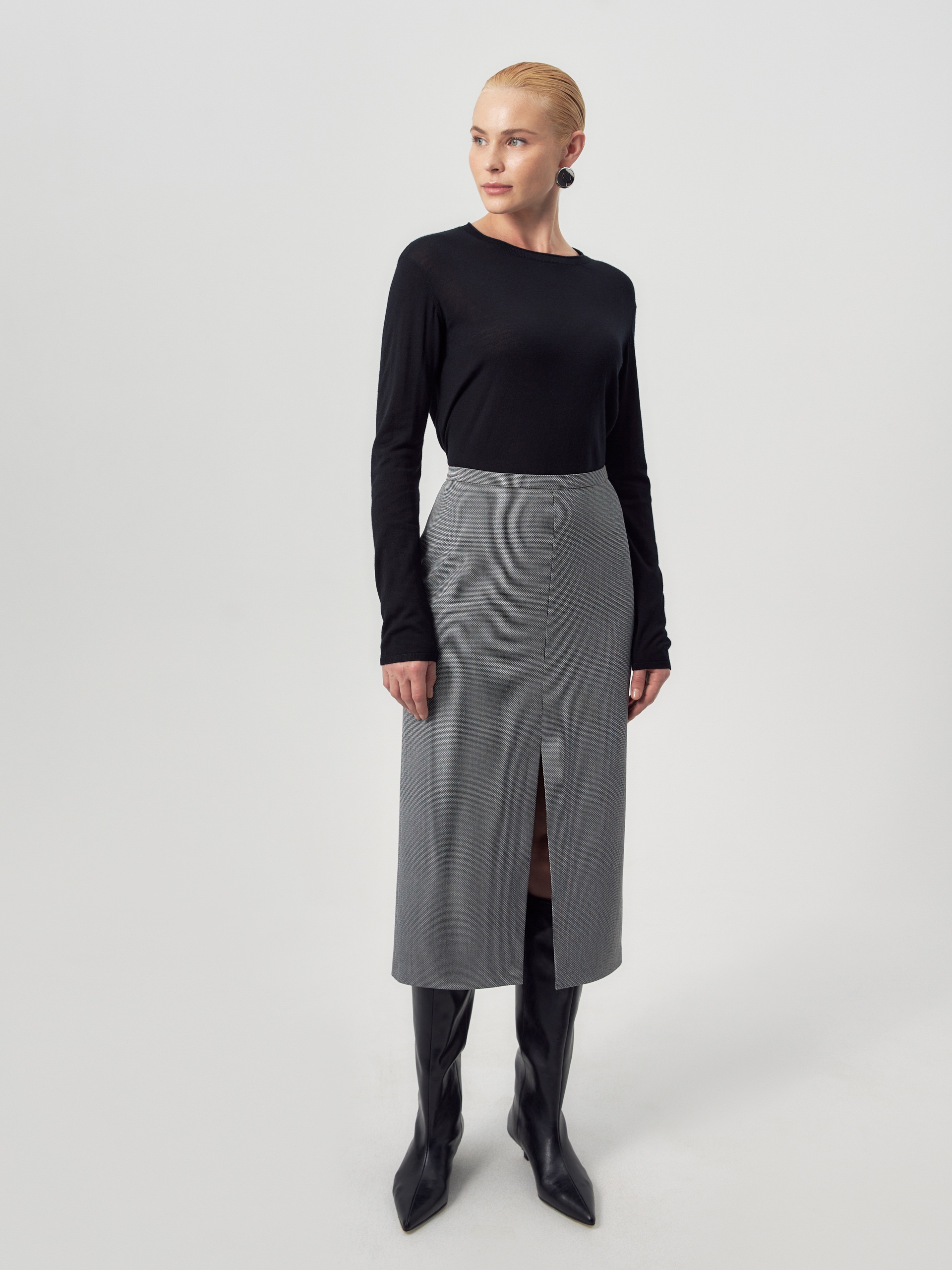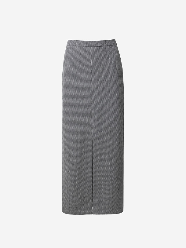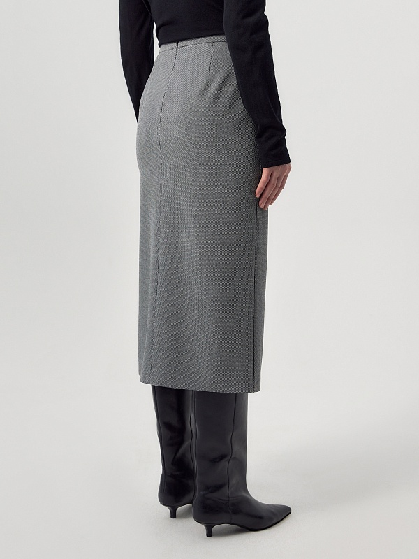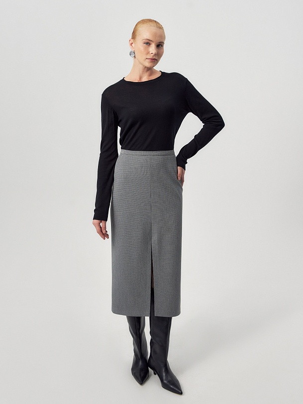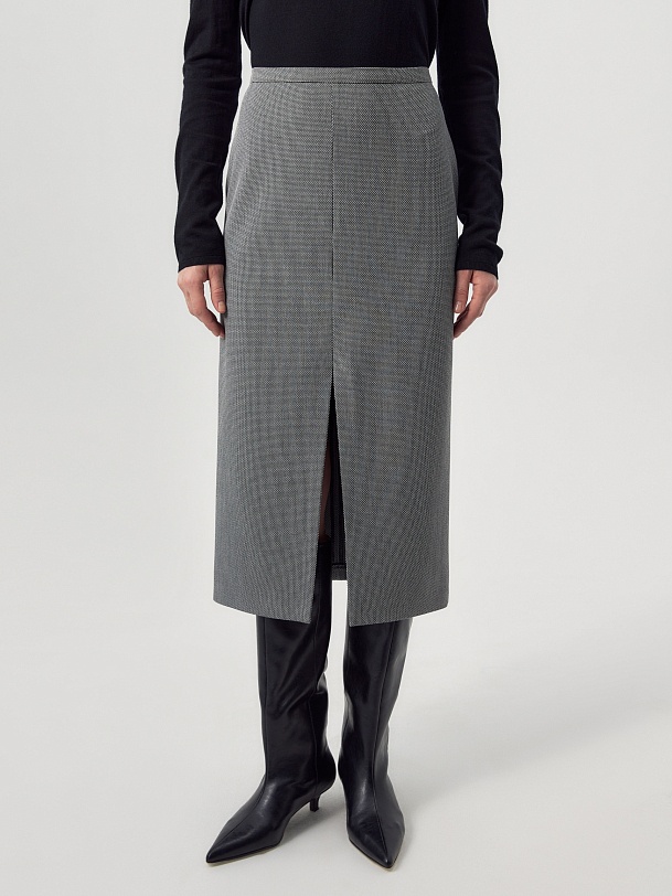 Прямая юбка из костюмной ткани с разрезом спереди на небольшом подкройном поясе.