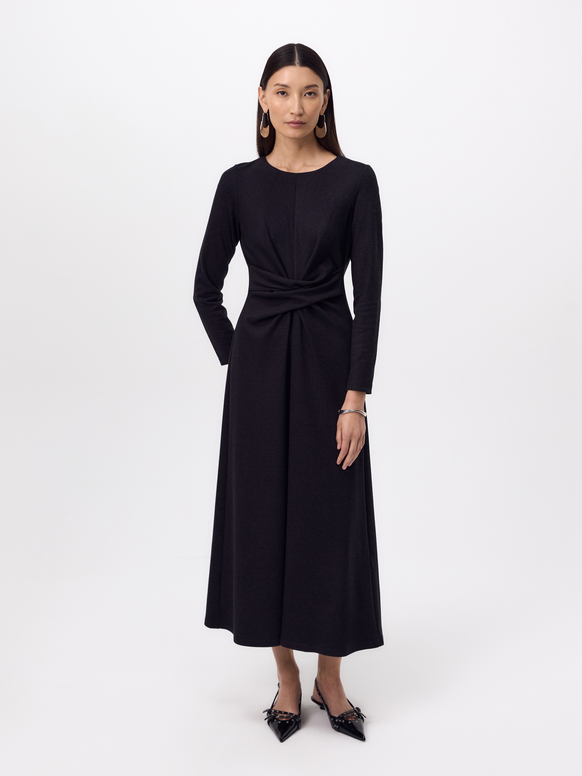 Трикотажное полуприлегающие платье черного цвета с круглой горловиной, втачным рукавом и драпировкой по линии талии. Юбка по низу немного расклешенная.