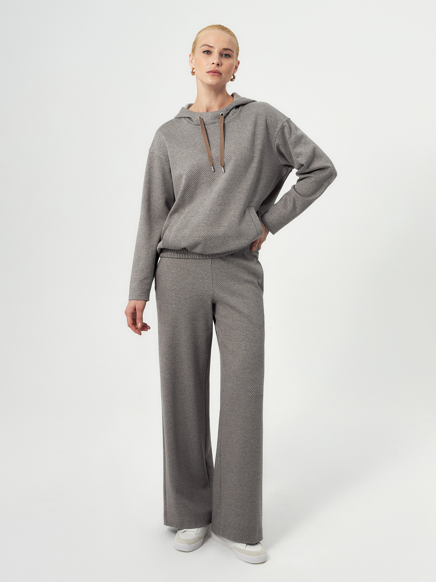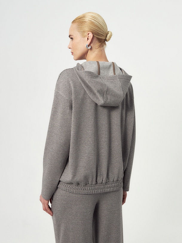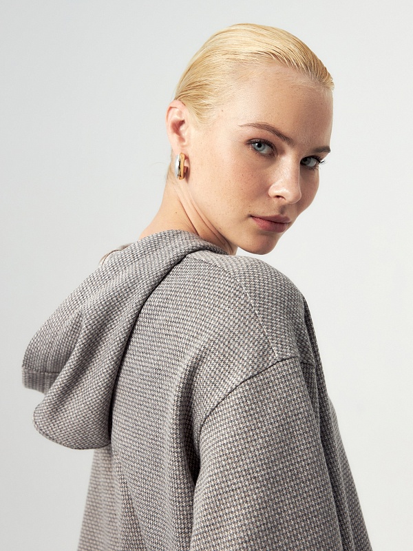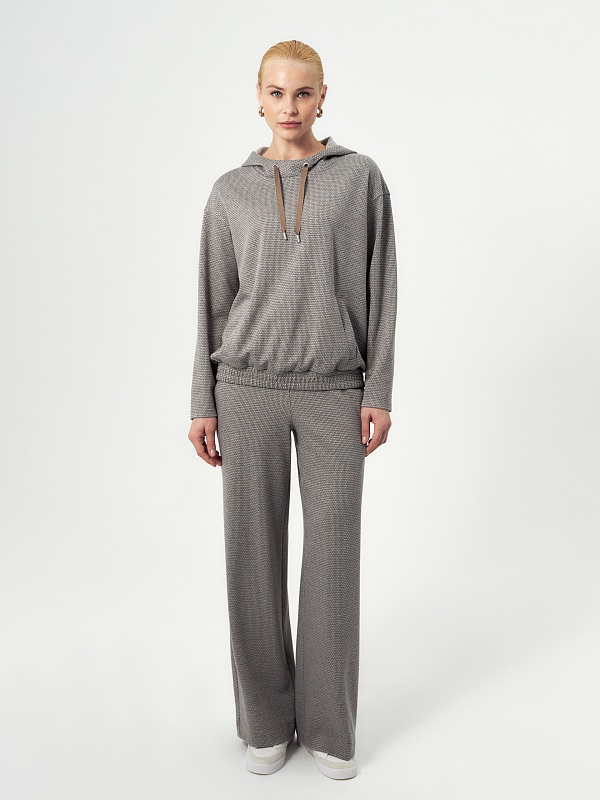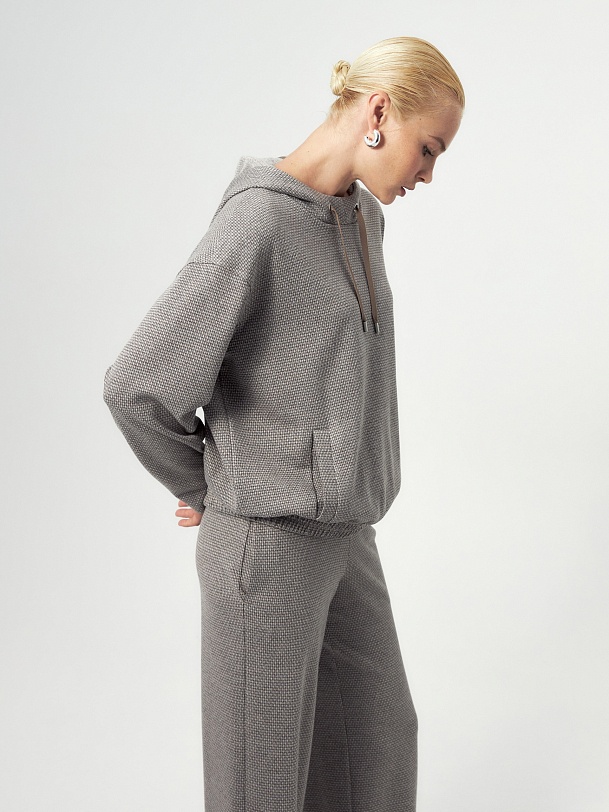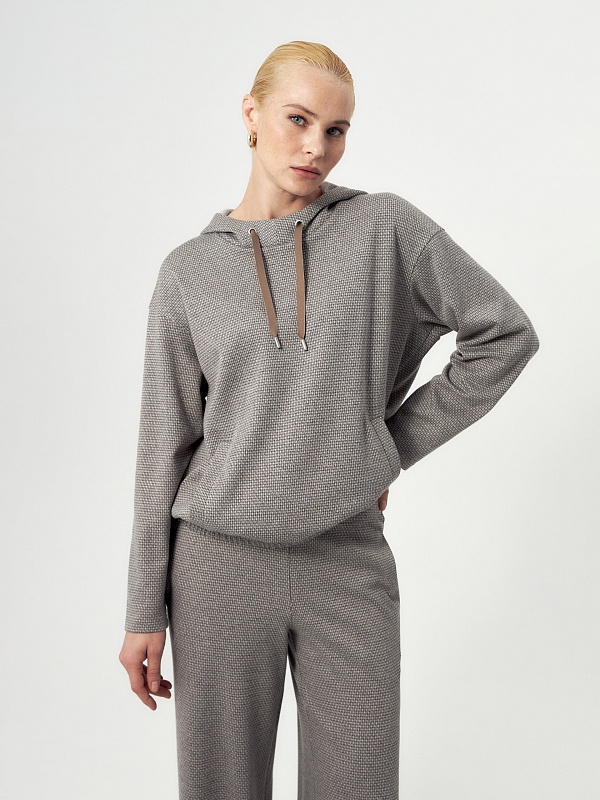Толстовка из мягкого жаккардового трикотажа в принте пье-де-пуль составит пару брюкам из такой же ткани или же черным низам, будь то классика или же джинсы