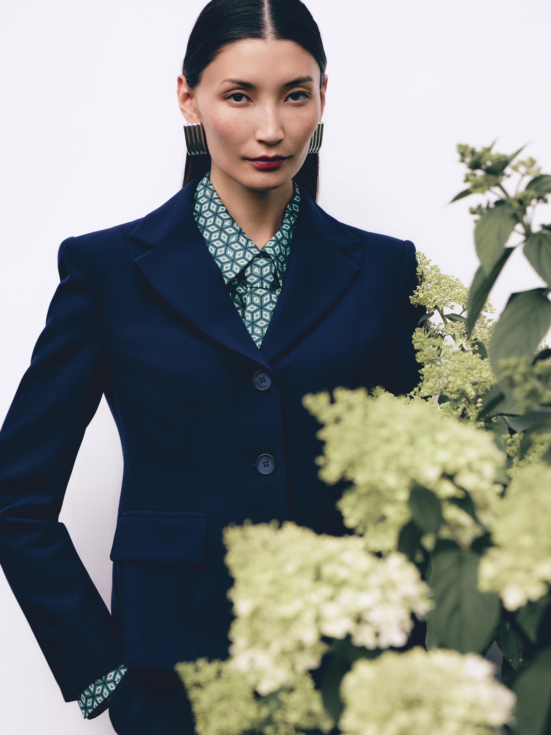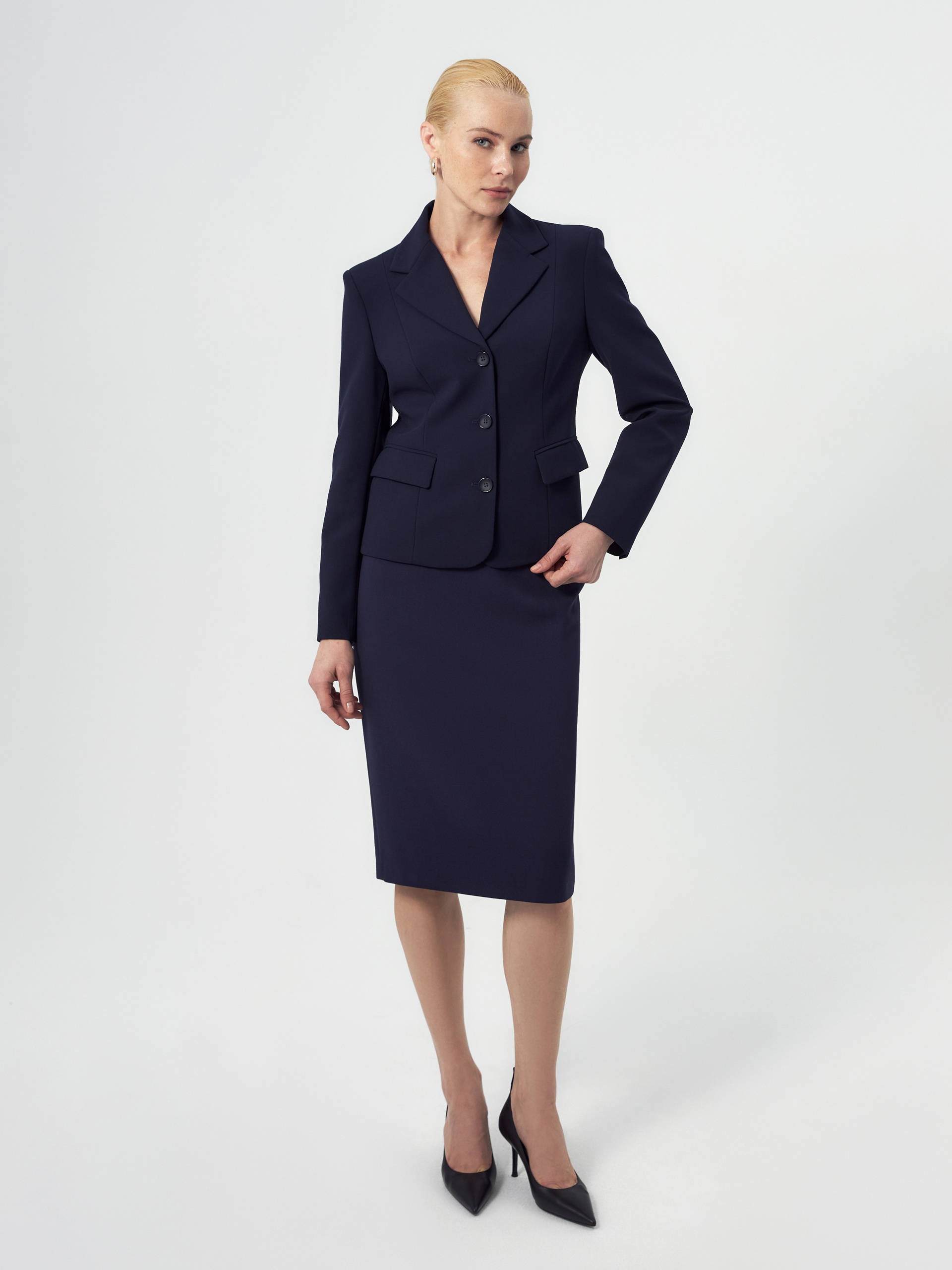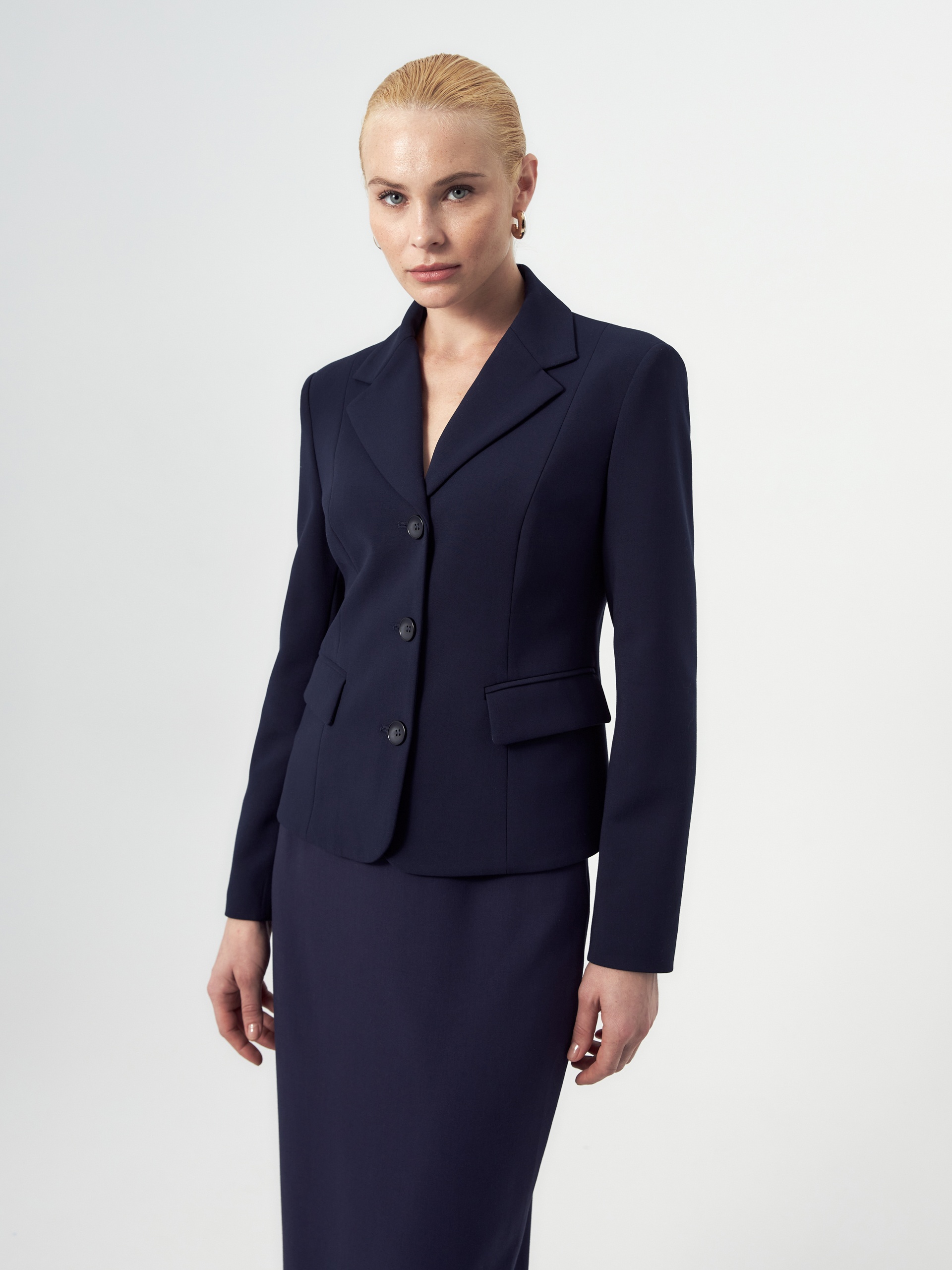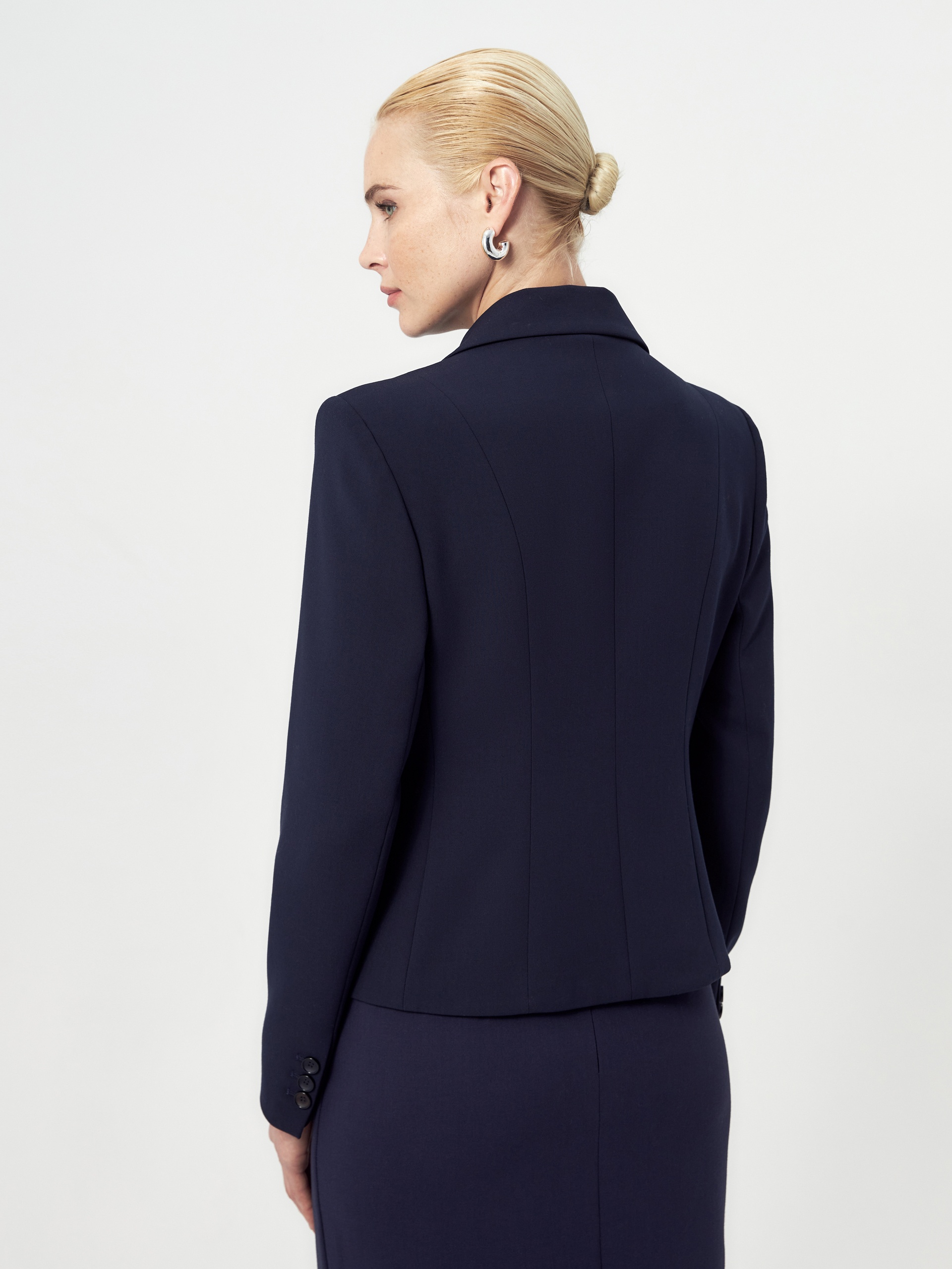 Приталенный укороченный однобортный жакет с небольшим английским воротником на трех пуговицах. Жакет с рельефами от плеча. Спереди прорезной карман и клапан. Рукава полной длины. Жакет на подкладке.