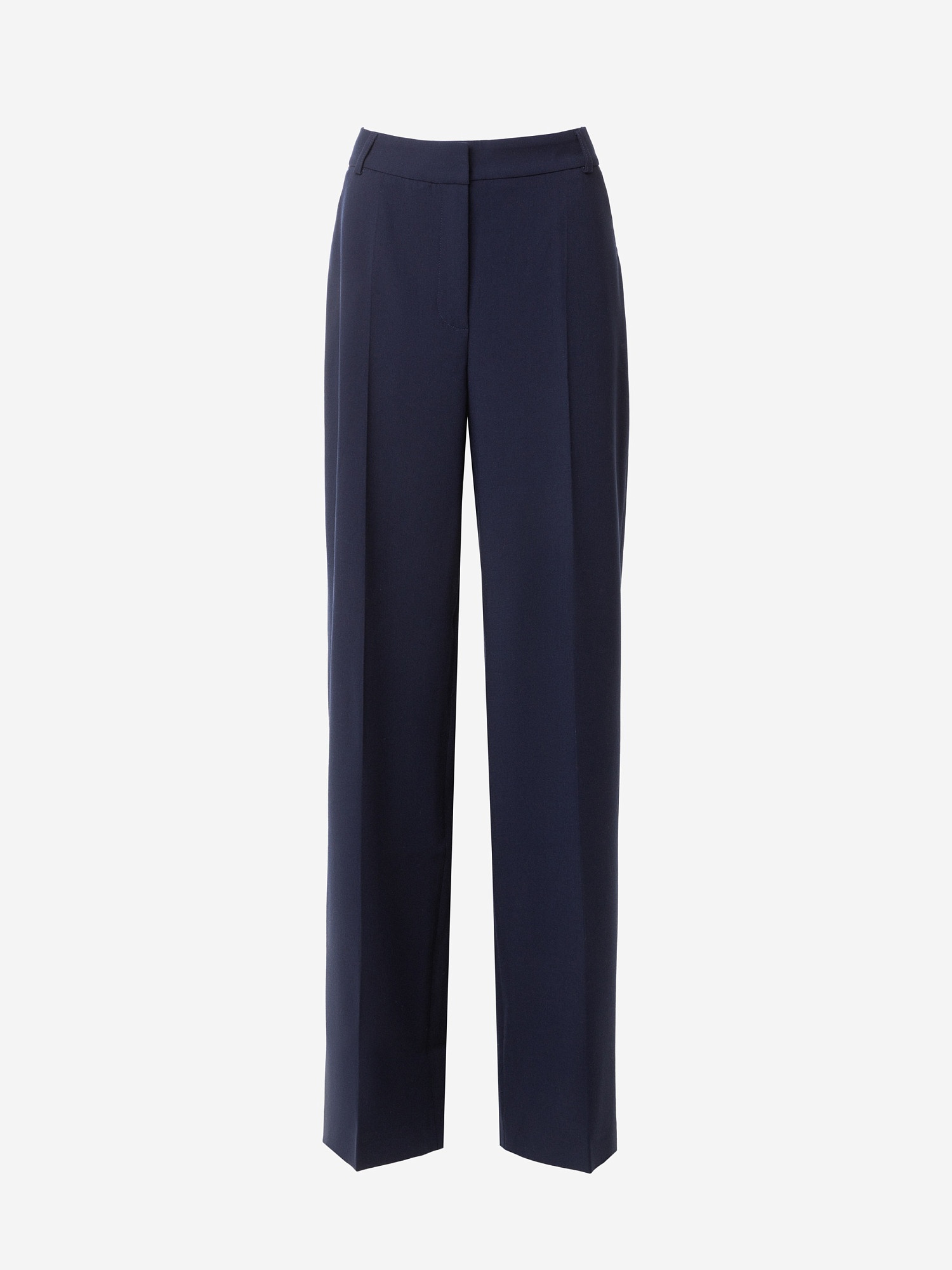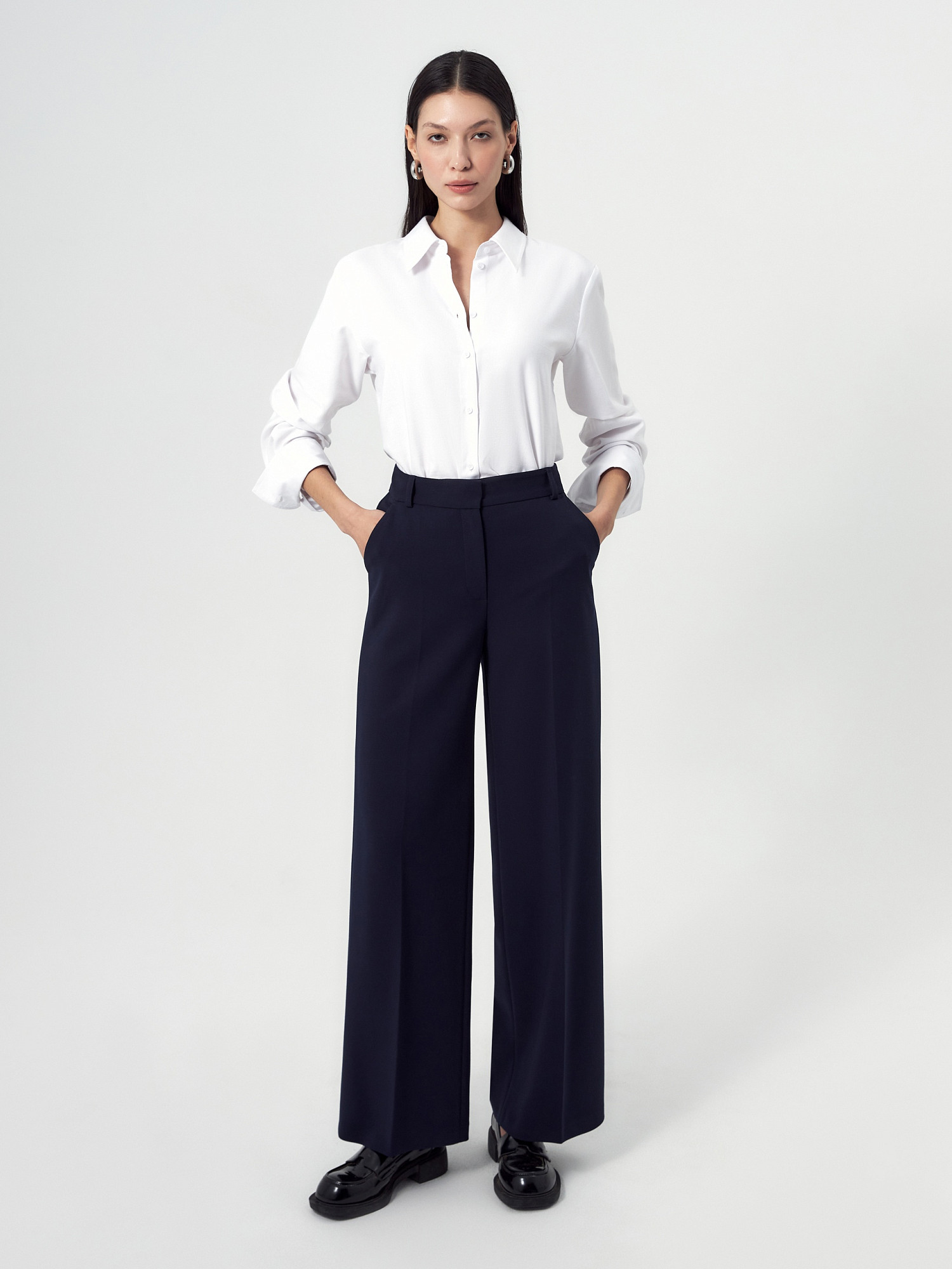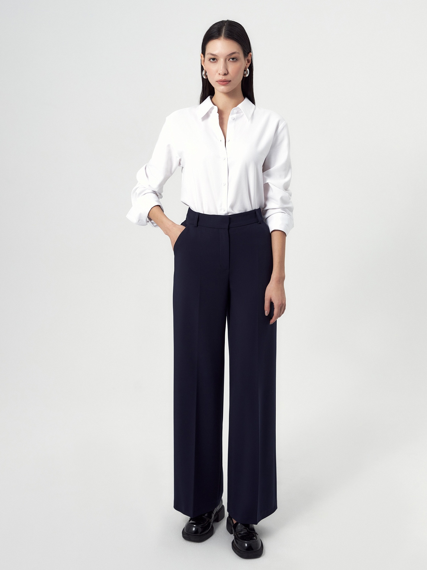Прямые брюки свободного силуэта из костюмной вискозной ткани темно-синего цвета. Имеют два функциональных кармана по бокам и два прорезных кармана сзади. Брюки идеально сочетаются с жакетом из одной ткани.