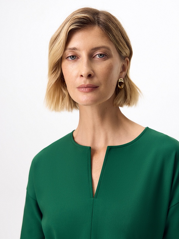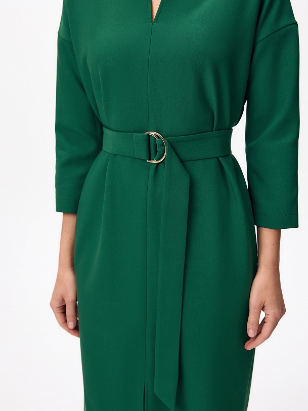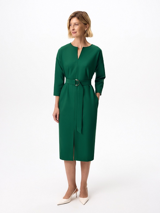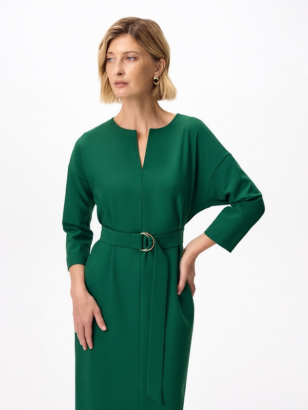 Прямое платье со спущенной линией плеча и рукавом 7/8 с круглой горловиной и небольшим вырезом по переду, в боковых швах потайные карманы. По переду есть разрез для комфортной носки изделия. В комплект входит пояс из основной ткани с полукольцами.