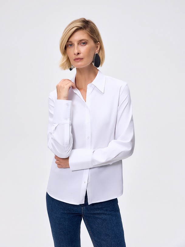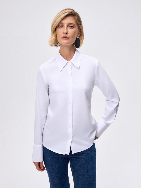 Полуприлегающая блуза из смесовой вискозной ткани с классическим отложным воротником, спущенной линией плеча, с высоким манжетом и фигурной линией низа.