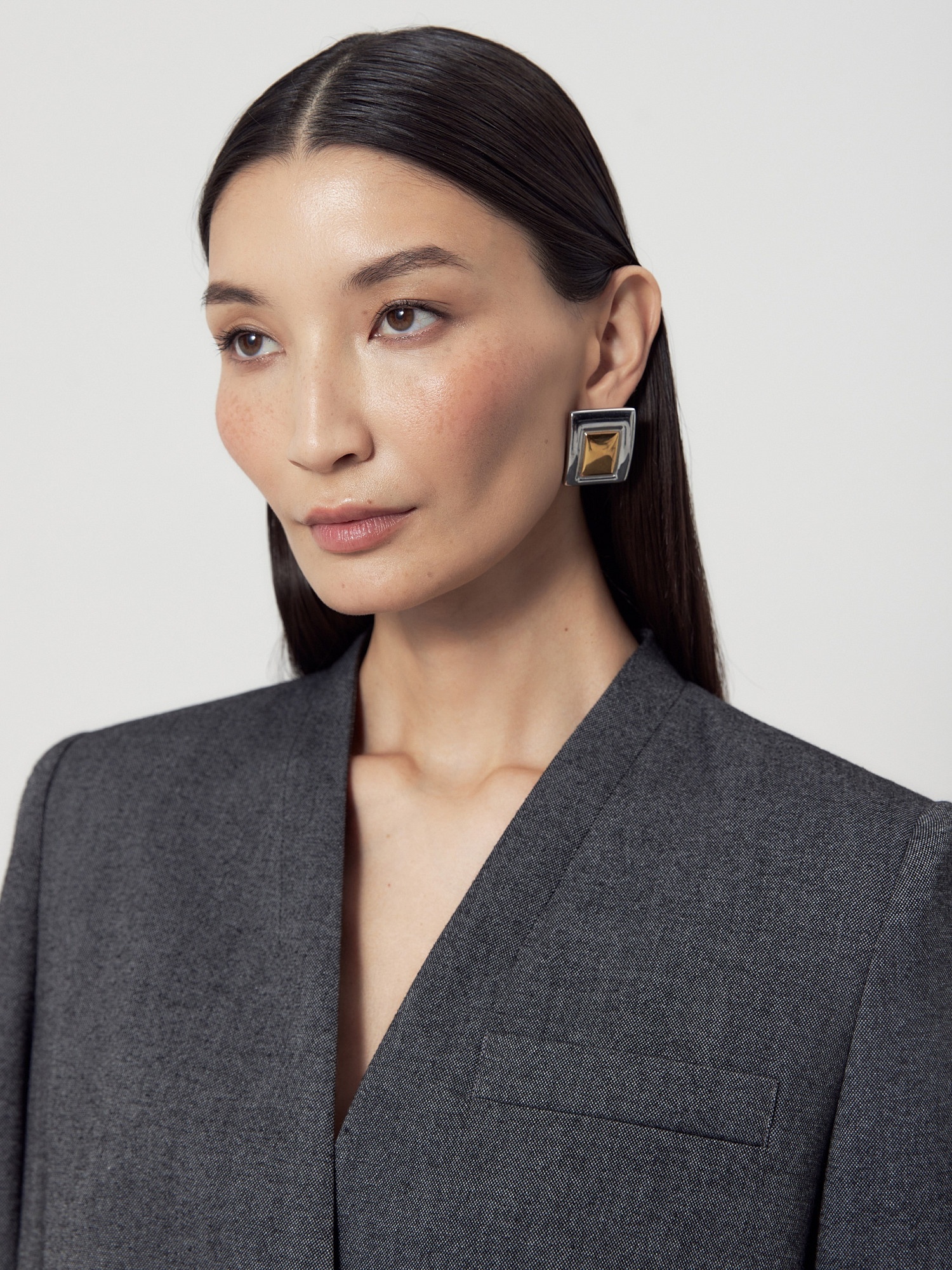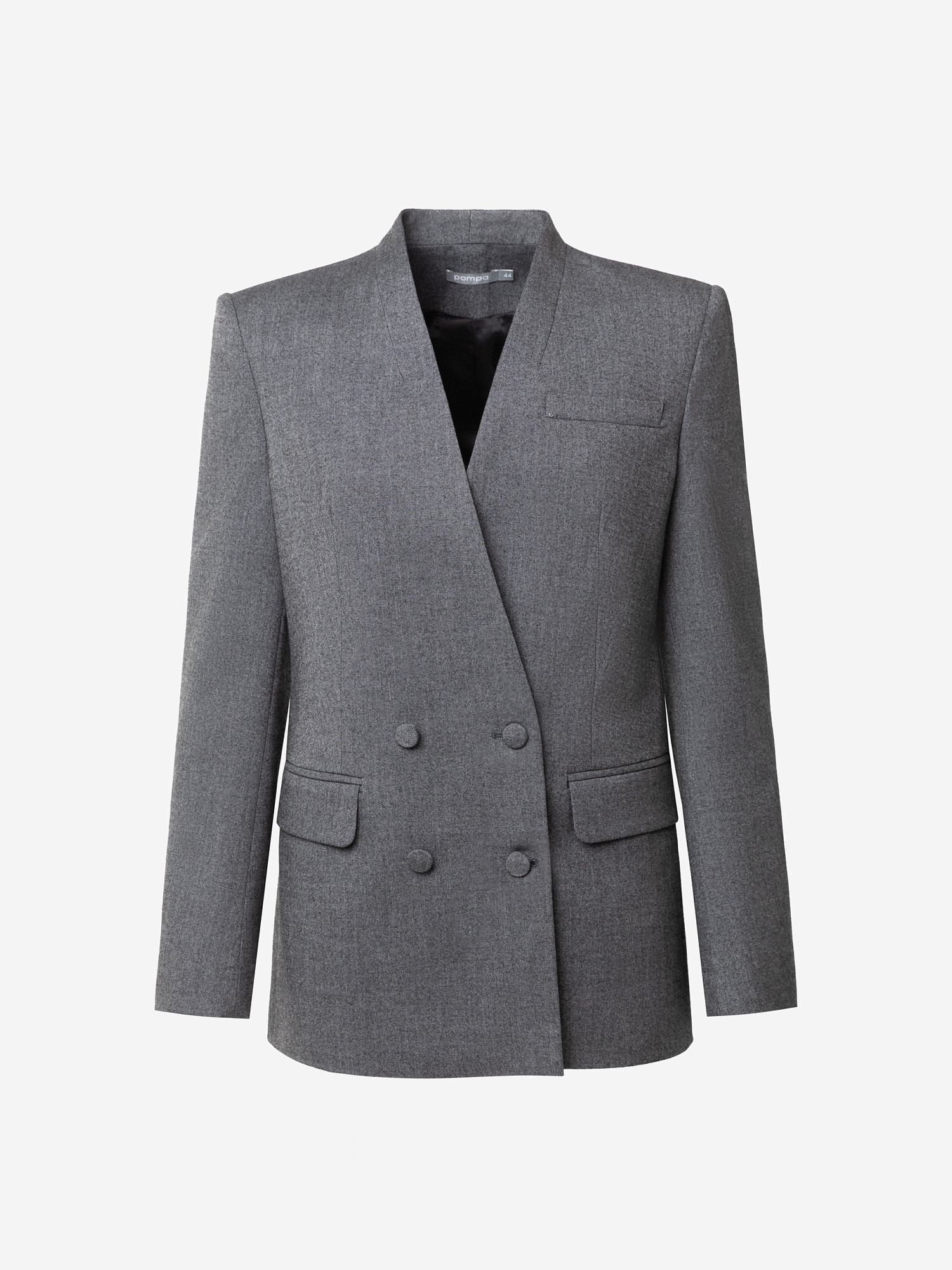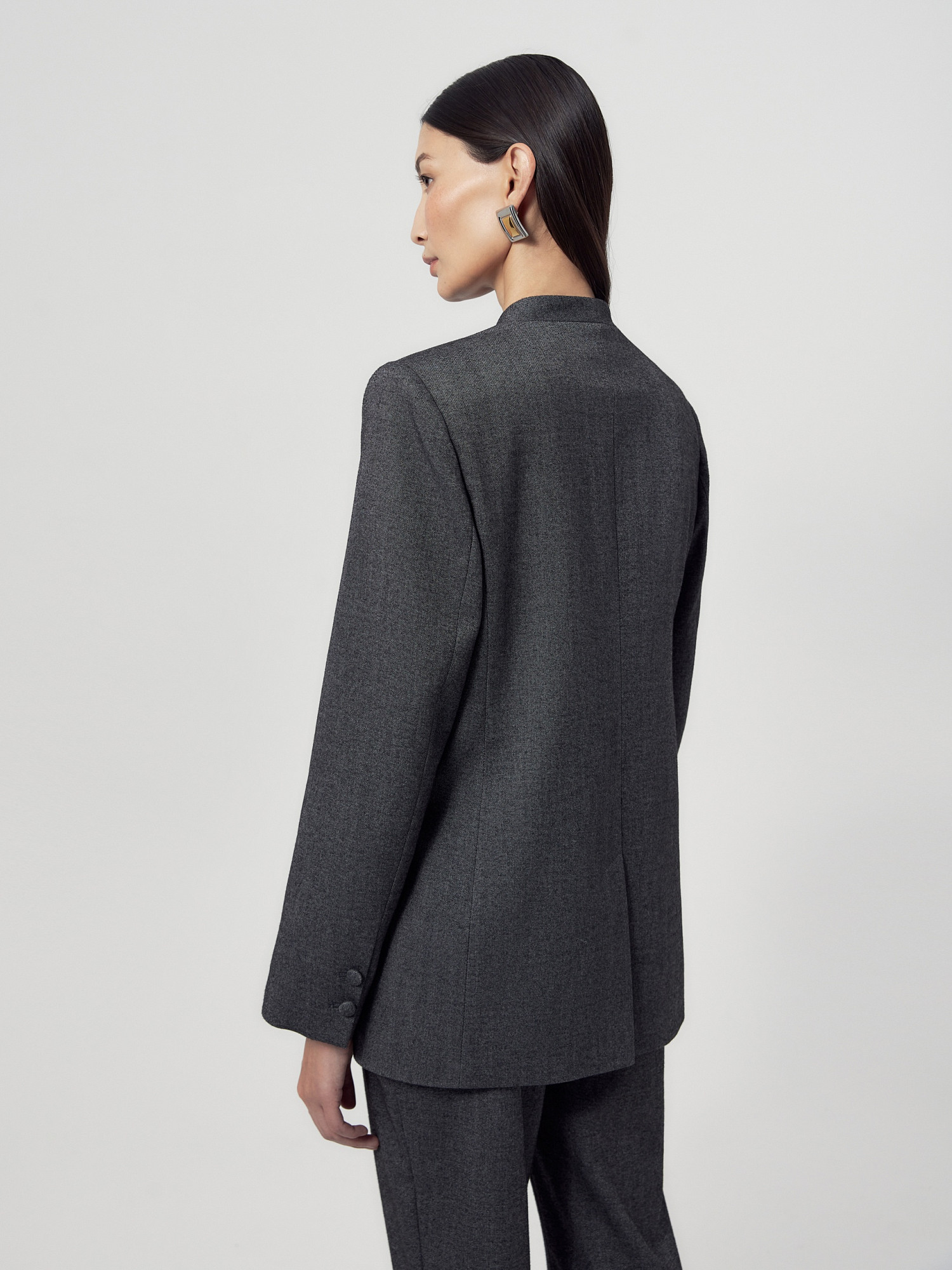 Двубортный жакет прямого силуэта из фактурной костюмной ткани с цельнокроеным воротником и V-образным вырезом, прорезными карманами с клапанами и листочкой на груди. Рукав классический втачной полной длины, на спинке шлица. Жакет на подкладке.
